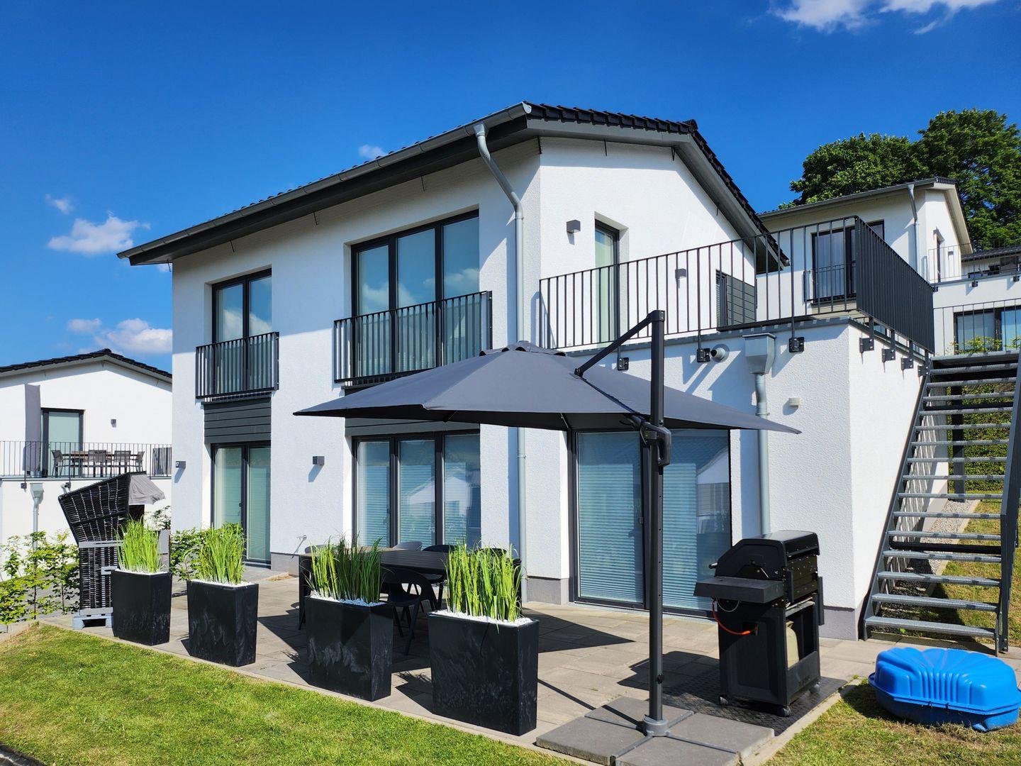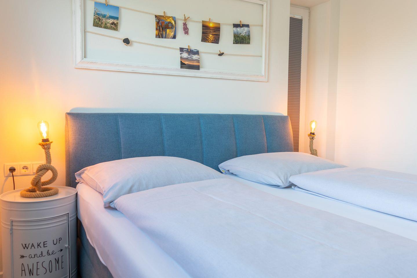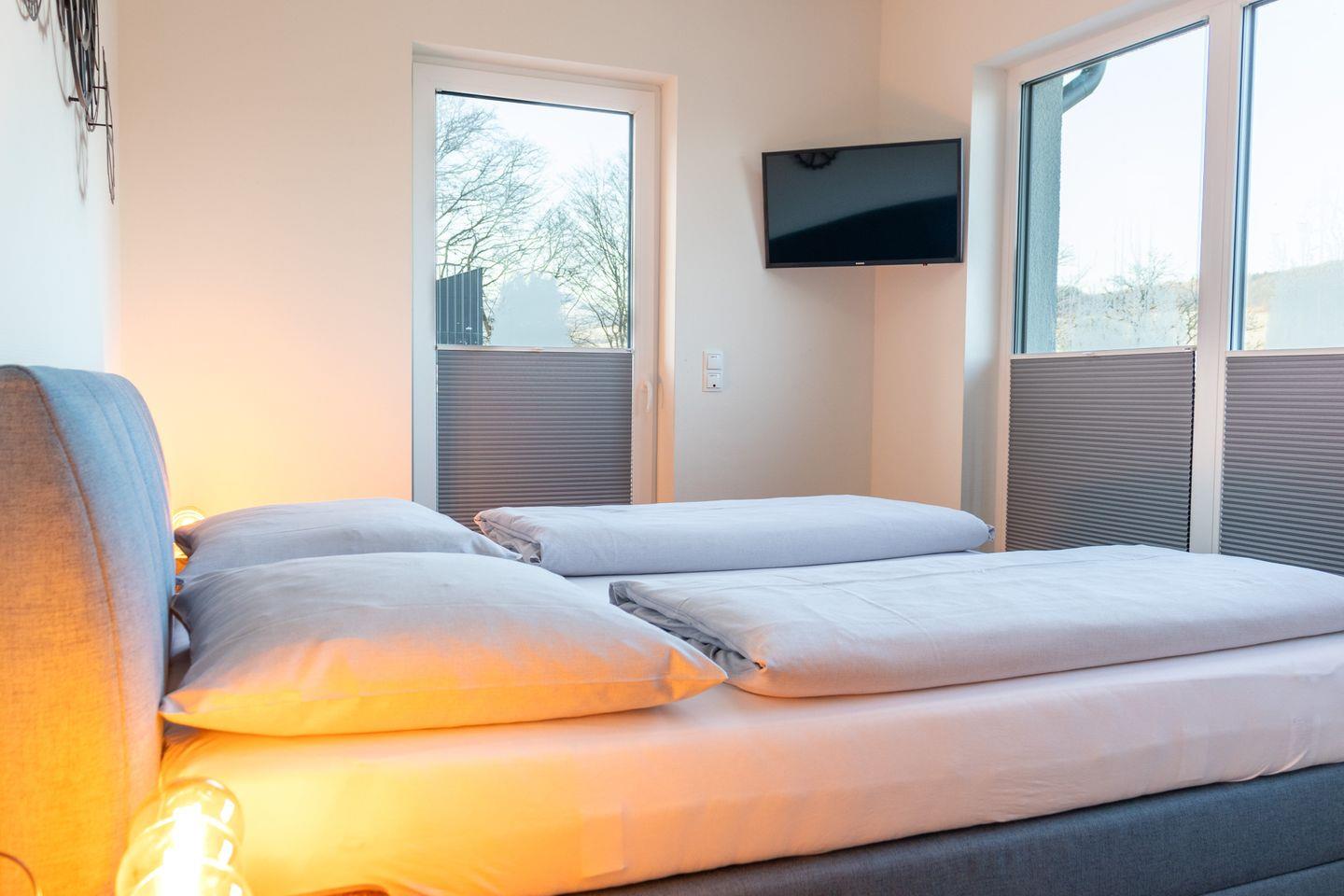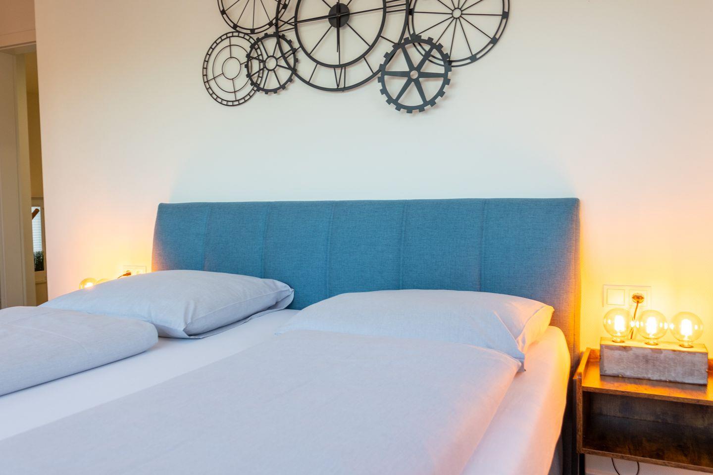 Im Obergeschoss erwarten dich zwei weitere Schlafzimmer – ebenfalls mit Boxspringbetten, TV (Magenta TV) und viel Ruhe. Eines der Zimmer bietet direkten Zugang zur großzügigen Dachterrasse mit traumhaftem Seeblick – perfekt für den ersten Kaffee am Morgen oder ein Glas Wein am Abend.