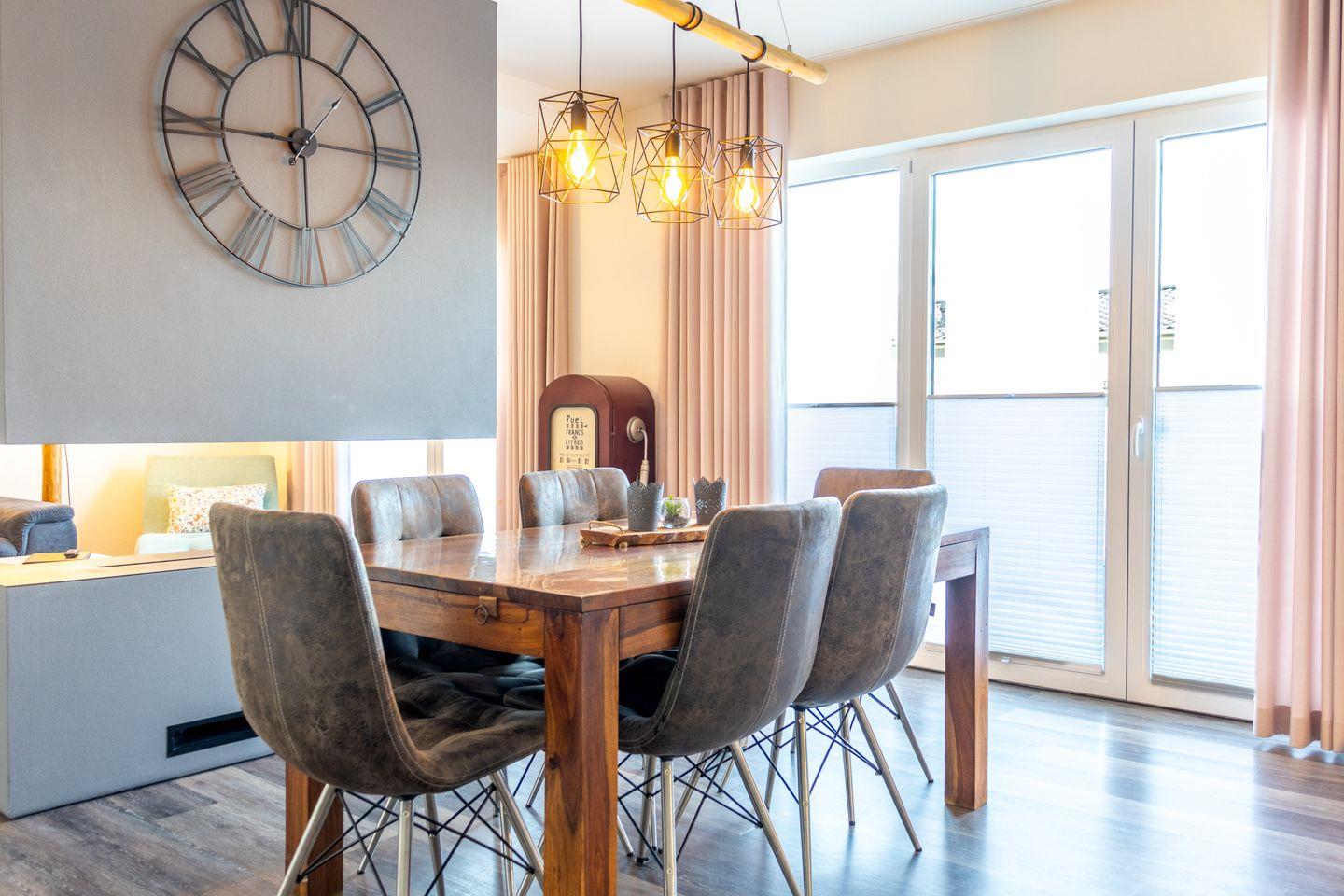 Im Wohnbereich im Erdgeschoss erwartet dich eine warme Atmosphäre mit Elektrokamin, großer Couch und offener Wohnküche. Moderne Geräte wie Spülmaschine, Backofen, Mikrowelle und Kaffeevollautomat lassen keine Wünsche offen. Vom Wohnraum aus geht es direkt auf die möblierte Terrasse mit Gasgrill – ideal für laue Abende am See.