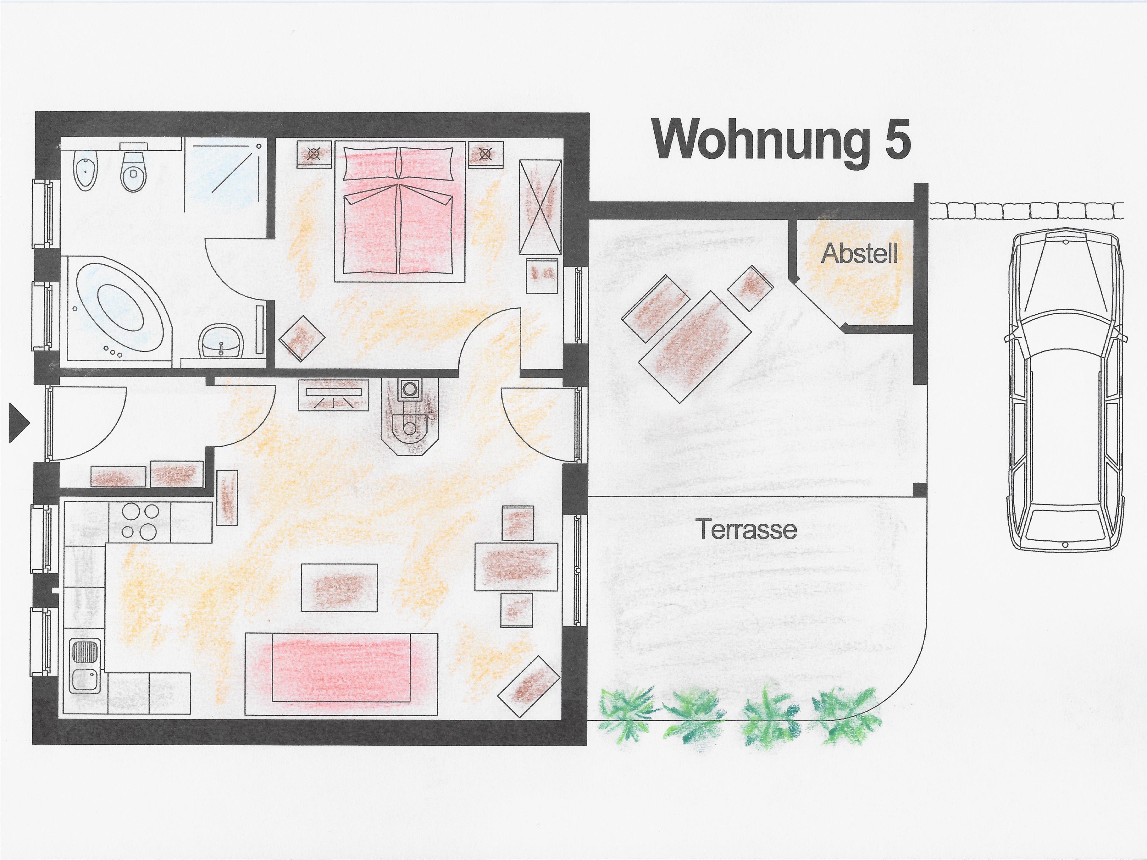 Unsere Ferienwohnung 5 bietet mit ihren 65m2 viel Platz für 2 Erwachsene.