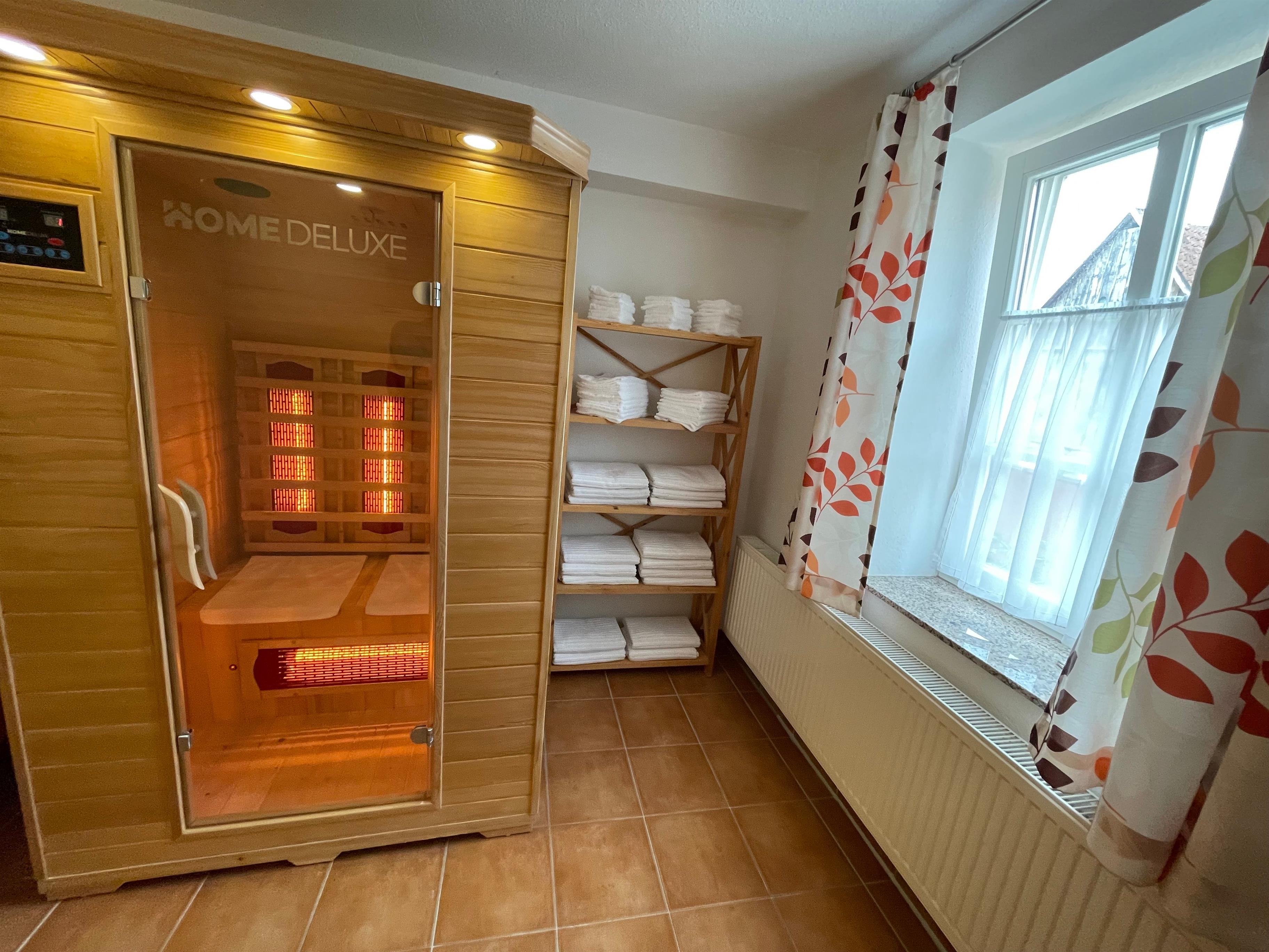 Unser Wellness-Center mit InfraRot-Wärmekabine (Niedertemperatur-Sauna) und hhp-Massageliegen steht den Gästen unserer Luxus-Ferienwohnungen (jede mit eigenem Whirlpool und Kamin) kostenfrei zur Verfügung.