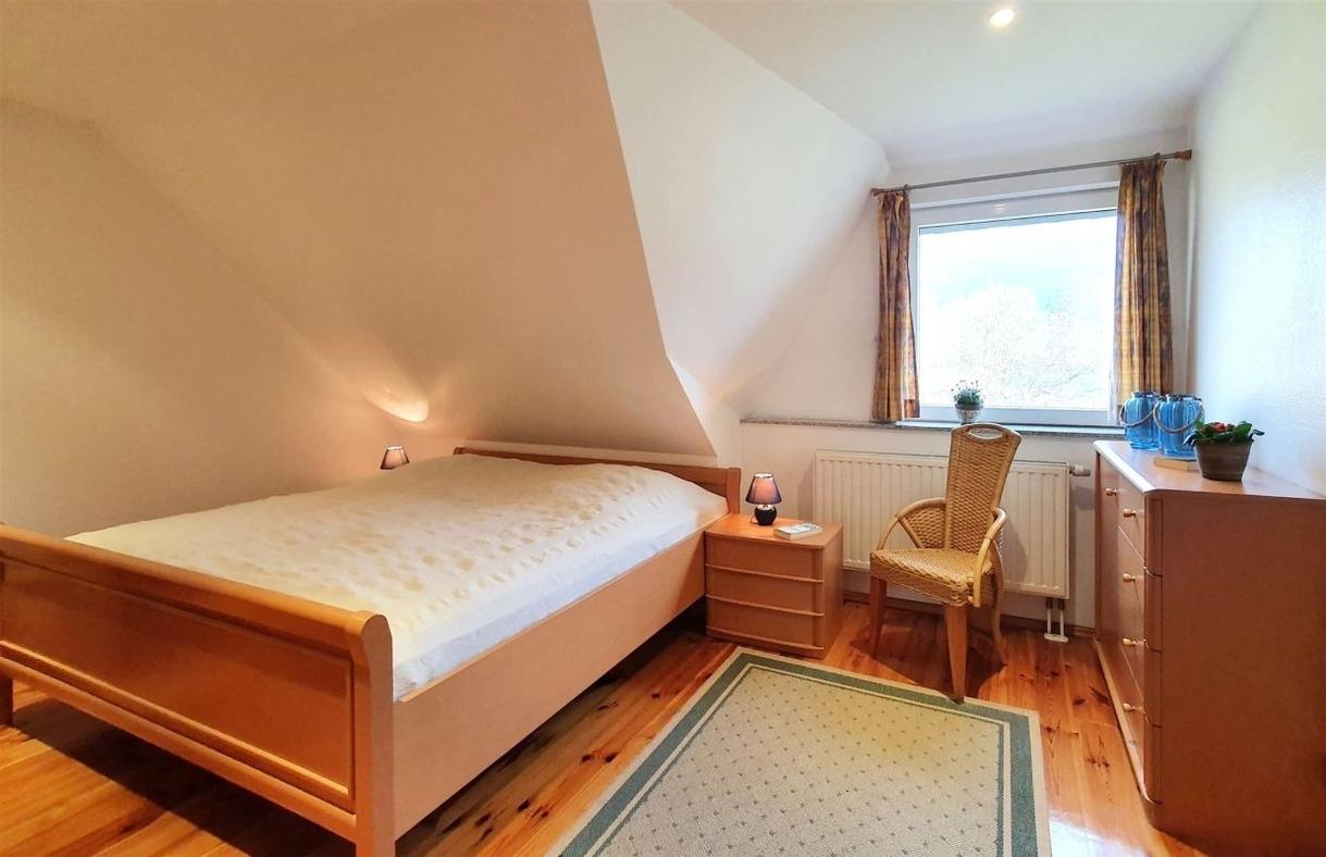 Im Obergeschoß befinden sich zwei Schlafzimmer, eines mit einem großen Doppelbett, Kleiderschrank und einem Fenster mit Seeblick. Das zweite, kleine Schlafzimmer hat ein Bett mit 1,2 Metern Breite, geeignet für einen Großen oder zwei kleine Menschen, die sich mögen.
