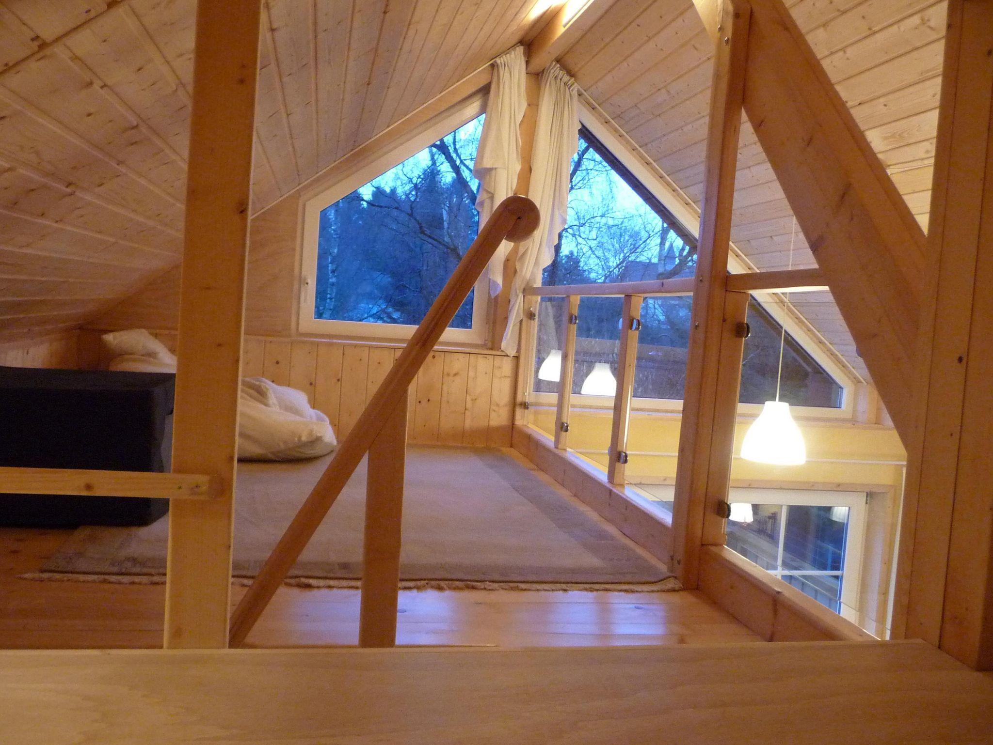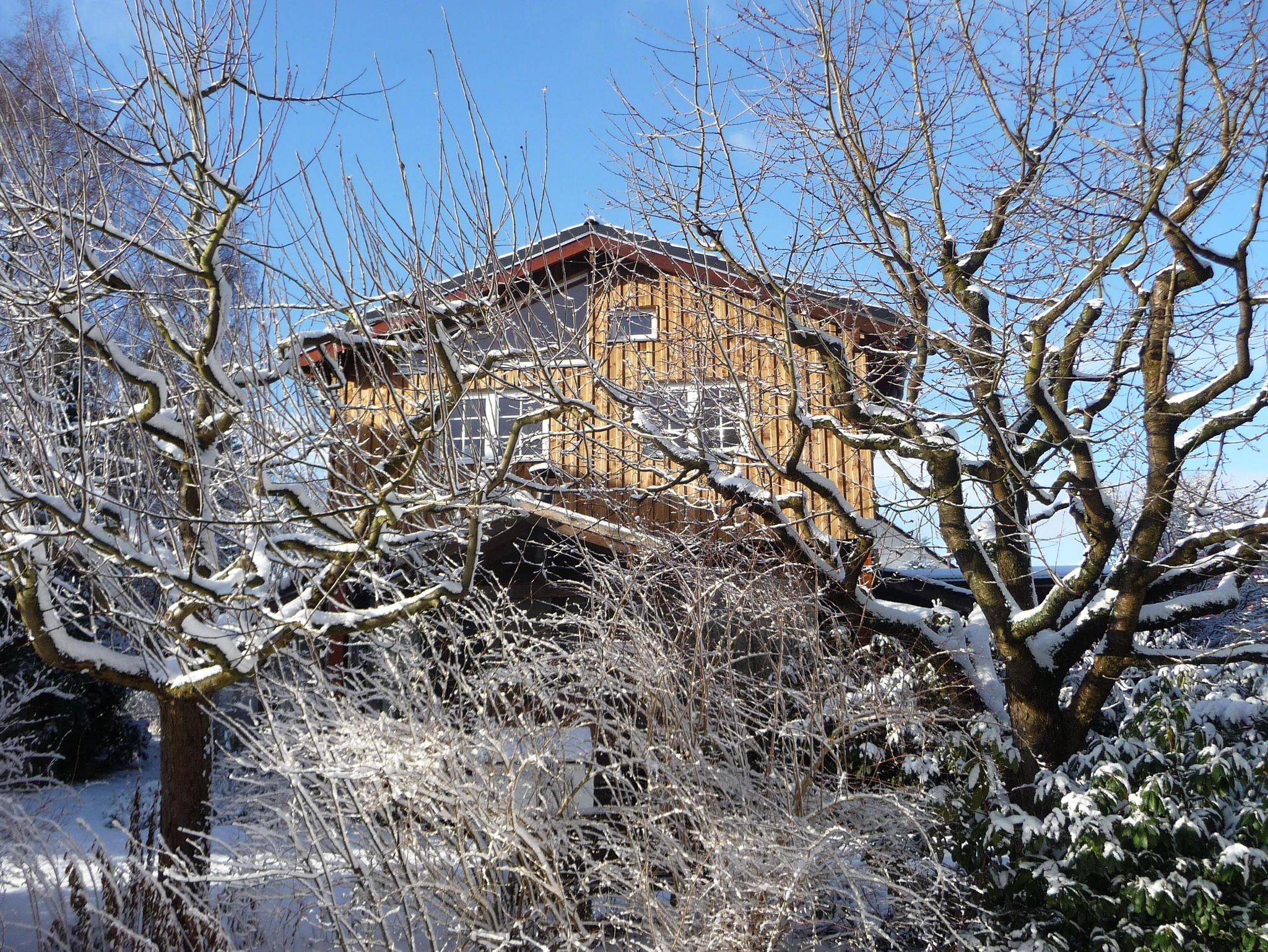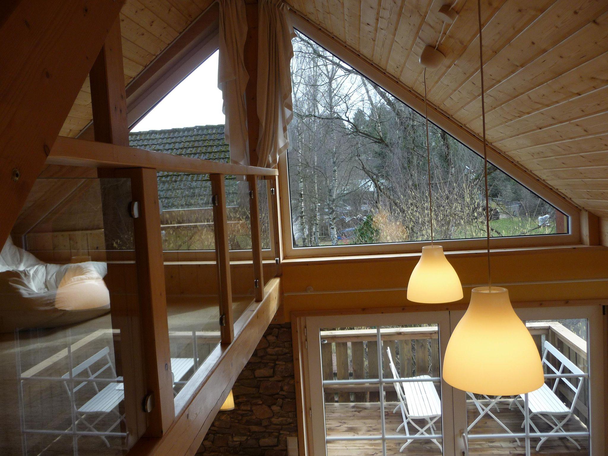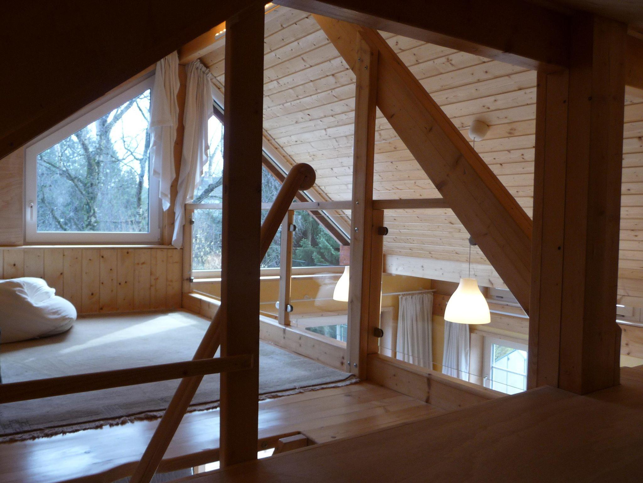 Das moderne, gemütliche Ferienhaus in Holzbauweise liegt im Herzen des Westerwaldes 2km vom Mittelzentrum Dierdorf entfernt und verkehrsgünstig zur 7 km entfernten Autobahn A3. Das 2017 fertiggestellte Ferienhaus auf 90 Quadratmetern thront, auf dicken Holzpfeilern gebaut, hoch über dem Garten. Mit viel Holz außen und innen strahlt das lichtdurchflutete Haus Wärme und Behaglichkeit aus. In der großzügigen und offenen Bauweise kann man sich mit bis zu acht Personen bequem aufhalten, aber dennoch bleiben Rückzugsmöglichkeiten hinter der Wohntheke, auf der Empore oder der Koje überm Wohnzimmer, die man über eine keine Holztreppe erreicht. Das separarte Schlafzimmer bietet ohnehin Entspannungsmöglichkeiten, da es zur Gartenseite und völlig ruhig gelegen ist. In der Wohnküche ist viel Platz zum Kochen. Der große Esstisch lässt sich auf drei Meter Länge ausziehen. Der neun Quadratmeter große Balkon ist nach Süden ausgerichtet und bietet durch die Holzverkleidung der Brüstung entsprechenden Sichtschutz. Dennoch schaut man auf das Grün des Gartens. Im Winter wärmt die Sonne das Haus über die lange Südseite mit den großen Fenstern. Im heißen Sommer spenden die umstehenden Bäume den nötigen Schatten. Kurzum: Im Sommer sind die Räume kühl und durchlüftet, im Winter behaglich warm. Wir betreiben eine kleine Imkerei und Süßmosterei, wovon zwei Bienenstöcke im Garten stehen zur Bestäubung unserer Obstbäume. Den Honig und den Apfelsaft von westerwälder Streuobstwiesen können Sie bei uns immer frisch erwerben.