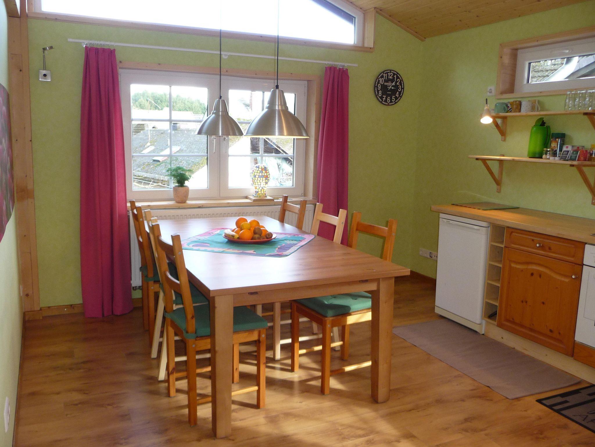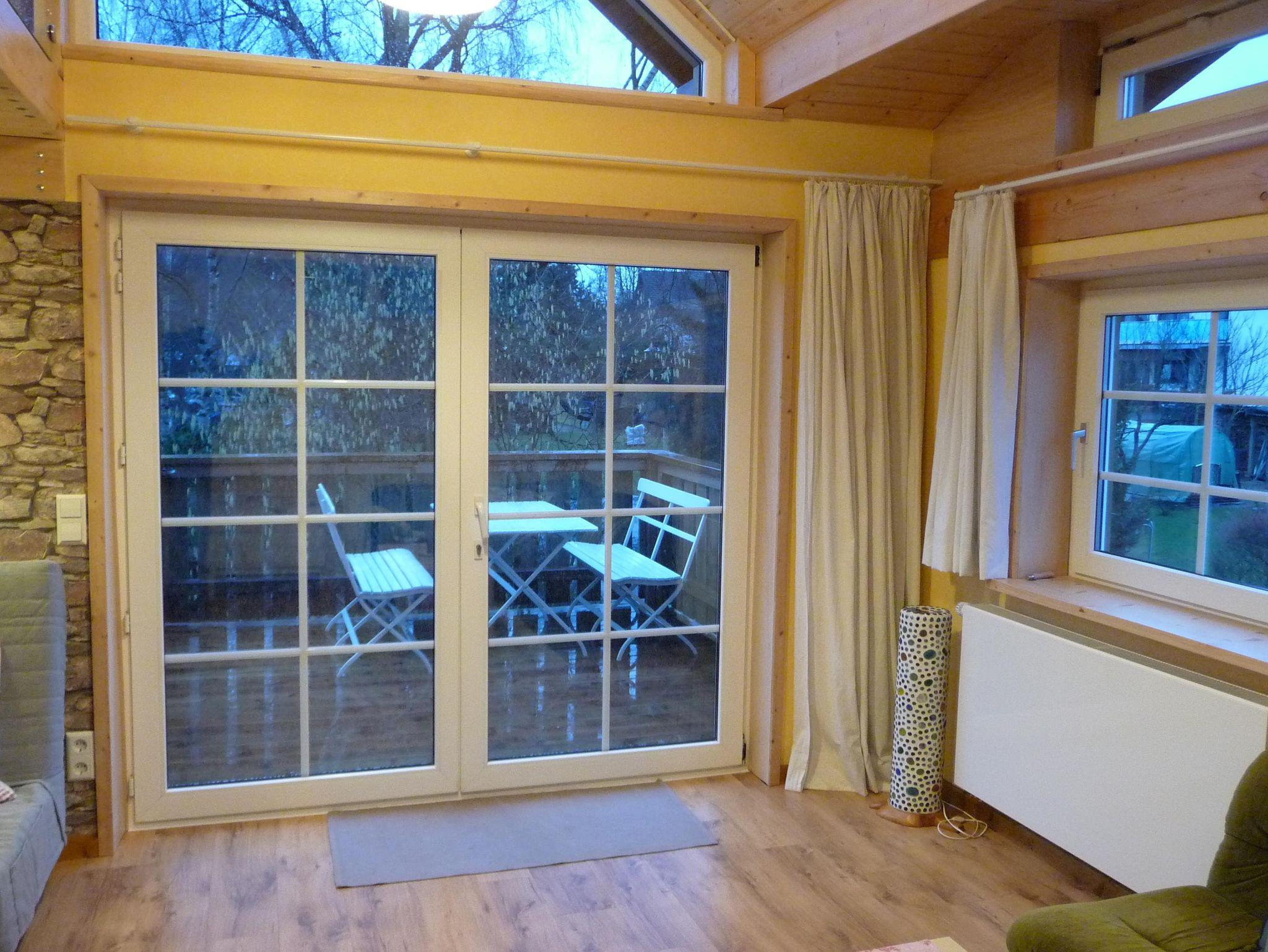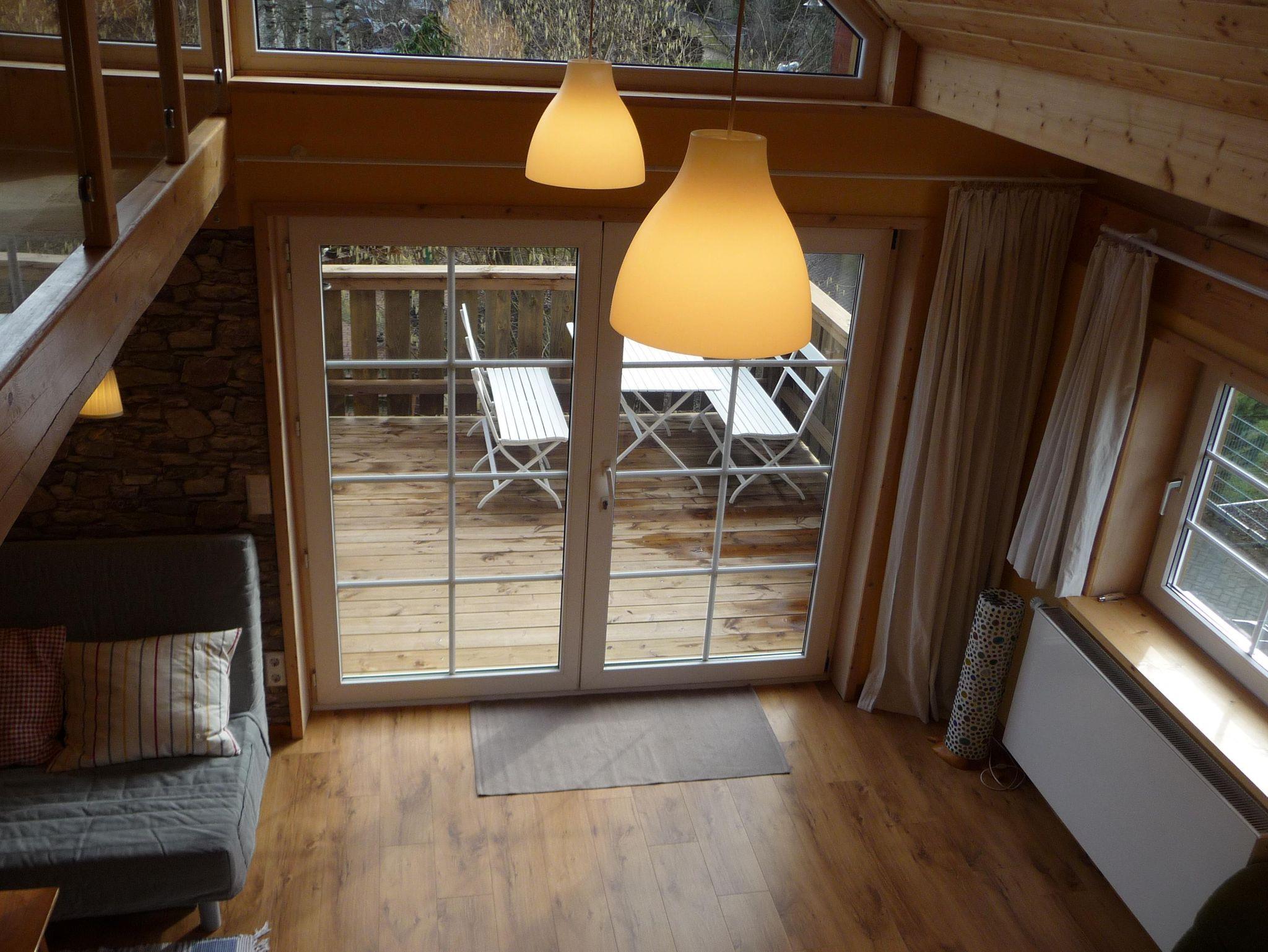 Das moderne, gemütliche Ferienhaus in Holzbauweise liegt im Herzen des Westerwaldes 2km vom Mittelzentrum Dierdorf entfernt und verkehrsgünstig zur 7 km entfernten Autobahn A3. Das 2017 fertiggestellte Ferienhaus auf 90 Quadratmetern thront, auf dicken Holzpfeilern gebaut, hoch über dem Garten. Mit viel Holz außen und innen strahlt das lichtdurchflutete Haus Wärme und Behaglichkeit aus. In der großzügigen und offenen Bauweise kann man sich mit bis zu acht Personen bequem aufhalten, aber dennoch bleiben Rückzugsmöglichkeiten hinter der Wohntheke, auf der Empore oder der Koje überm Wohnzimmer, die man über eine keine Holztreppe erreicht. Das separarte Schlafzimmer bietet ohnehin Entspannungsmöglichkeiten, da es zur Gartenseite und völlig ruhig gelegen ist. In der Wohnküche ist viel Platz zum Kochen. Der große Esstisch lässt sich auf drei Meter Länge ausziehen. Der neun Quadratmeter große Balkon ist nach Süden ausgerichtet und bietet durch die Holzverkleidung der Brüstung entsprechenden Sichtschutz. Dennoch schaut man auf das Grün des Gartens. Im Winter wärmt die Sonne das Haus über die lange Südseite mit den großen Fenstern. Im heißen Sommer spenden die umstehenden Bäume den nötigen Schatten. Kurzum: Im Sommer sind die Räume kühl und durchlüftet, im Winter behaglich warm. Wir betreiben eine kleine Imkerei und Süßmosterei, wovon zwei Bienenstöcke im Garten stehen zur Bestäubung unserer Obstbäume. Den Honig und den Apfelsaft von westerwälder Streuobstwiesen können Sie bei uns immer frisch erwerben.