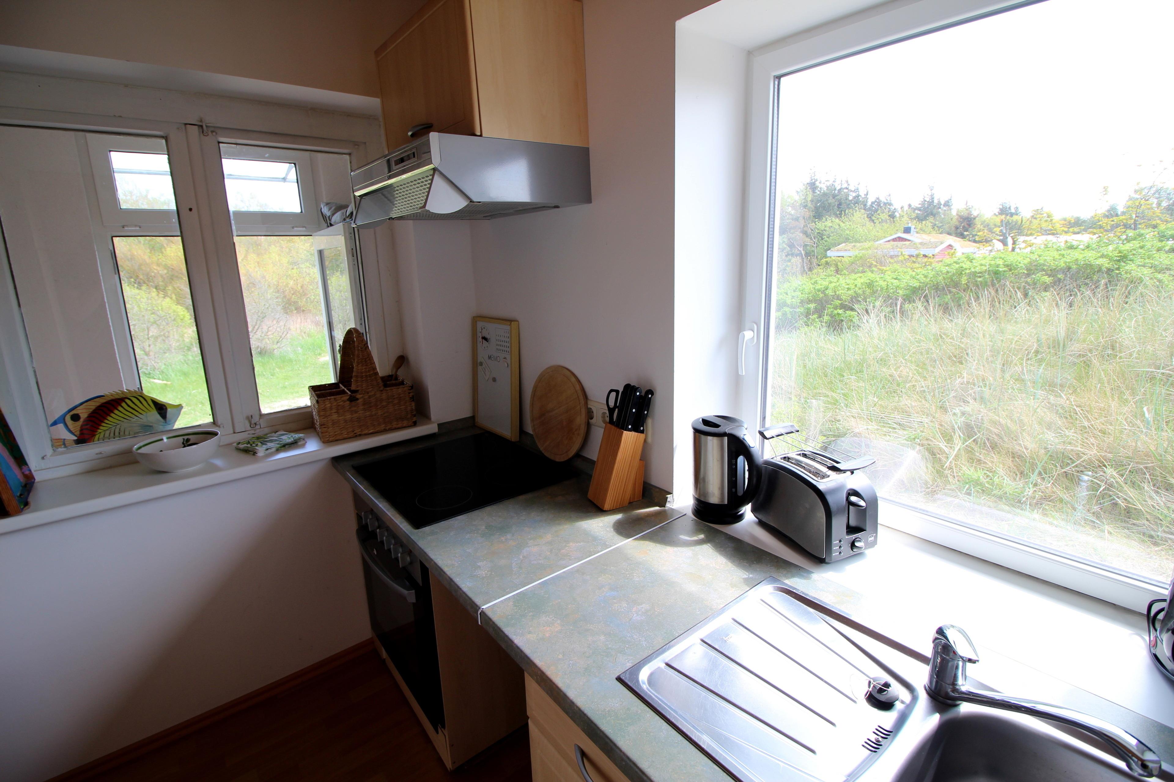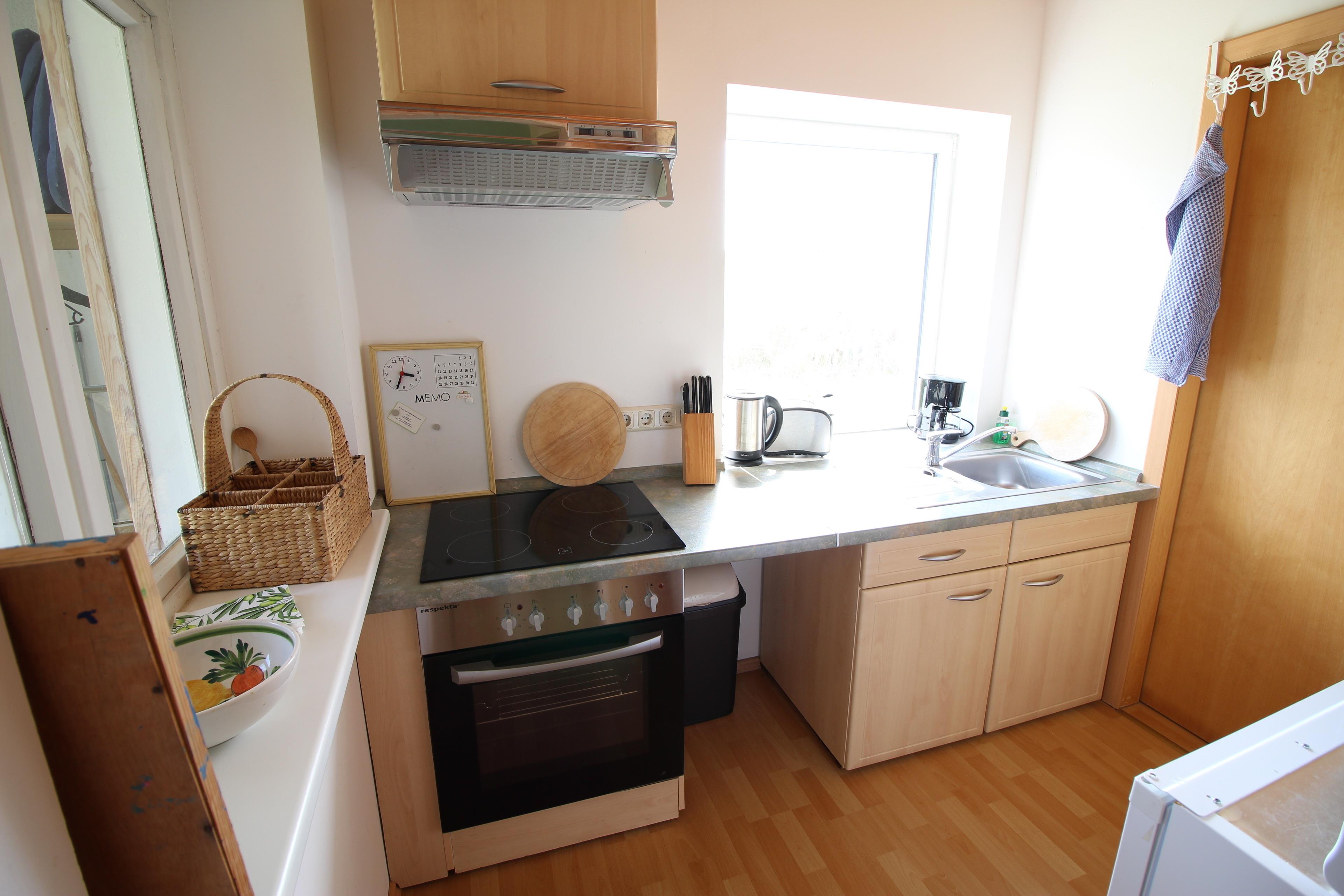 Küche : Die Küchenzeile befindet sich im Eingangsbereich des Hauses ist mit allem was man benötigt ausgestattet. Ausreichend Geschirr, Besteck und andere Küchenaccessoires sind vorhanden. ZB. Kühlschrank, Mikrowelle, Kaffeemaschine, Wasserkocher, Toaster, TV u. s. w