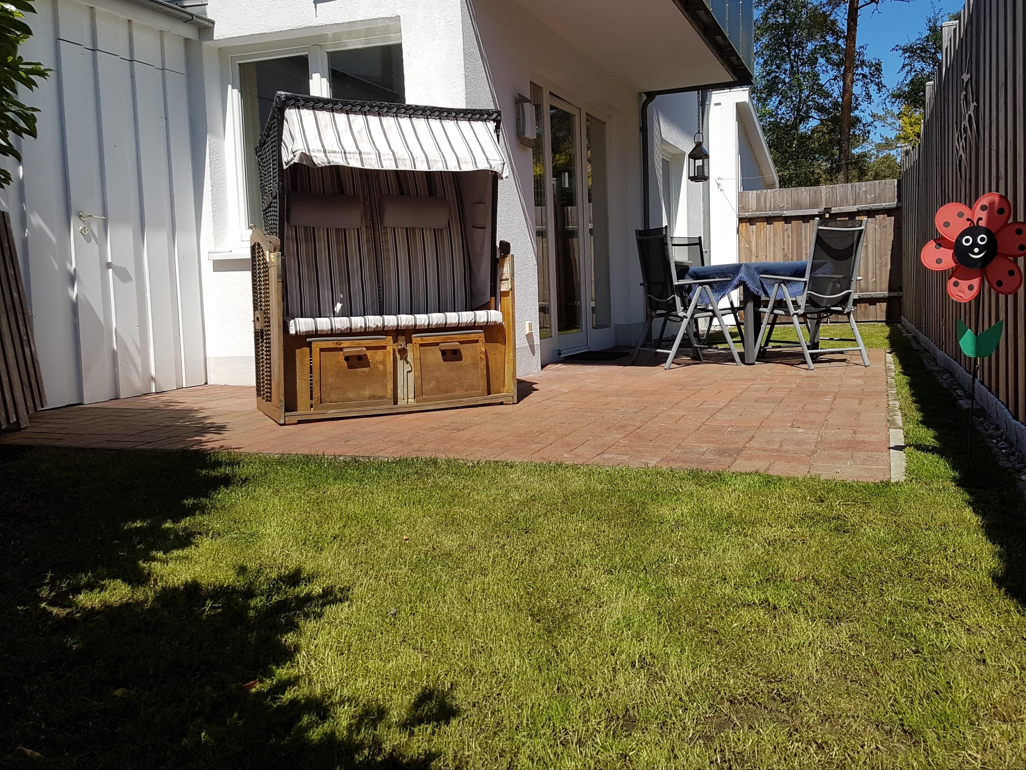 Für den Aufenthalt auf der eigenen Terrasse stehen ein Strandkorb sowie ein Tisch mit 4 verstellbaren Stühlen zur Verfügung.
