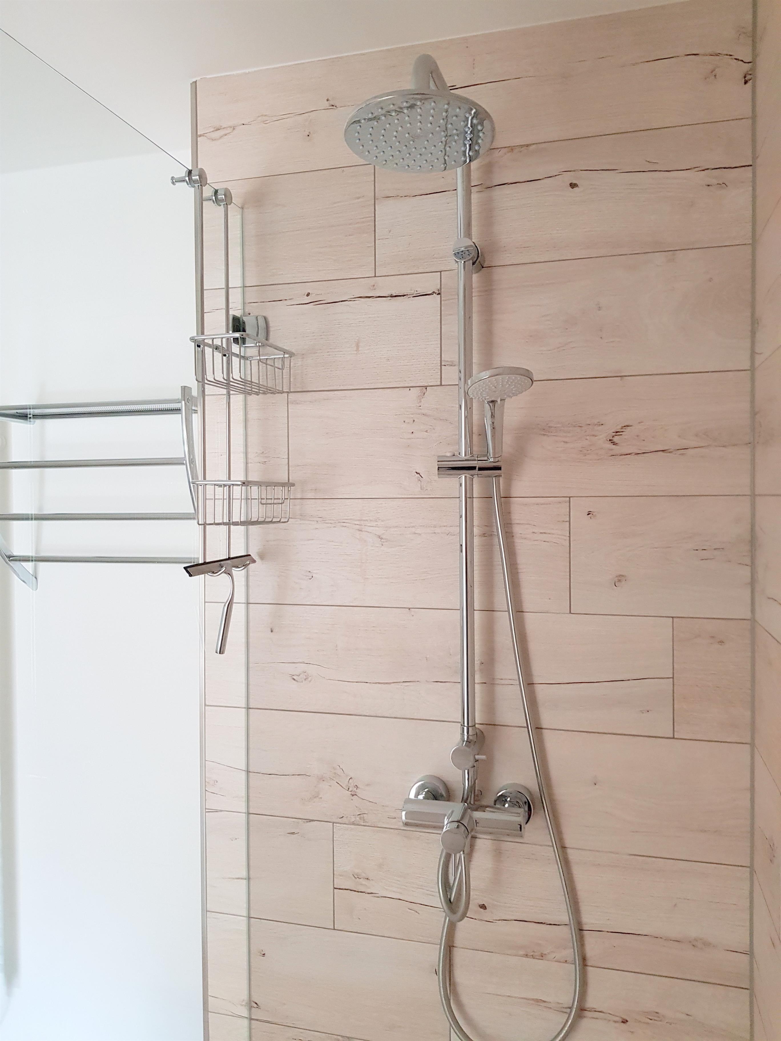 - ein Badezimmer mit großer bodengleicher Eckdusche, Fön und Kosmetikspiegel