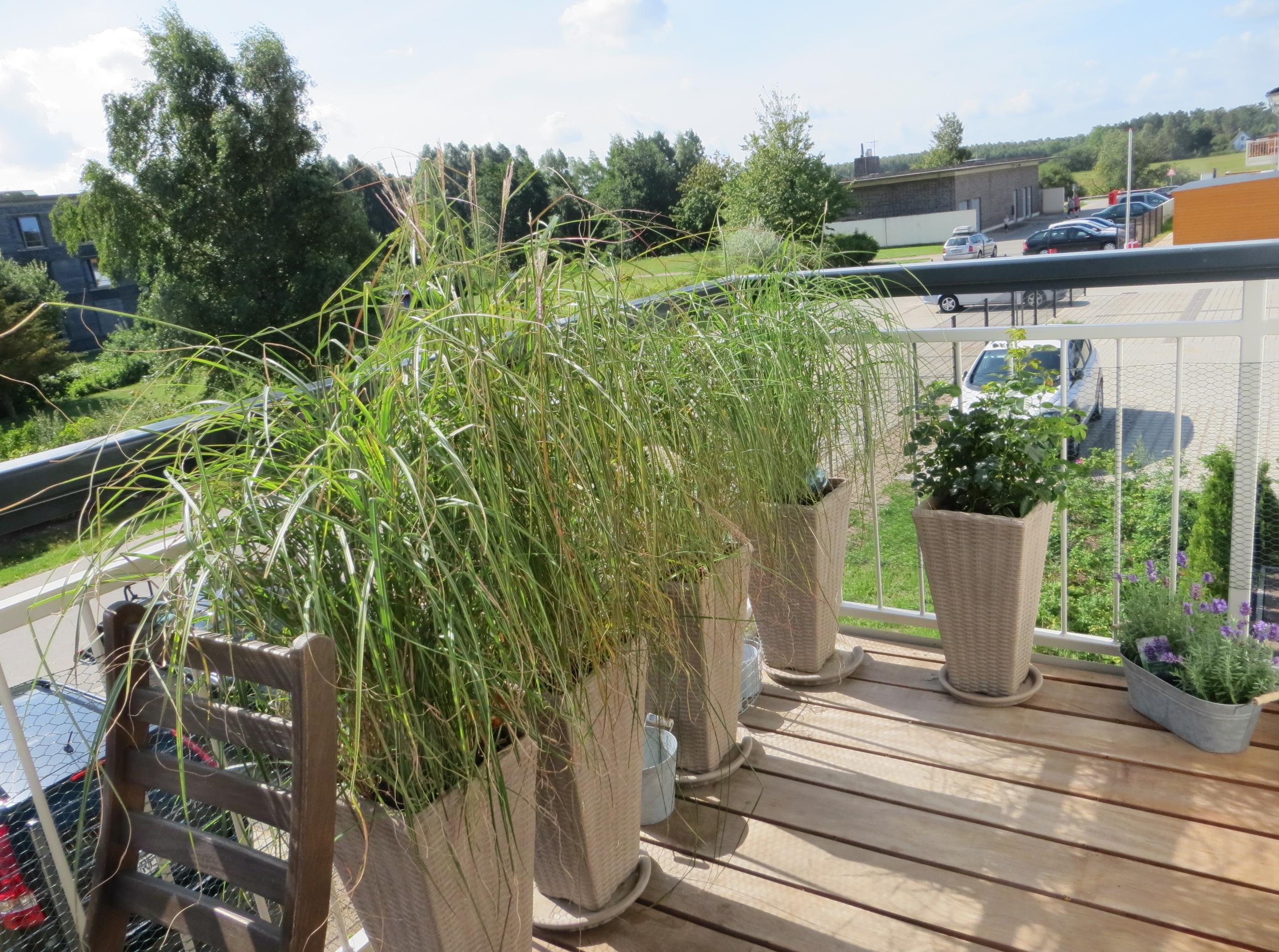 Der Balkon hat vom frühen Morgen an bis ca. 15 Uhr Sonne (Sonnenschutz ist vorhanden). Von dort blickt man auf die gegenüberliegenden Wiesen.
