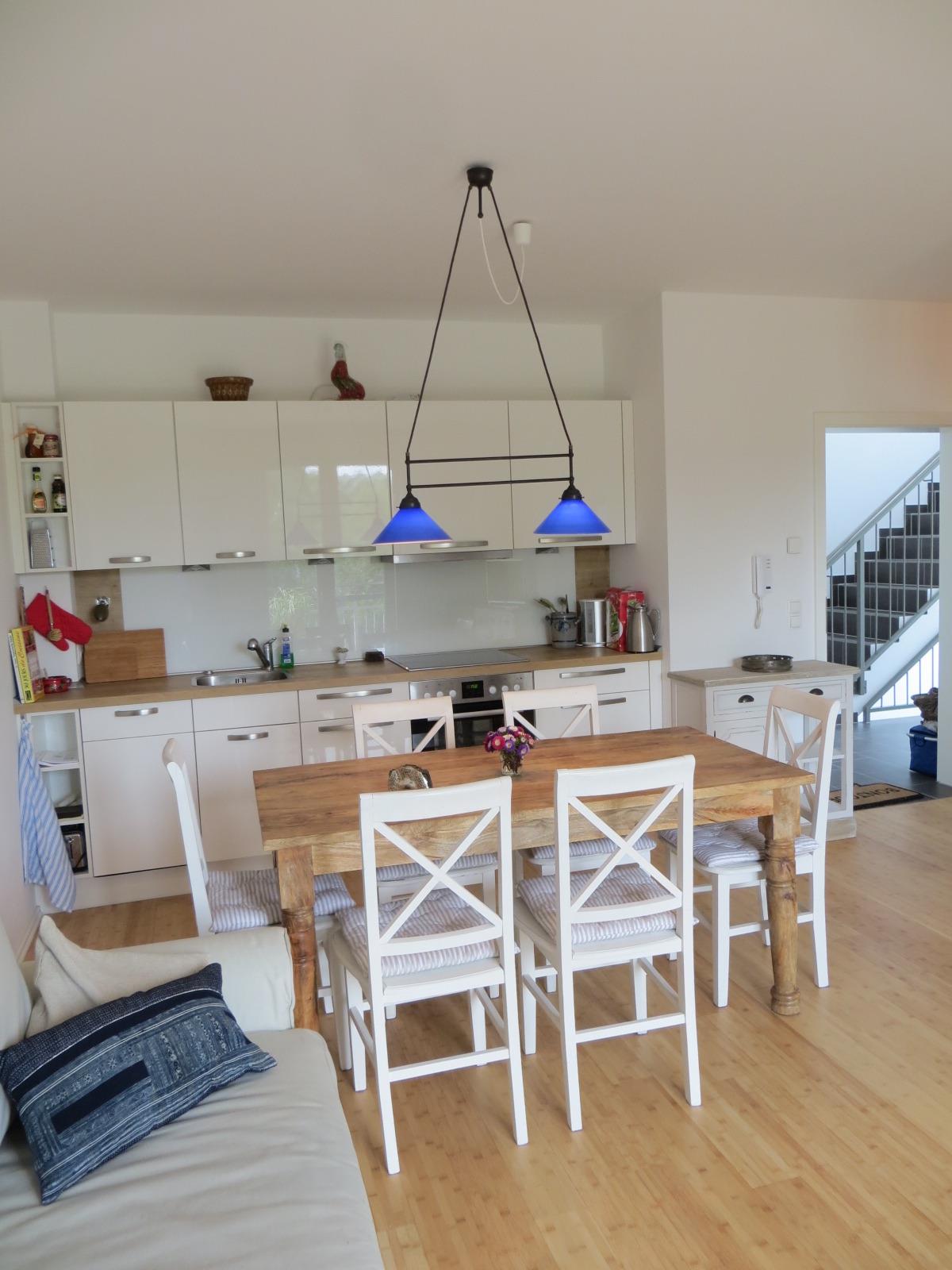 Die Küche ist mit Backofen, Cerankochfeld, Abzugshaube, Geschirrspüler, Toaster, Kaffeemaschine, Küchenmaschine sowie einer geräumigen Gefrierkombination eingerichtet. Eine Grundausstattung an Gewürzen und Tees steht zur Verfügung. Originelles, hochwertiges Geschirr und Besteck sorgen für eine angenehme Atmosphäre beim Essen. Ein Massivholztisch mit 4 Stühlen (2 weitere im Schuppen) verbindet Küche und Wohnraum.
