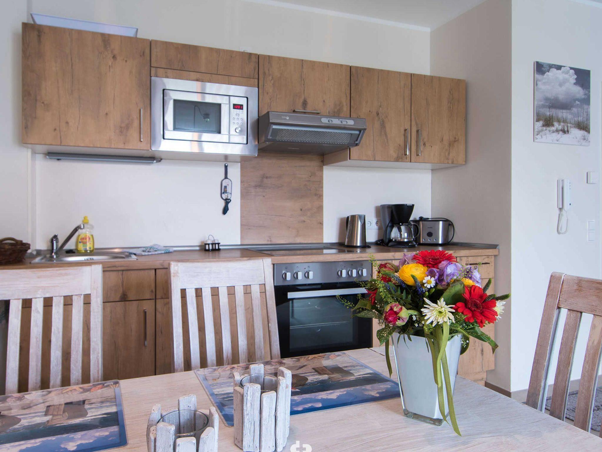 Die Einbauküche ist ausgestattet mit Ceranfeld, Backofen, Geschirrspüler, Kühlschrank mit Gefrierfach, Kaffeemaschine, Wasserkocher und Toaster. Selbstverständlich sind Gläser, Geschirr und Besteck, sowie sämtlich notwendige Kochutensilien ausreichend vorhanden.