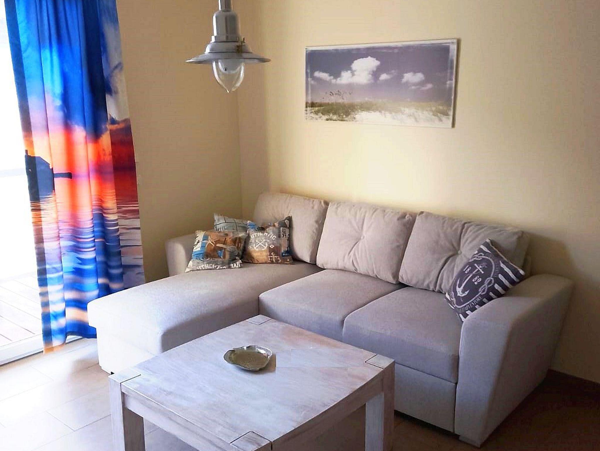 Das Appartement Nr. 5 ANKERPLATZ befindet sich im 1. Obergeschoß des Hauses 3 in der Appartementanlage Käpt n Brass. Das Appartement verfügt über 1 Schlafzimmer, ausgestattet mit einem Doppelbett (180x200) und einem 3-türigen Kleiderschrank, 1 Wohnzimmer mit integrierter Einbauküche, 1 Bad mit Dusche und Waschplatz. Im Wohnzimmer kann die Couch mit wenigen Handgriffen in ein Gästebett (140x190) verwandelt werden und bietet Platz zum Schlafen für 2 Personen.