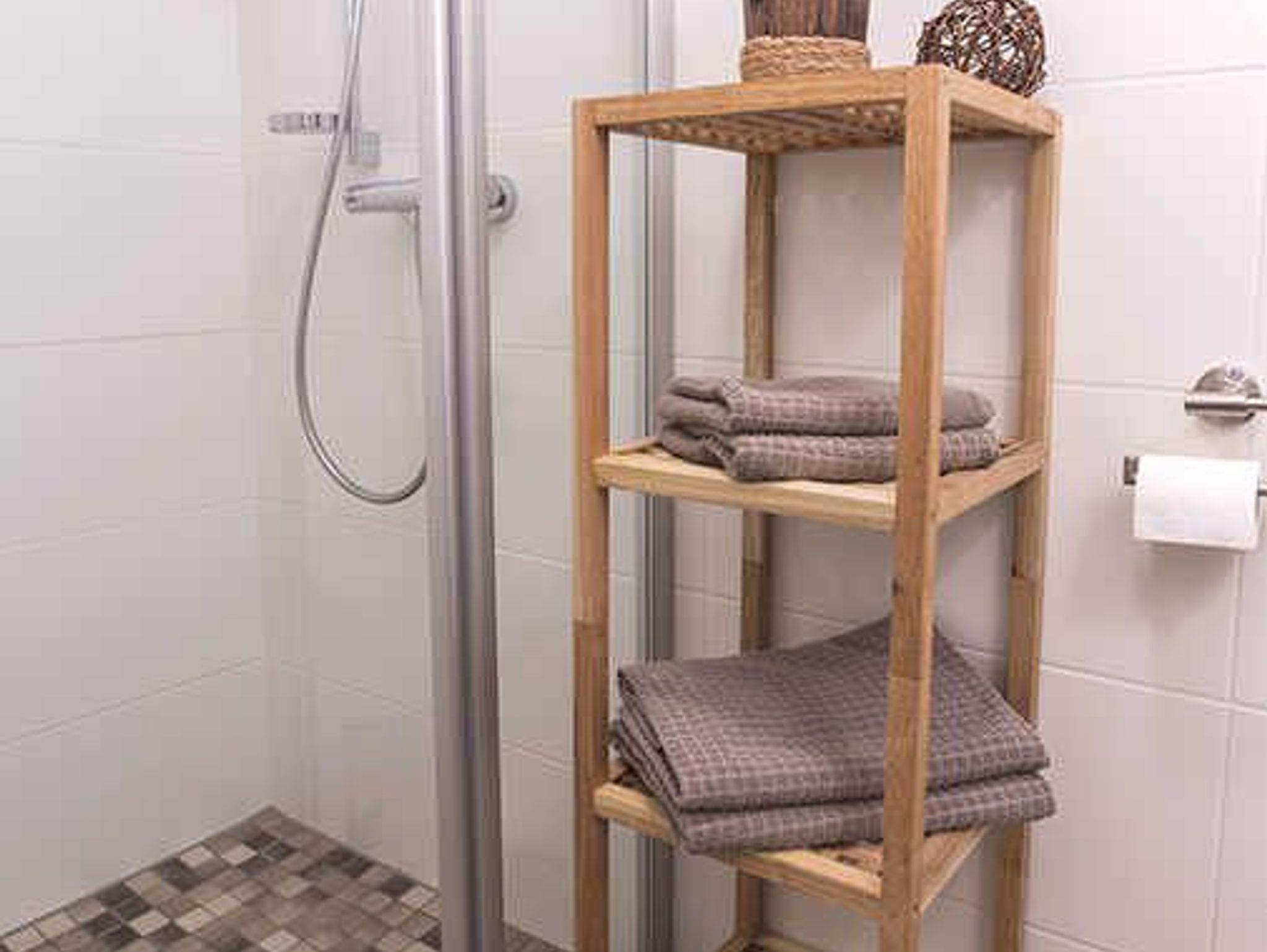 Das geflieste Bad ist mit hochwertiger Ausstattung versehen, dazu gehören die ebenerdige Dusche mit Glastür, Waschtisch und WC.