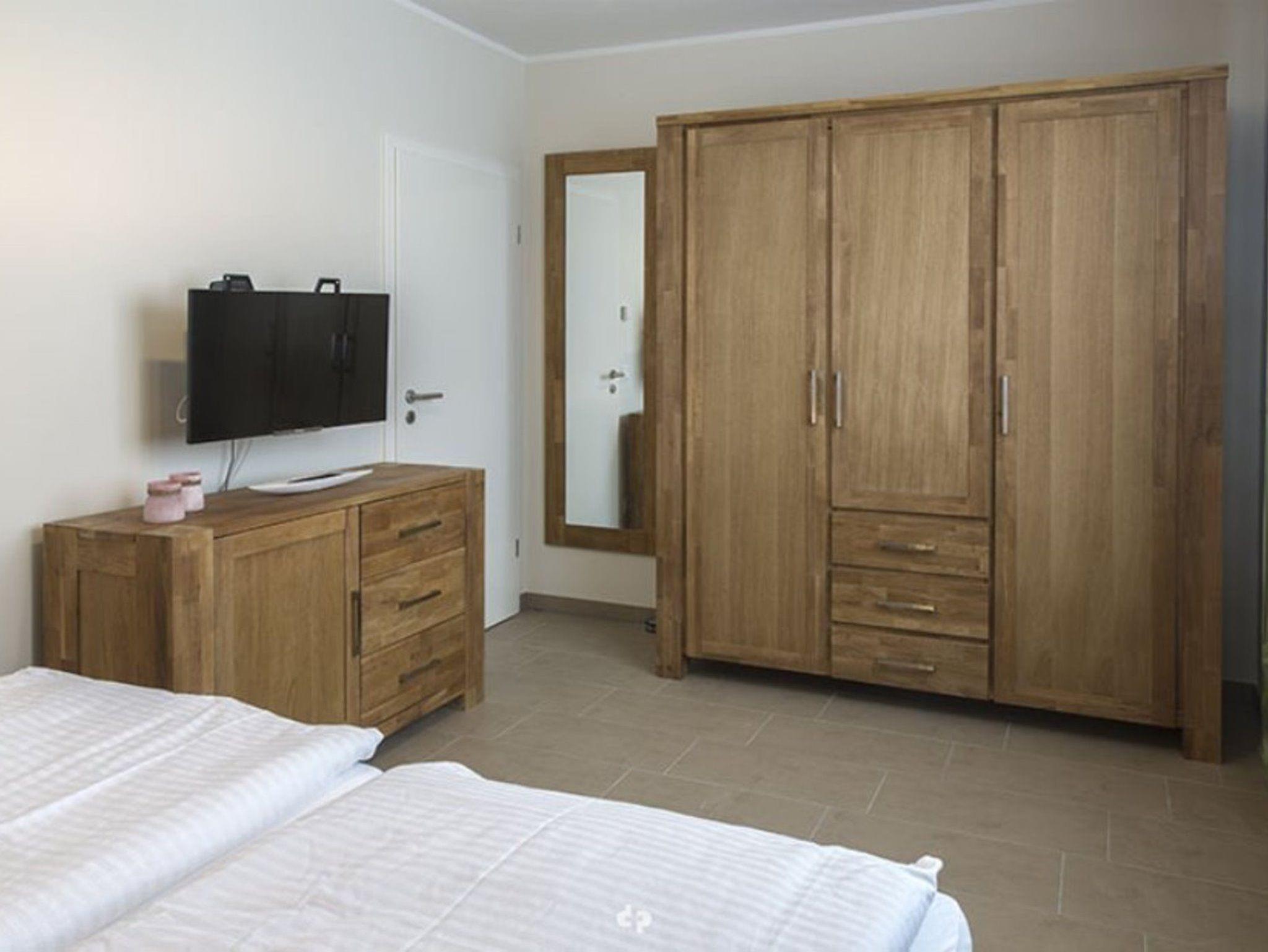 Das Appartement verfügt über 1 Schlafzimmer, ausgestattet mit einem Doppelbett (180x200 mit 2 Matratzen) und einem 3-türigen Kleiderschrank, 1 Wohnzimmer mit integrierter Einbauküche, 1 Bad mit Dusche, Waschplatz und WC.