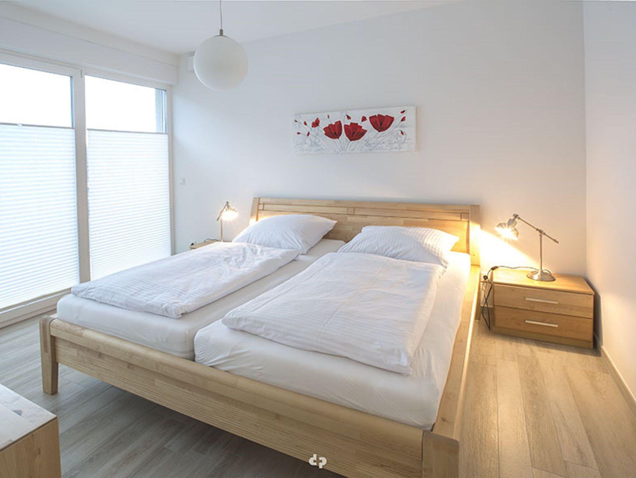 Das Schlafzimmer ist ausgestattet mit einem 2,00m x 2,00m Doppelbett nebst hochwertigen Lattenrosten und Matratzen (2).