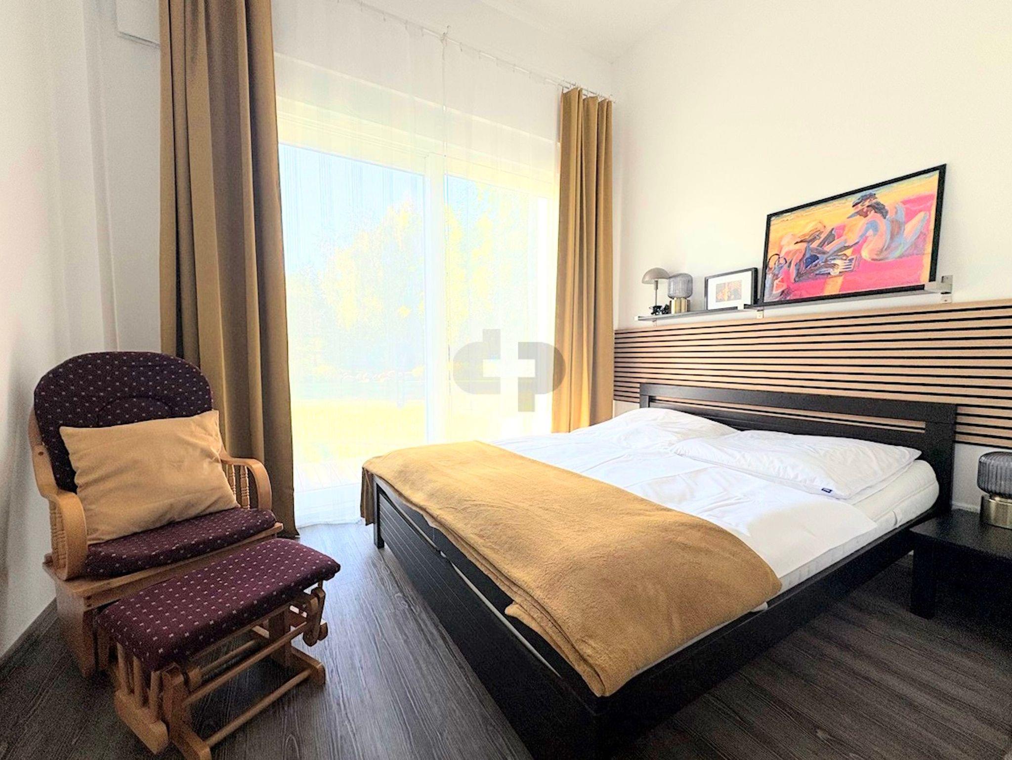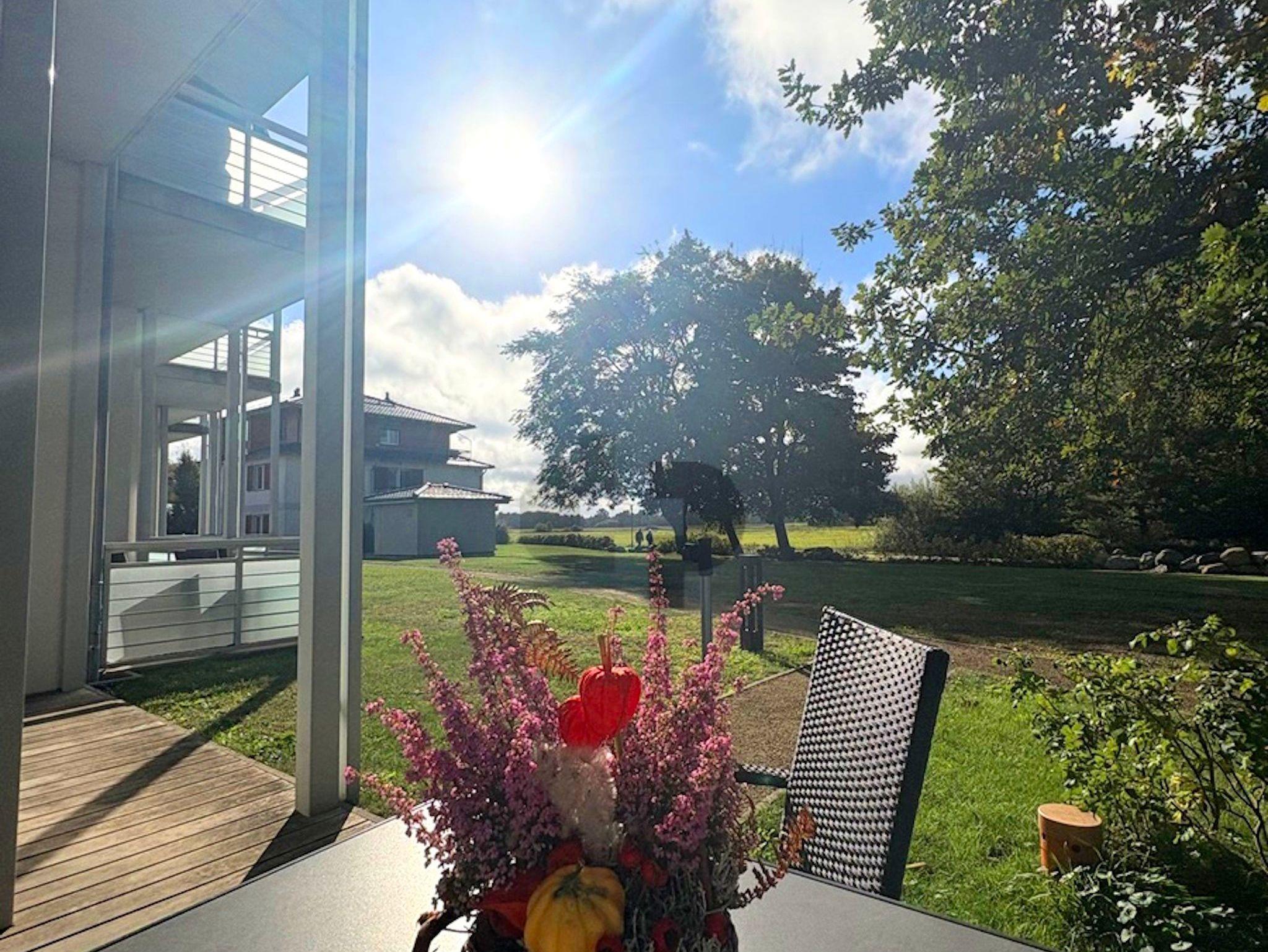 Die Wohnung befindet sich auf der Südseite im Erdgeschoss und ist ebenerdig und von außen begehbar. Die Einrichtung in hellen Farben ist freundlich und modern. Die großzügige überdachte Terrasse ist sowohl vom Schlafzimmer als auch vom Wohnzimmer aus zu erreichen. Die bodenhohen Fenster sorgen für lichtdurchflutete Räume. Wenn Ihnen die Sonne doch einmal zu viel wird, können die vorhandenen Außenjalousien die Räume verdunkeln.