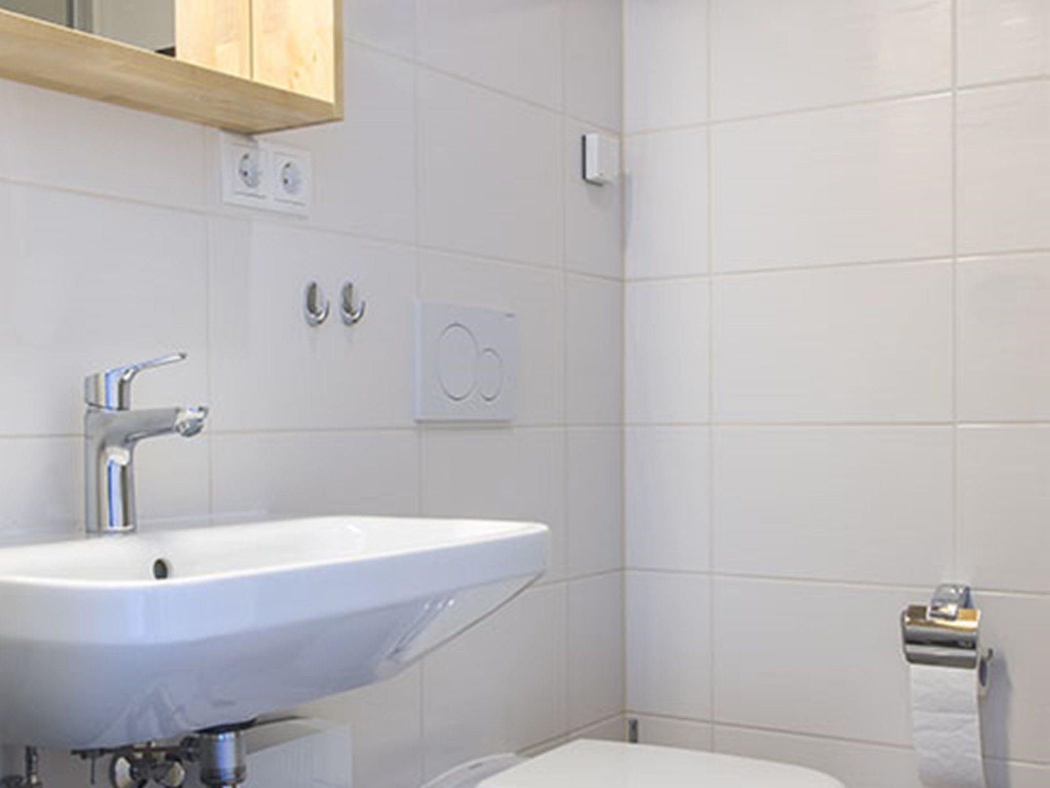 Das Bad verfügt über eine großzügige Dusche, einem Waschplatz und Handtuchheizkörper.