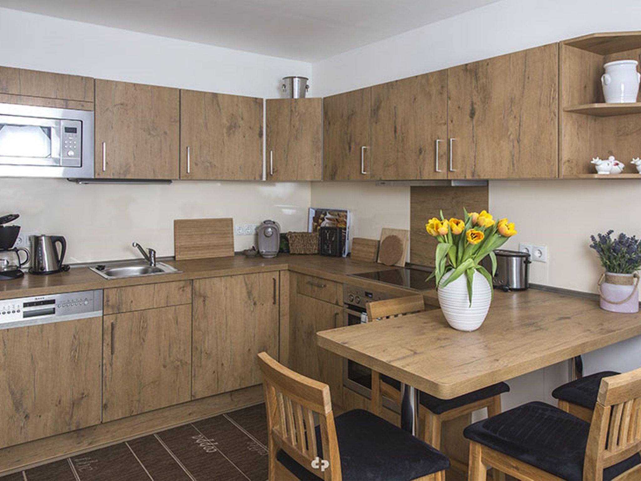 Vom großzügigen Eingangsbereich betreten Sie den Wohnbereich, mit integrierter und voll ausgestatteter Einbauküche. Die hochwertige Küche ist ausgestattet mit Cerankochfeld, Backofen, Geschirrspüler, Kühlschrank mit Gefrierfach, Kaffeemaschine, Wasserkocher, Toaster und selbstverständlich ausreichend Geschirr und Besteck.
