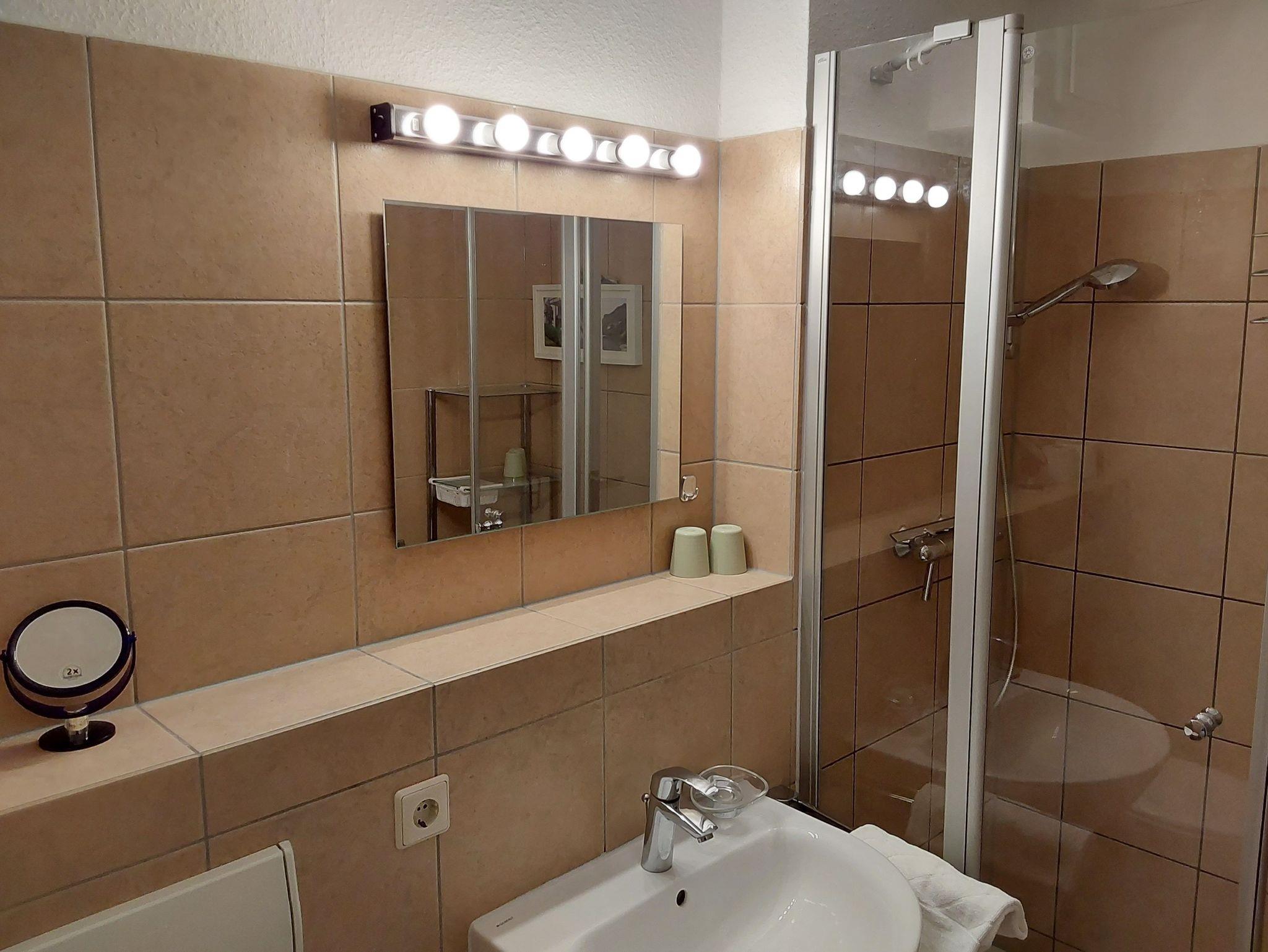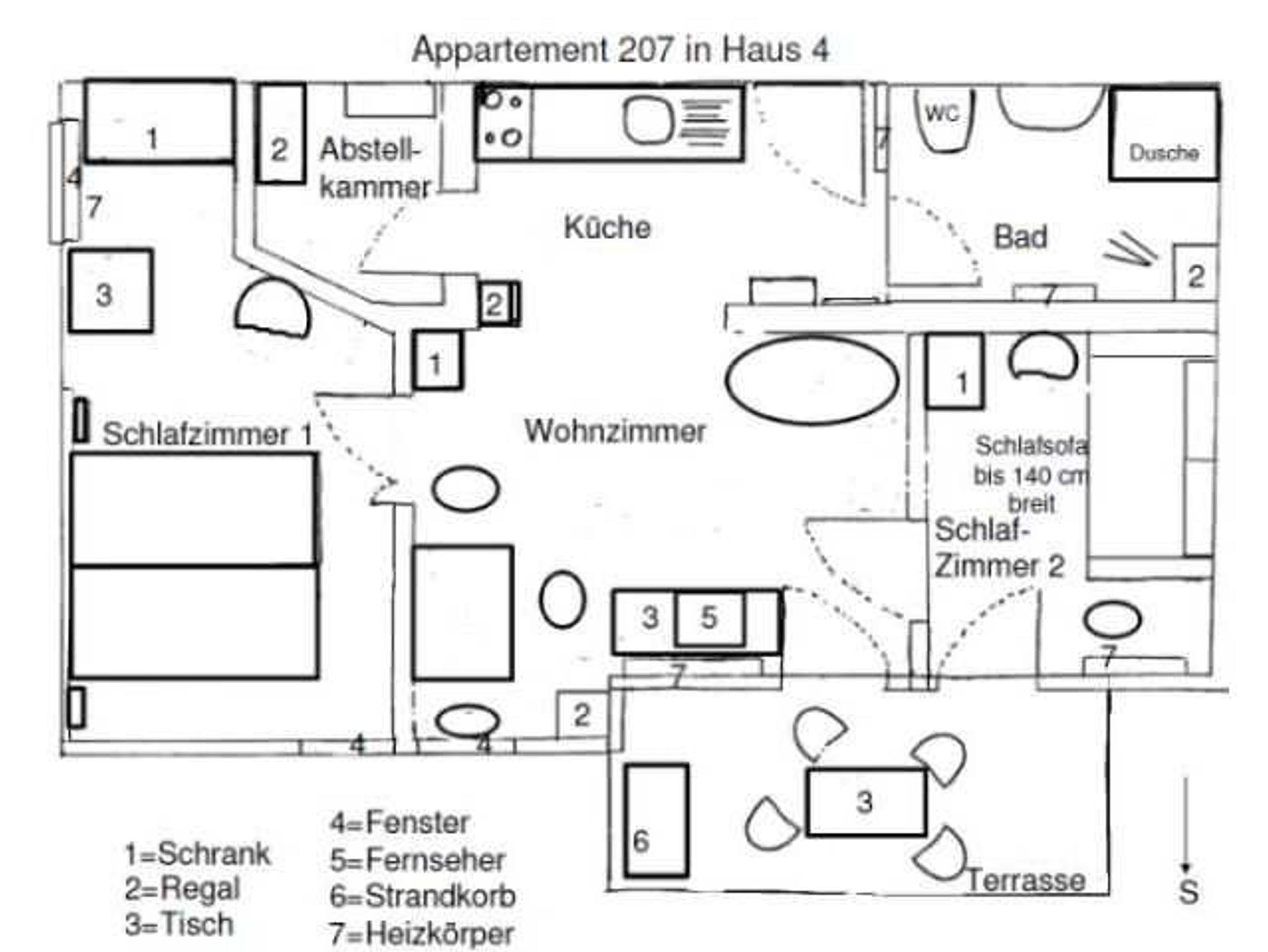 Die FEWO ist für zwei Personen üppig groß und insgesamt gut ausgestattet. Die fehlende Spülmaschine fällt bei zwei Personen kaum ins Gewicht, das fehlende W-Lan ist nicht mehr zeitgemäß. Auch die weißen Plastikstühle auf den Balkonen sollten einmal erneuert werden.