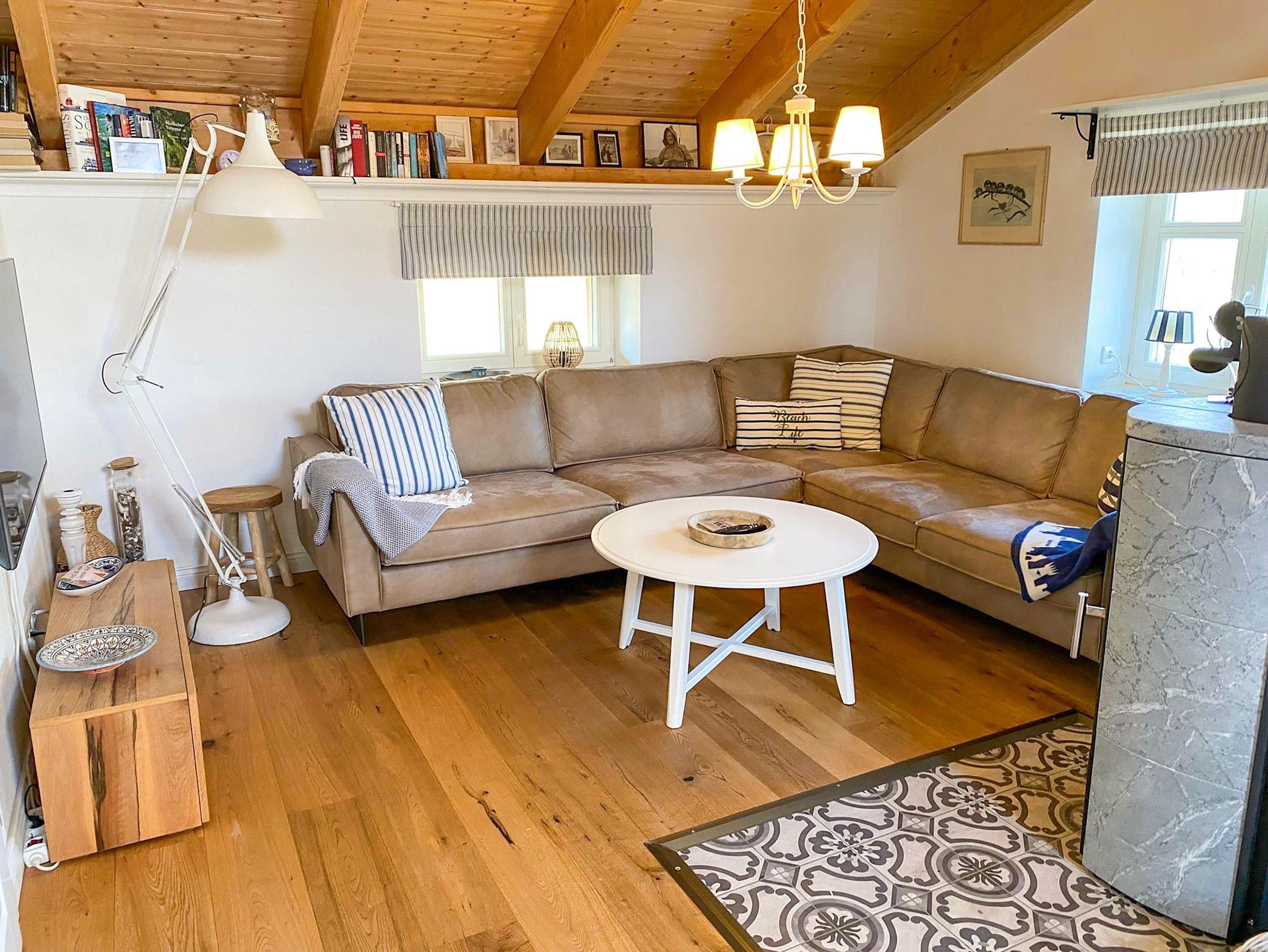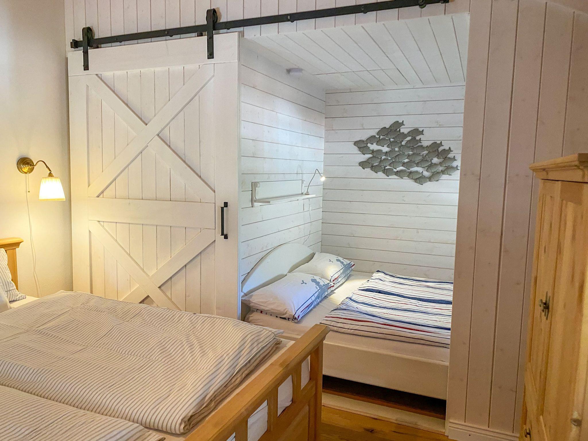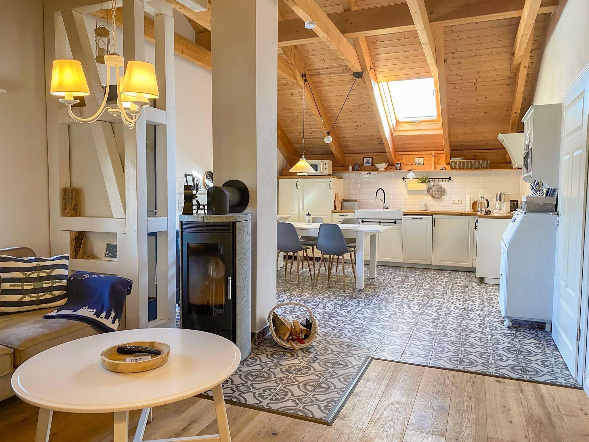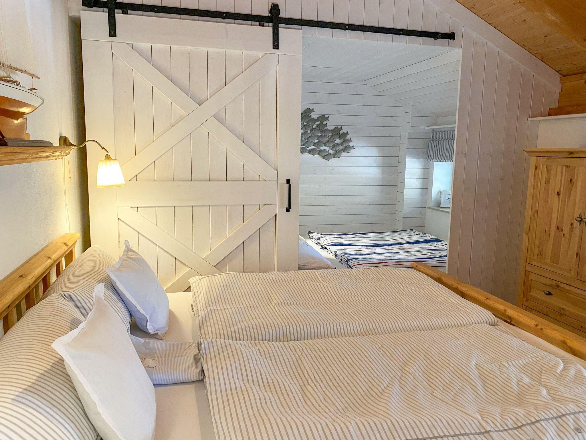 In der Ferienwohnung Wattmanbruukt im Dachgeschoss eines Einfamilienhauses erwartet dich eine gemütliche Auszeit mit Ostsee-Flair. Der separate Zugang über die Außentreppe führt dich in eine Wohnung für 4 Personen, die mit ihrem maritimen Stil und einem warmen Kamin im Wohnzimmer sofort zum Wohlfühlen einlädt. Das offene Wohnzimmer bietet eine einladende Atmosphäre, perfekt für entspannte Stunden mit einem guten Buch oder einem geselligen Abend. Die angrenzende offene Küche fügt sich harmonisch in den Raum ein und ermöglicht es dir, mit deinen Liebsten gemeinsam zu kochen und zu genießen. Das separate Schlafzimmer bietet ein komfortables Doppelbett für erholsame Nächte. Zusätzlich gibt es in einer charmanten Schlafkoje ein kleines Doppelbett, das sich ideal für Kinder oder weitere Mitreisende eignet. Das moderne Bad mit ebenerdiger Dusche ist gemütlich und freundlich gestaltet.Die Terrasse vor dem Haus lädt dazu ein, die frische Ostseeluft zu genießen und bietet Platz für entspannte Momente im Freien. Für Radfahrer ist eine sichere Unterstellmöglichkeit für Fahrräder vorhanden und ein Parkplatz direkt am Haus steht ebenfalls zur Verfügung.
