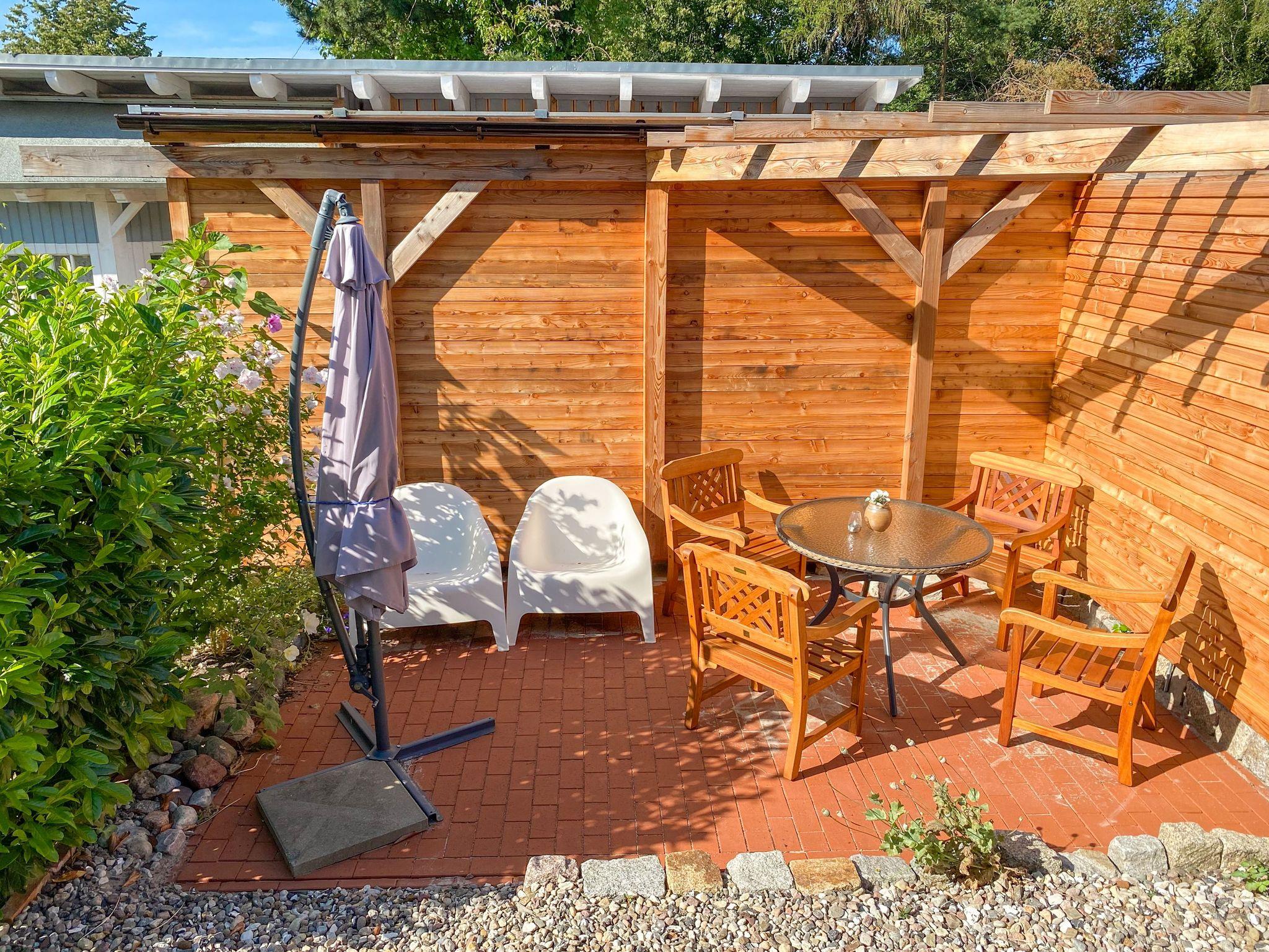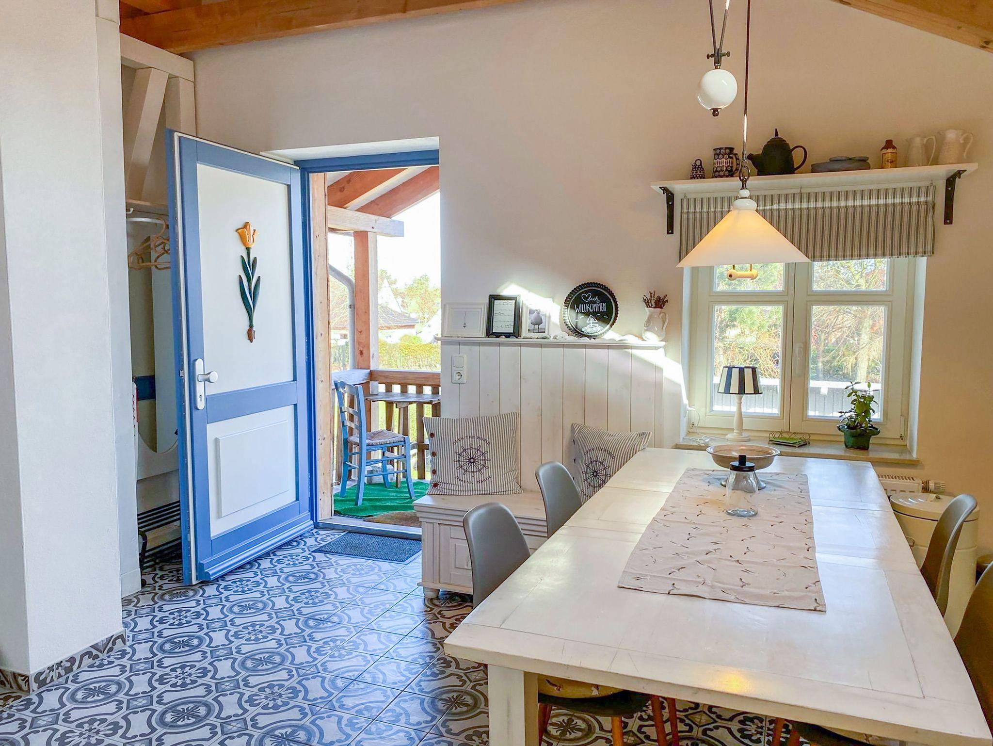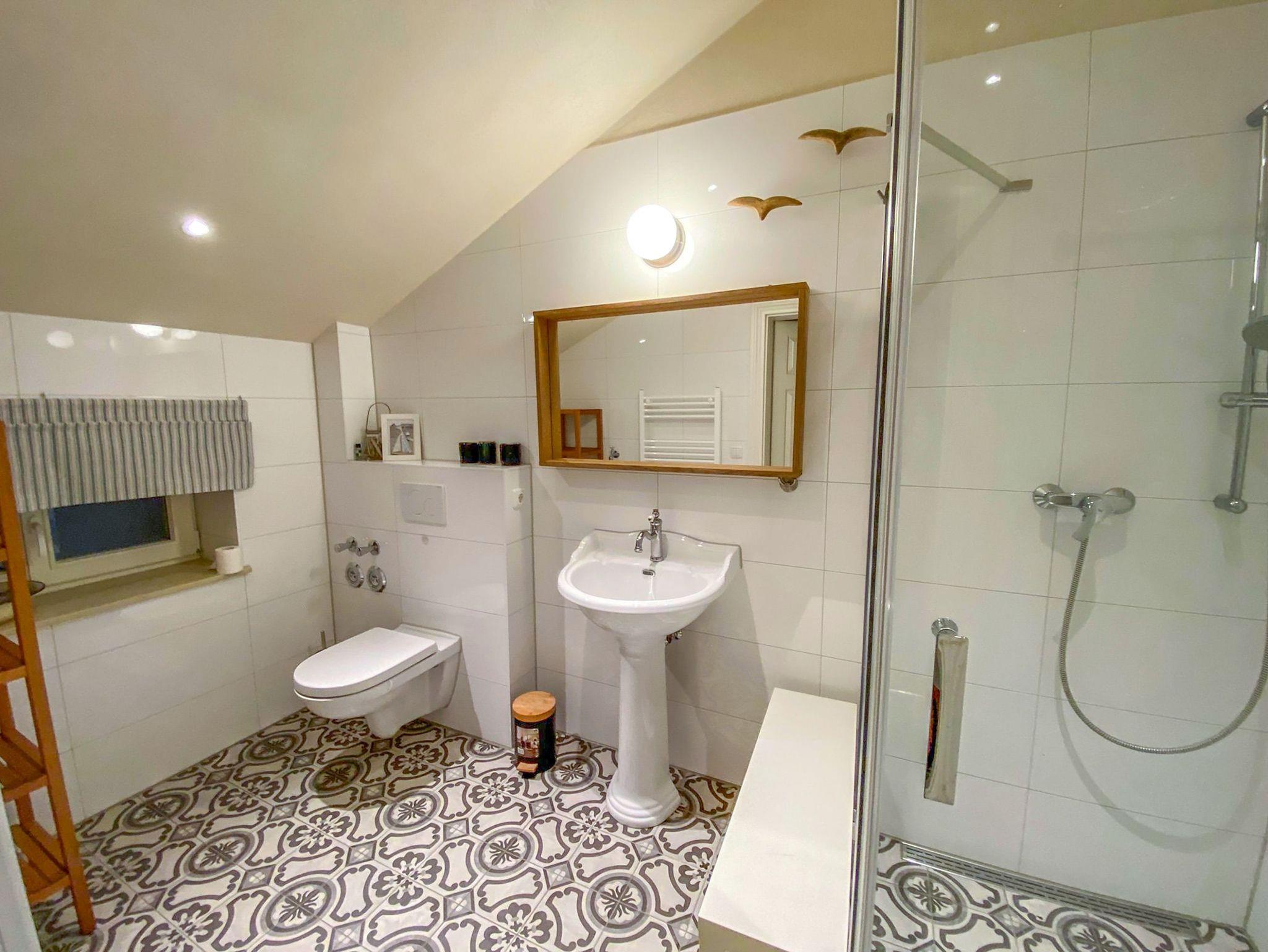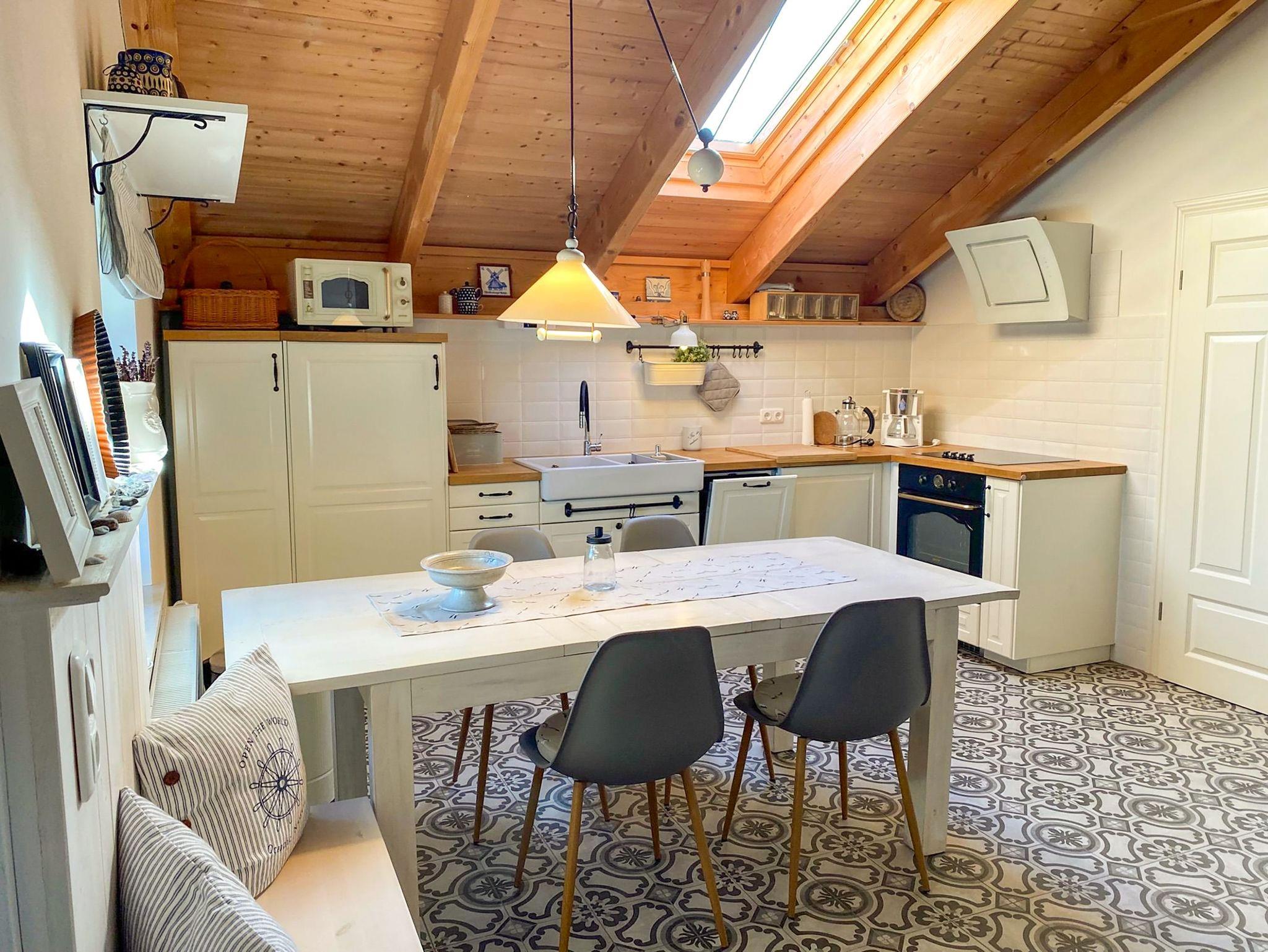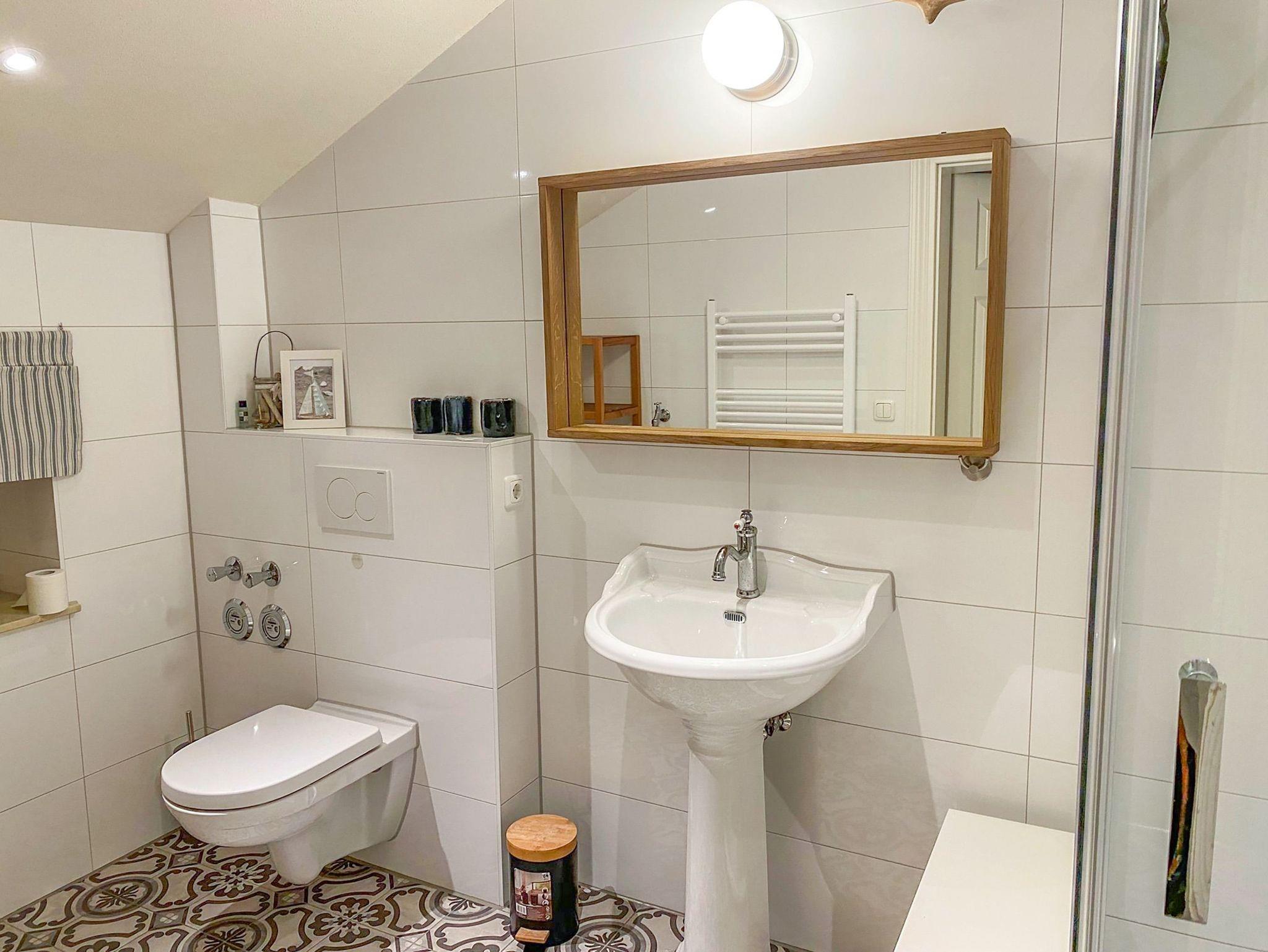 In der Ferienwohnung Wattmanbruukt im Dachgeschoss eines Einfamilienhauses erwartet dich eine gemütliche Auszeit mit Ostsee-Flair. Der separate Zugang über die Außentreppe führt dich in eine Wohnung für 4 Personen, die mit ihrem maritimen Stil und einem warmen Kamin im Wohnzimmer sofort zum Wohlfühlen einlädt. Das offene Wohnzimmer bietet eine einladende Atmosphäre, perfekt für entspannte Stunden mit einem guten Buch oder einem geselligen Abend. Die angrenzende offene Küche fügt sich harmonisch in den Raum ein und ermöglicht es dir, mit deinen Liebsten gemeinsam zu kochen und zu genießen. Das separate Schlafzimmer bietet ein komfortables Doppelbett für erholsame Nächte. Zusätzlich gibt es in einer charmanten Schlafkoje ein kleines Doppelbett, das sich ideal für Kinder oder weitere Mitreisende eignet. Das moderne Bad mit ebenerdiger Dusche ist gemütlich und freundlich gestaltet.Die Terrasse vor dem Haus lädt dazu ein, die frische Ostseeluft zu genießen und bietet Platz für entspannte Momente im Freien. Für Radfahrer ist eine sichere Unterstellmöglichkeit für Fahrräder vorhanden und ein Parkplatz direkt am Haus steht ebenfalls zur Verfügung.