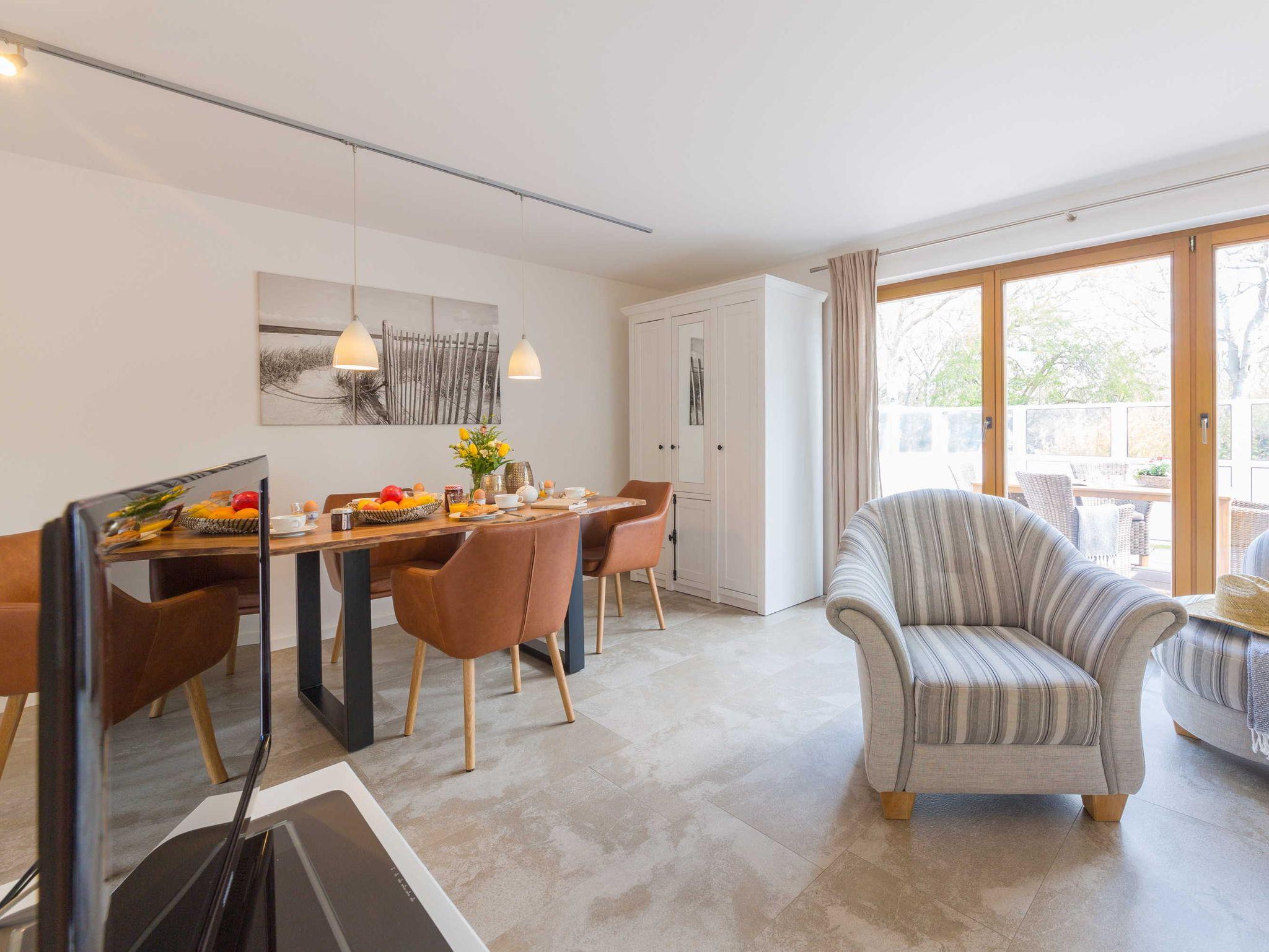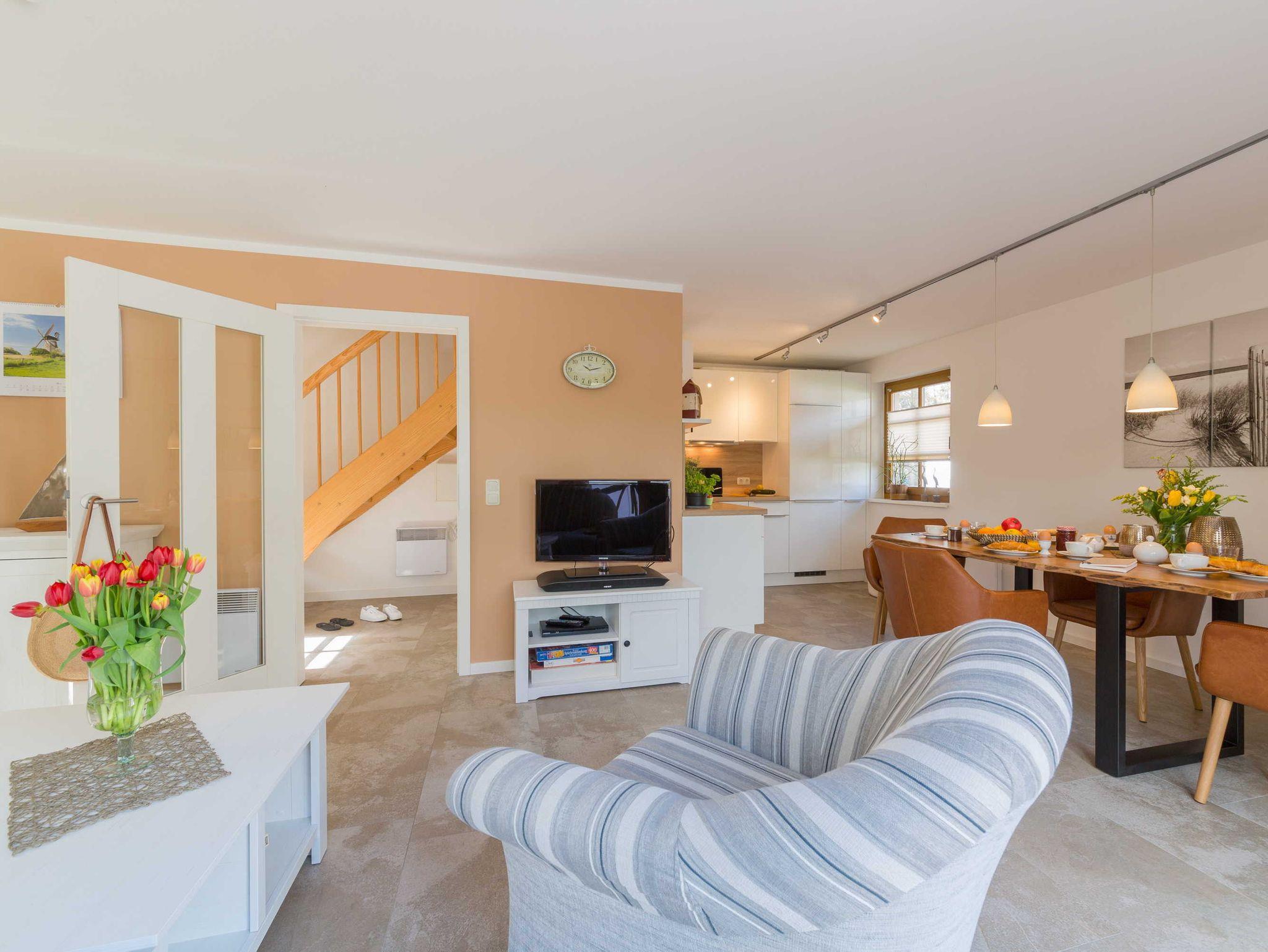 Das offene Wohnzimmer bieten neben einer Couchgarnitur einen Flachbild-TV mit SAT-Empfang und einen Blue-Ray Player. Im Essbereich steht ein großer Tisch mit ausreichend Stühlen. Die Einbauküche ist komplett ausgestattet, u.a. mit Geschirrspüler, Backofen-Herd, Kühlschrank, Kaffeemaschine, Toaster und Wasserkocher.