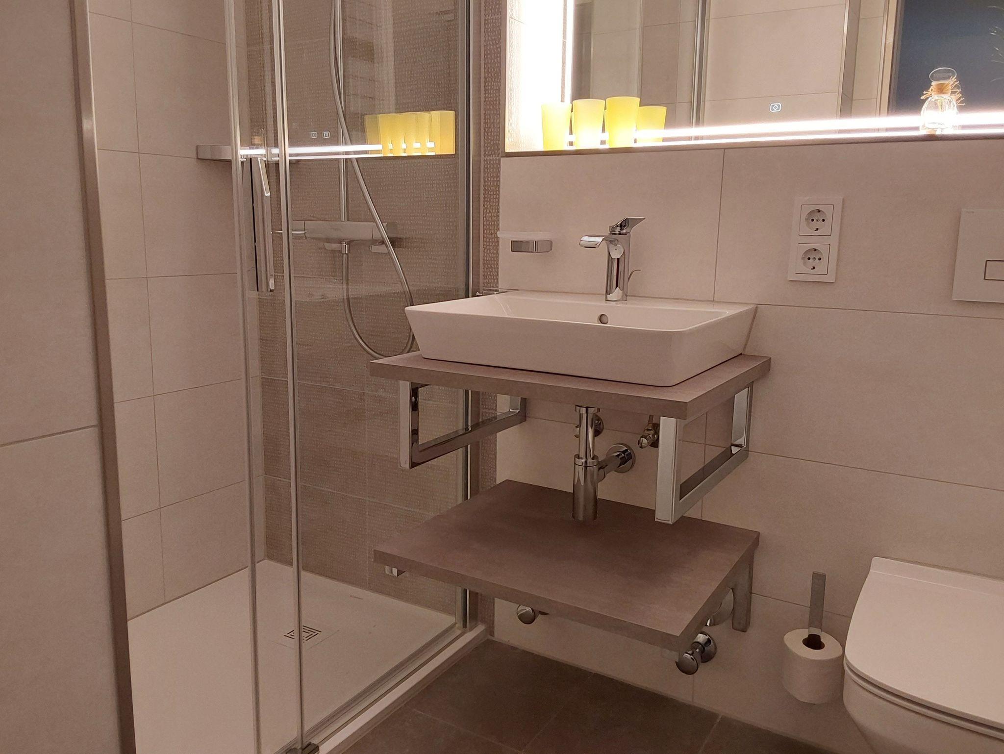 Die FEWO ist für zwei Personen üppig groß und insgesamt gut ausgestattet. Die fehlende Spülmaschine fällt bei zwei Personen kaum ins Gewicht, das fehlende W-Lan ist nicht mehr zeitgemäß. Auch die weißen Plastikstühle auf den Balkonen sollten einmal erneuert werden.