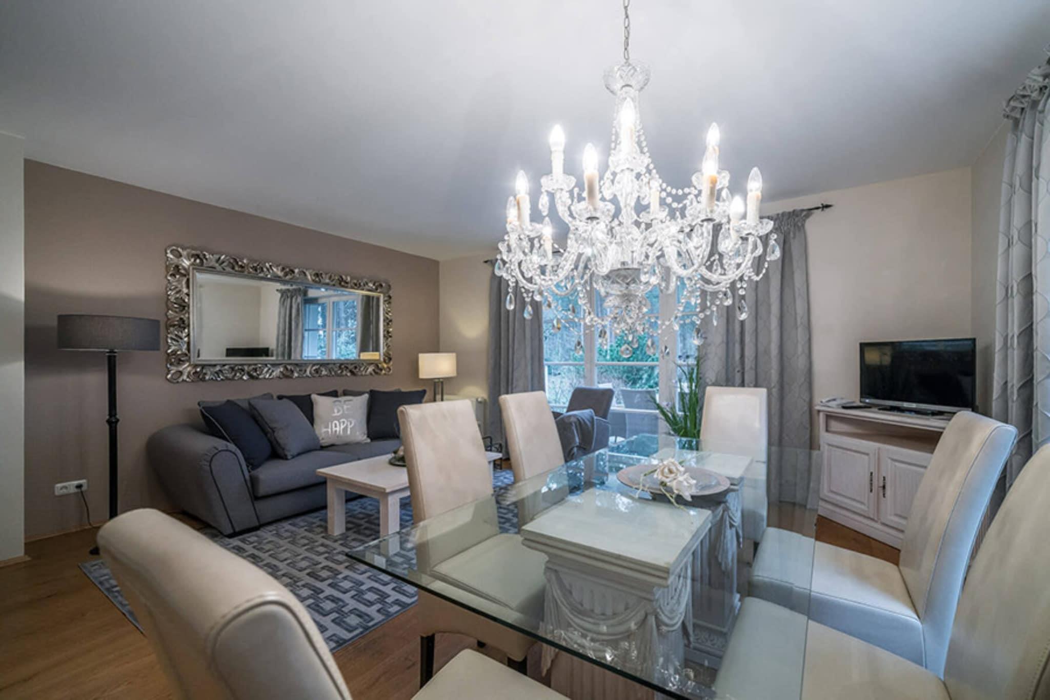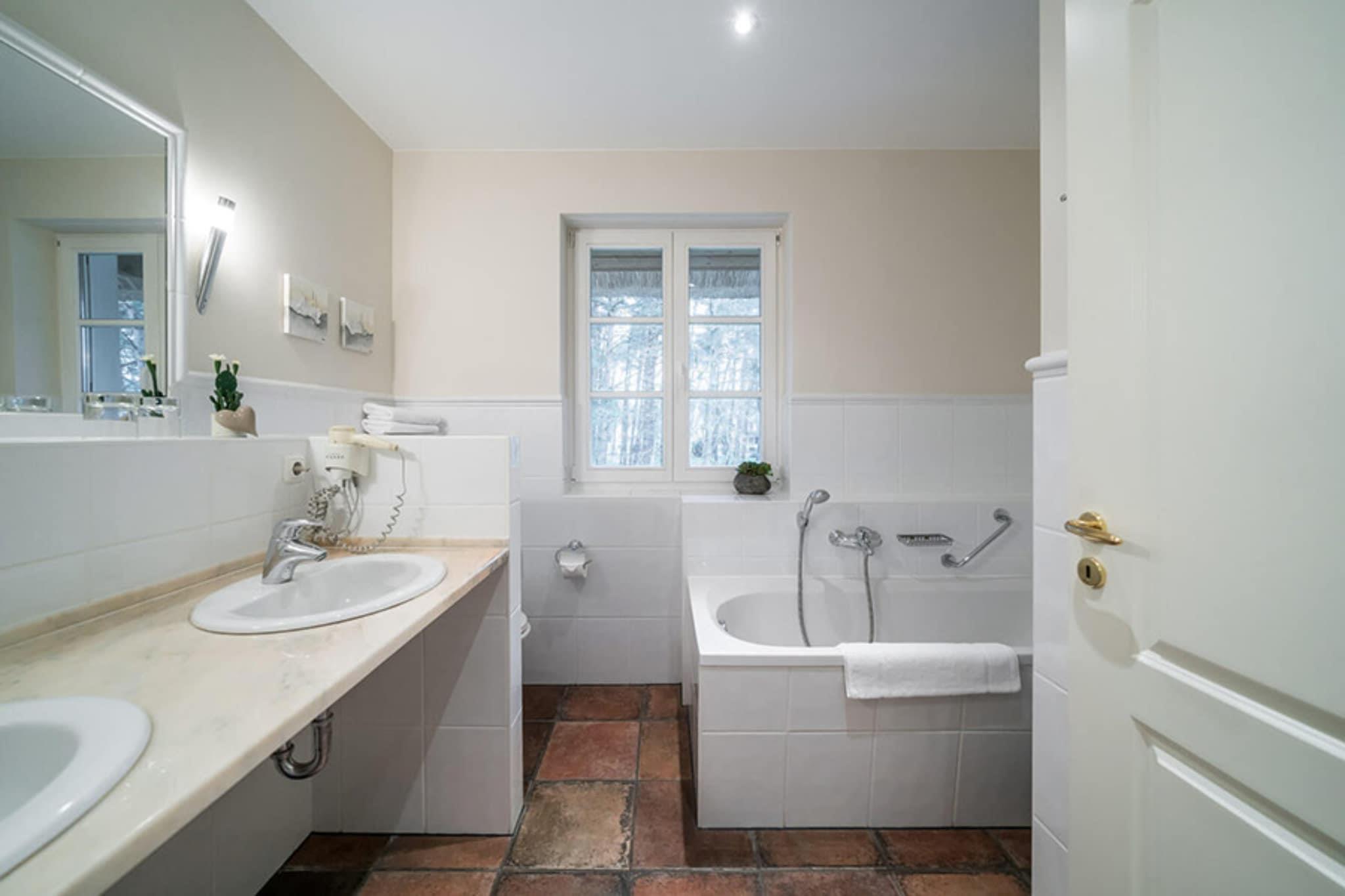 Dette rummelige feriehus fordelt på tre etager har plads til op til 6 personer – ideelt for familier eller par. I stueetagen finder du et fuldt udstyret køkken med opvaskemaskine og en hyggelig opholds- og spisestue med pejs. Der er også et badeværelse med bruser. På første sal er der to soveværelser – et med dobbeltseng og tv, det andet med to enkeltsenge og tv – samt et stort badeværelse med bruser, badekar og dobbelt håndvask. Den ombyggede loftslejlighed har endnu et soveværelse med to enkeltsenge og et ekstra toilet med håndvask – perfekt til børn eller teenagere. Faciliteterne inkluderer en terrasse med havemøbler og en privat parkeringsplads. Prisen inkluderer internetadgang i hele hotellet og gratis parkering. Det 4.500 m² store wellness- og spa-område med swimmingpool, saunalandskab og stort fitnessrum kan benyttes mod et gebyr: swimmingpool og sauna koster EURO20 pr. person/dag, og fitnessområdet koster EURO15 pr. person/dag. Daglige aktiviteter såsom yoga, vandfitness og rygfitness fuldender programmet. I skoleferierne venter et varieret børnepasningsprogram på børnene. Skift af sengetøj er inkluderet ved ophold på 7 dage eller mere; ekstra rengøring med skift af sengetøj kan bookes på stedet for EURO150.