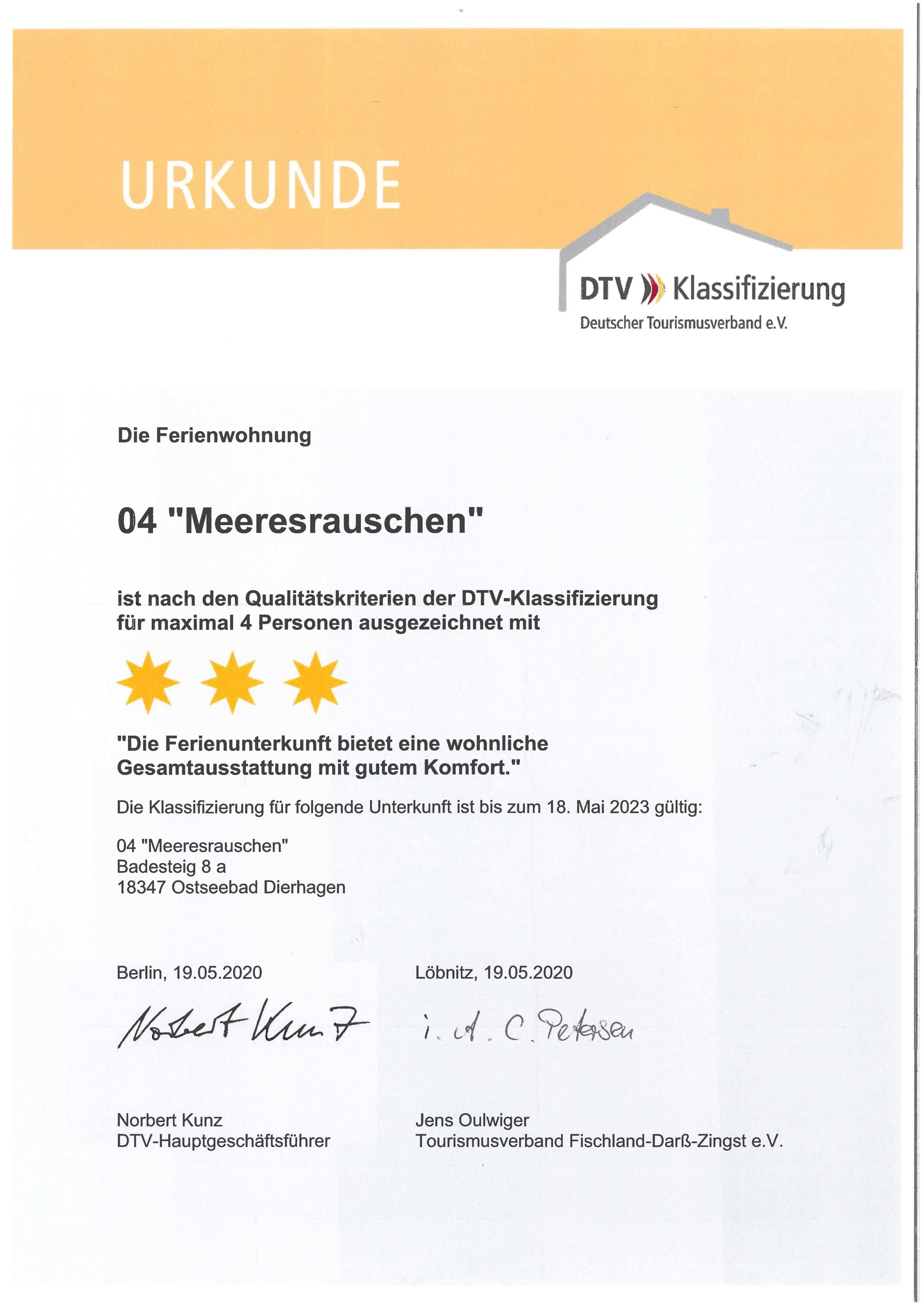Die Ferienwohnung ist nach den Richtlinien der DTV-Klassifizierung Deutscher Tourismusverband e.V. mit 3-Sternen ausgezeichnet, gültig bis 18.05.2023.