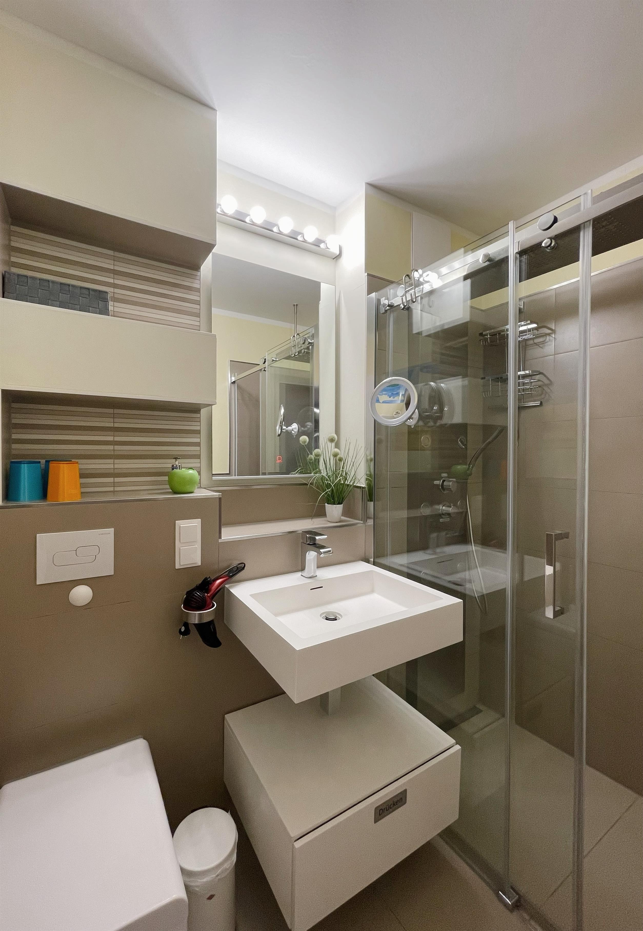 - ein Badezimmer mit bodengleicher Dusche (incl. Fön und beleuchtetem Spiegel)