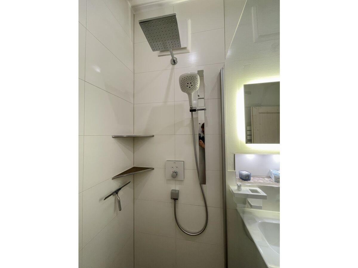 - ein Badezimmer mit großer bodengleicher Eckdusche, Fön, beleuchtetem Spiegel,