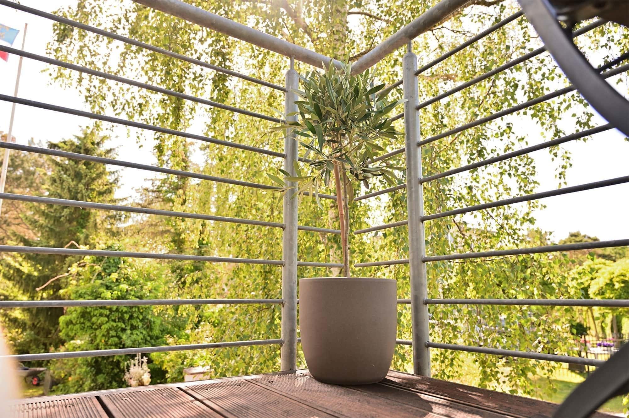 ·Möbelierter sonniger Balkon mit Ausblick auf den Küstenwald