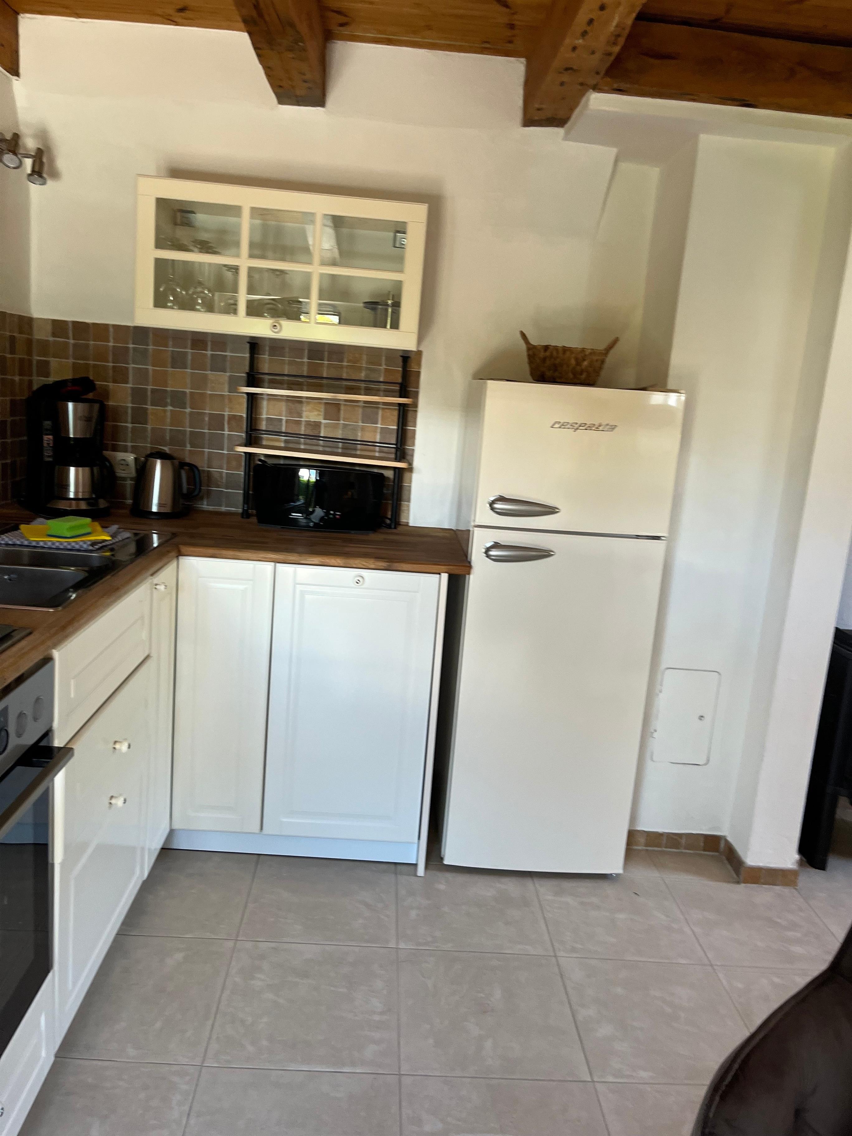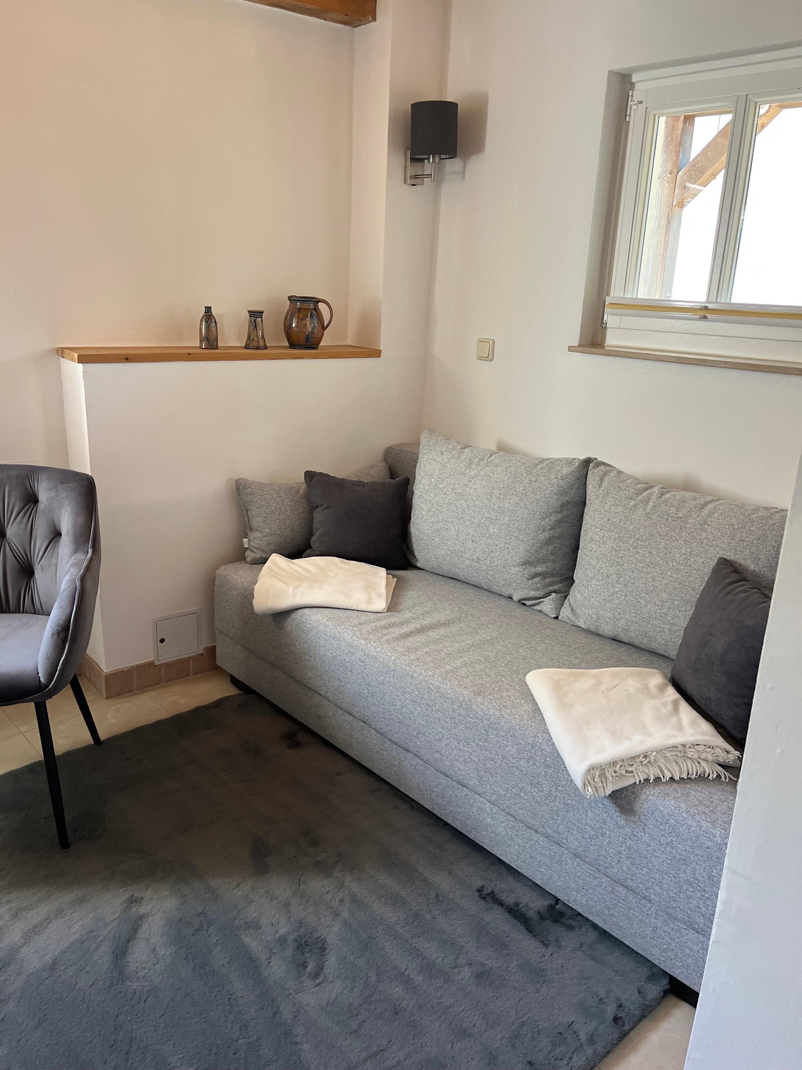 Wohnung über 2 Etagen, Wohnzimmer , Küchenzeile und GästeWC im EG , über eine Treppe geht es zum Schlafzimmer und zum Bad mit Dusche und WC.