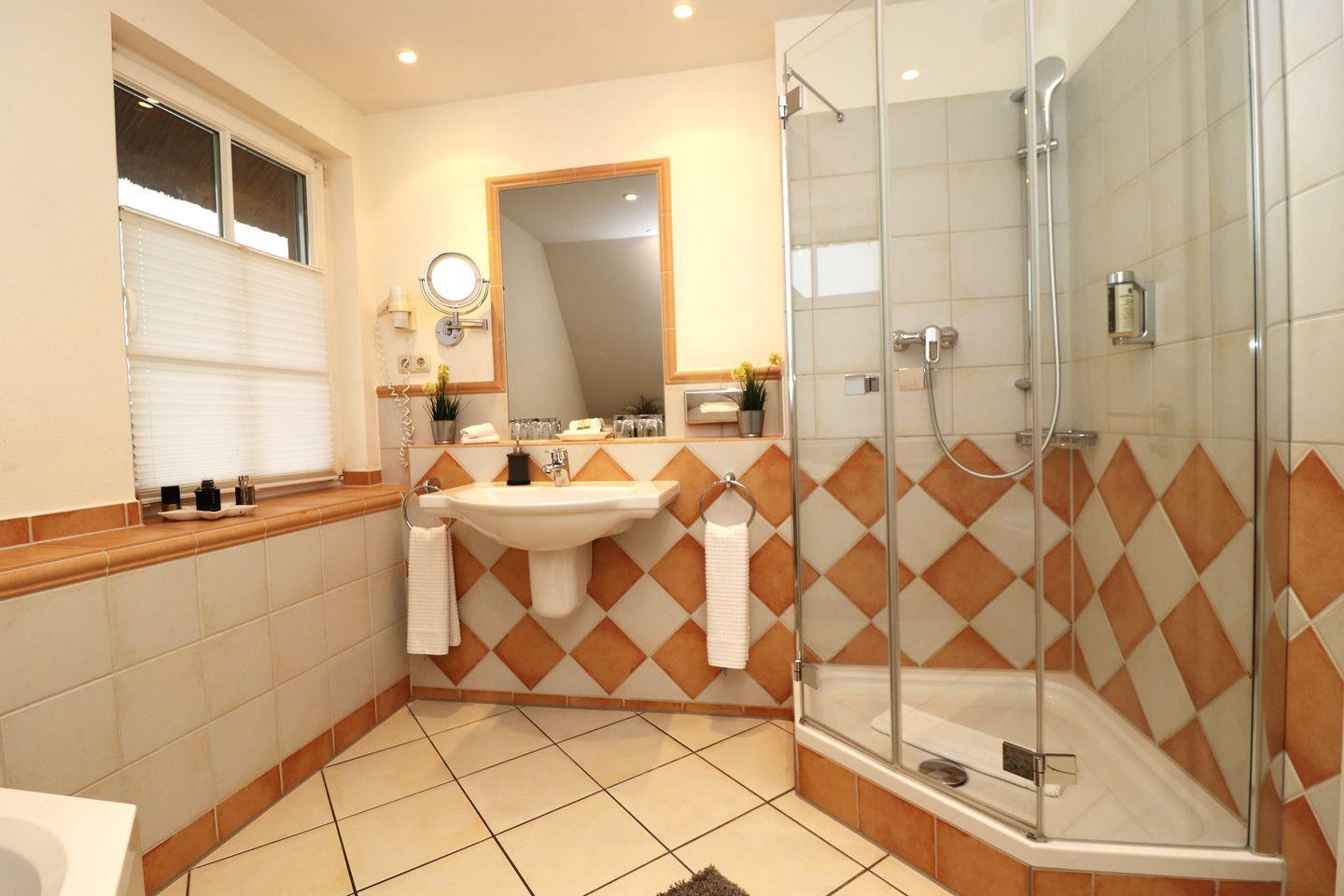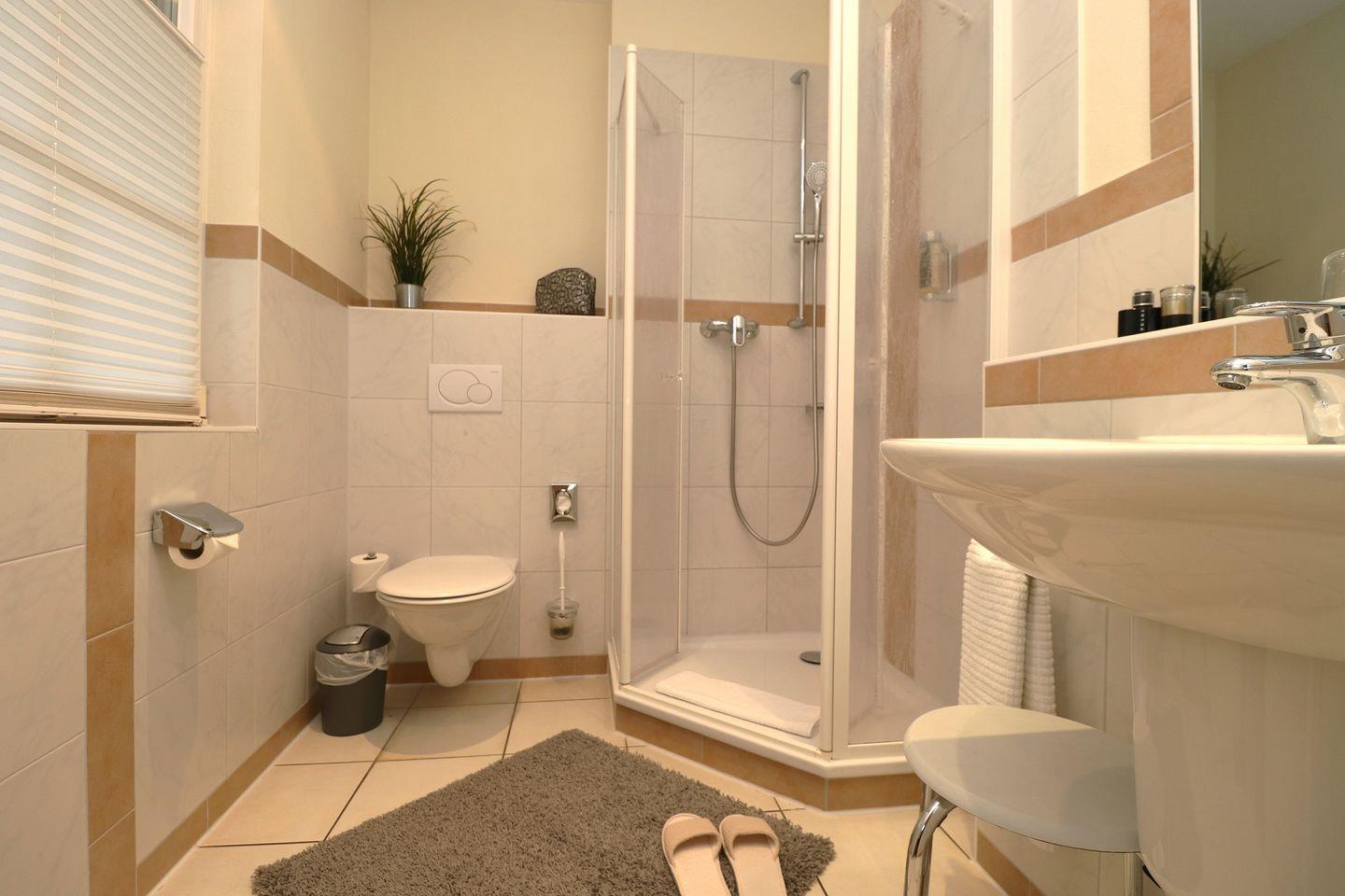 Im Obergeschoss erwarten Sie drei Schlafzimmer: zwei mit komfortablen Doppelbetten und TV sowie ein weiteres Schlafzimmer mit zwei Einzelbetten – ideal für Familien oder gemeinsam reisende Freunde. Das moderne Badezimmer verfügt über Dusche und Badewanne und bietet damit zusätzlichen Komfort.