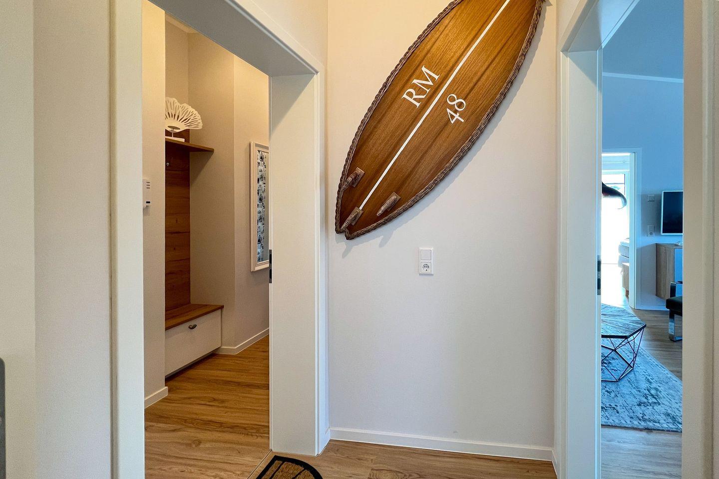 Unsere liebevoll eingerichtete Ferienwohnung in der 2. Etage einer modernen Wohnanlage vereint Stil und Komfort. Sie ist barrierefrei zugänglich und nur wenige Schritte vom Strand entfernt. Durch den kleinen, bezaubernden Waldabschnitt erreichen Sie in kürzester Zeit den feinen, weißen Sandstrand, wo ein bewachter Abschnitt mit Strandkorbvermietung auf Sie wartet. Die Wohnung selbst glänzt mit einer voll ausgestatteten Küche, die keine Wünsche offen lässt: Von der Spülmaschine über den Backofen bis hin zum Wasserkocher ist alles vorhanden, um kulinarische Genüsse zu kreieren. Der gemütliche Wohnbereich mit Kamin, Smart-TV und bequemer Sitzgruppe lädt zu entspannten Abenden ein. Der Balkon, westlich ausgerichtet, ist der ideale Ort, um den Sonnenuntergang zu genießen. Für Ihr Wohlbefinden sorgen moderne Annehmlichkeiten wie Fußbodenheizung im Badezimmer, ein Haartrockner und ein Handtuchtrockner. Sicherheit und Komfort garantieren Features wie Rauchmelder, Safe und ein privater Parkplatz direkt hinter dem Haus. Die Wohnung ist ein Nichtraucherdomizil, in dem Haustiere leider nicht gestattet sind, damit sich alle Gäste rundum wohlfühlen können.