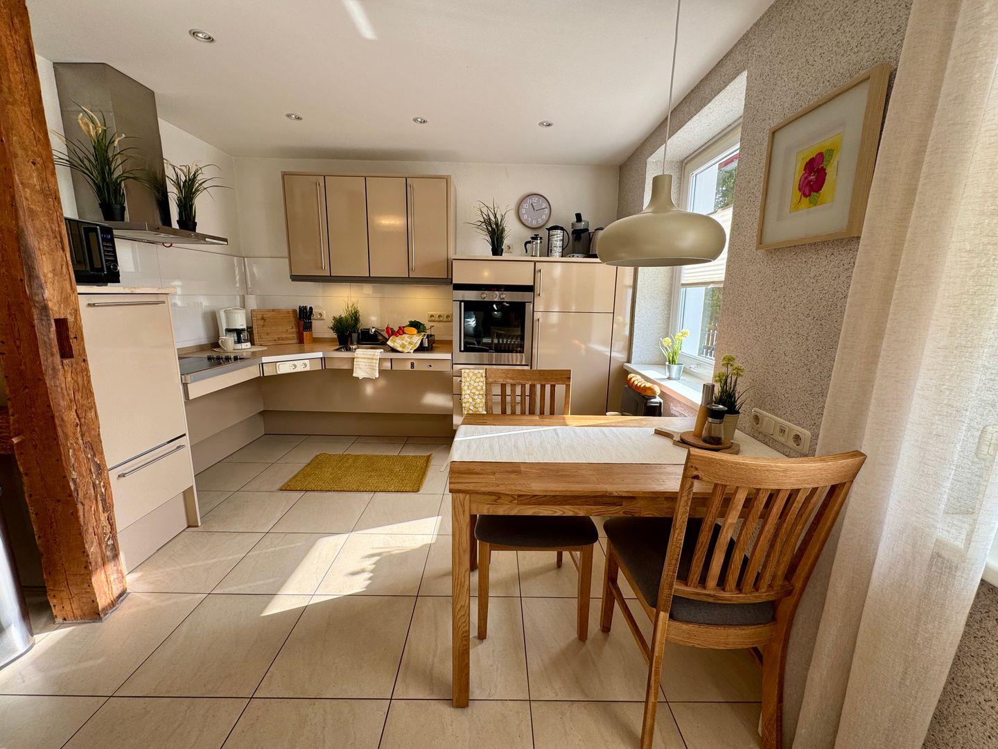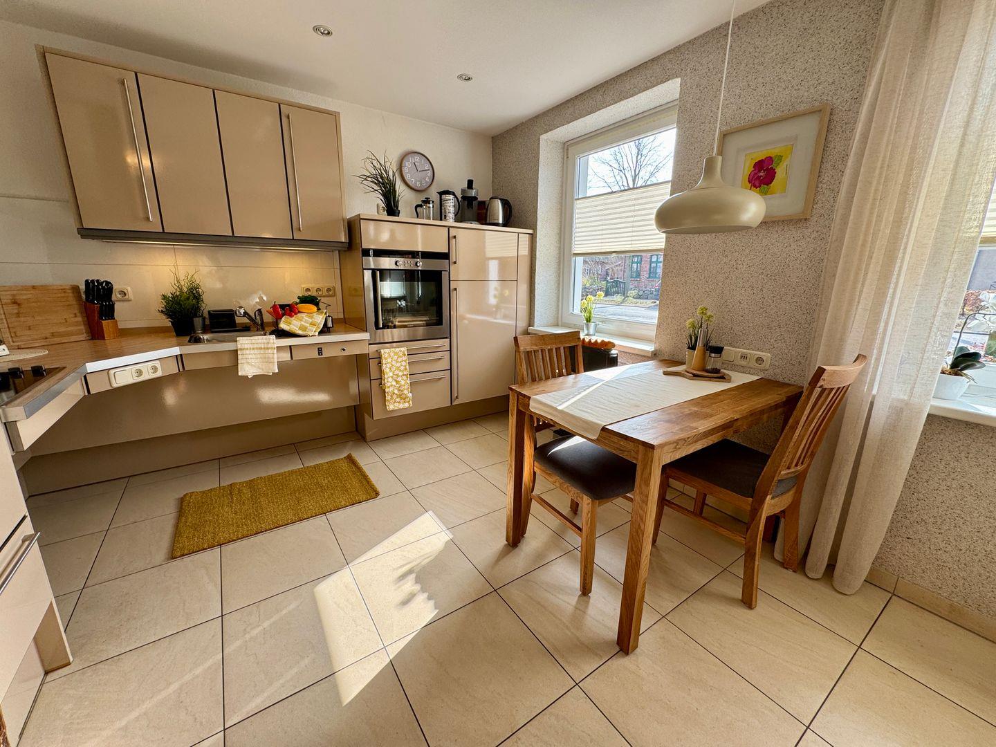 Der offen gestaltete Wohnbereich lädt mit einer gemütlichen Sofaecke, einem Kaminofen und moderner Unterhaltungstechnik zum Verweilen ein. Die barrierefreie Küche ist durchdacht eingerichtet: höhenverstellbare Arbeitsflächen, unterfahrbare Elemente und ein rollstuhlgerechter Backofen ermöglichen komfortables Kochen ohne Einschränkungen. Der Essbereich fügt sich harmonisch ein und schafft eine einladende Atmosphäre für gemeinsame Mahlzeiten.