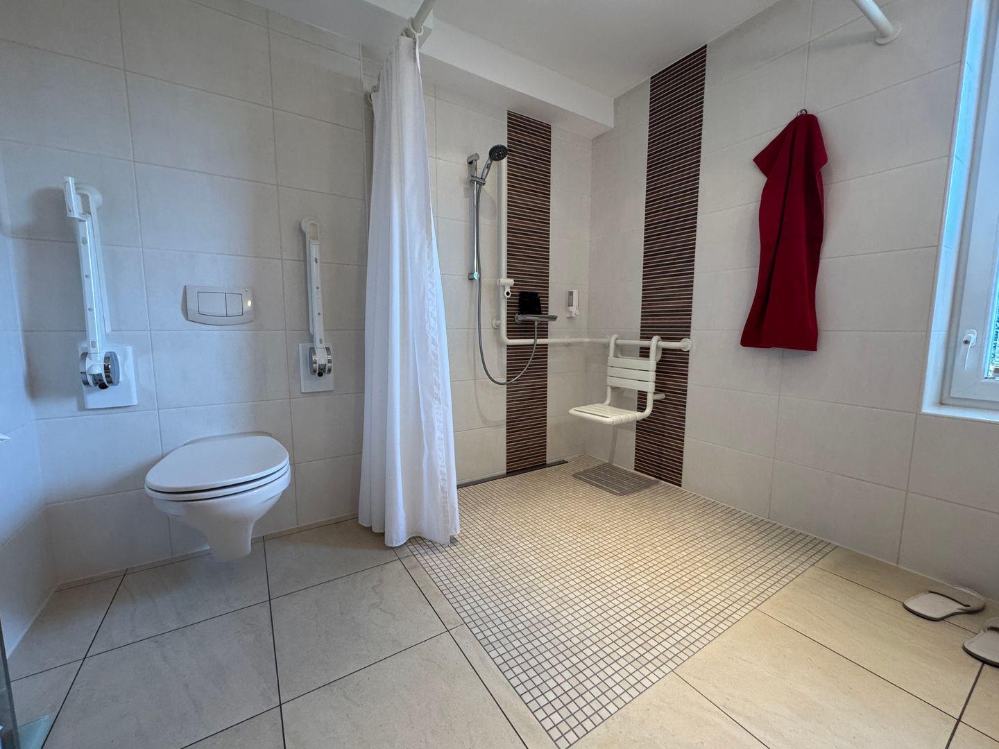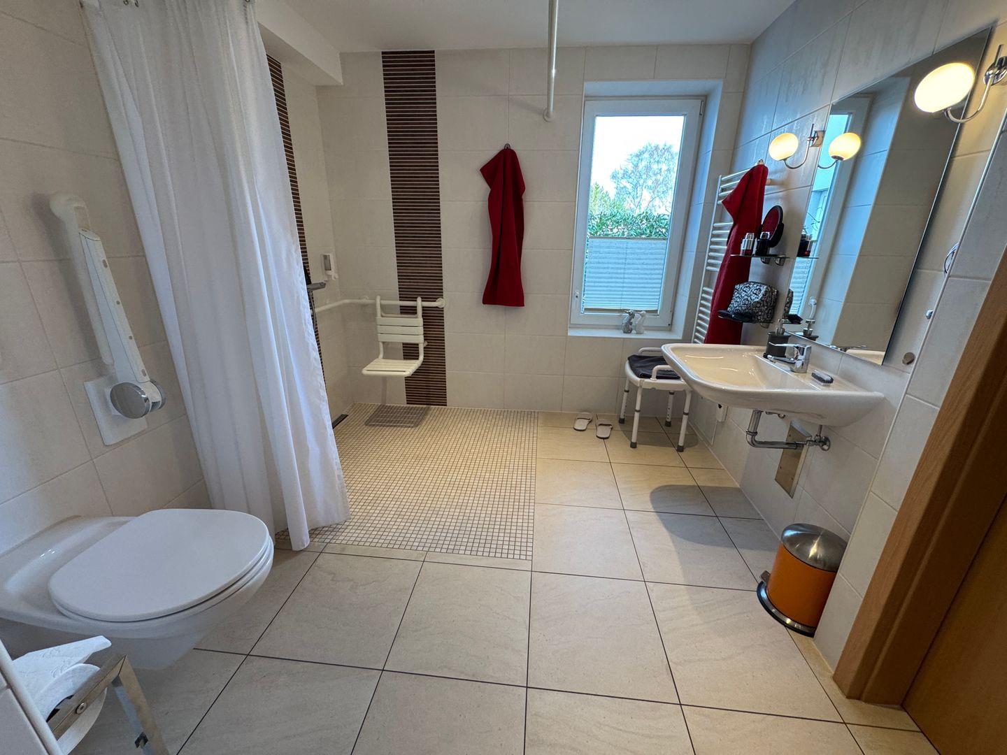 Im Schlafzimmer finden Sie ein bequemes Bett mit viel Platz zum Rangieren, ergänzt durch einen stimmungsvollen Sternenhimmel für entspannte Abende. Das großzügige, behindertengerechte Bad verfügt über eine bodengleiche Dusche mit Sitzgelegenheit und Tageslicht, sodass Komfort und Funktionalität perfekt aufeinander abgestimmt sind.