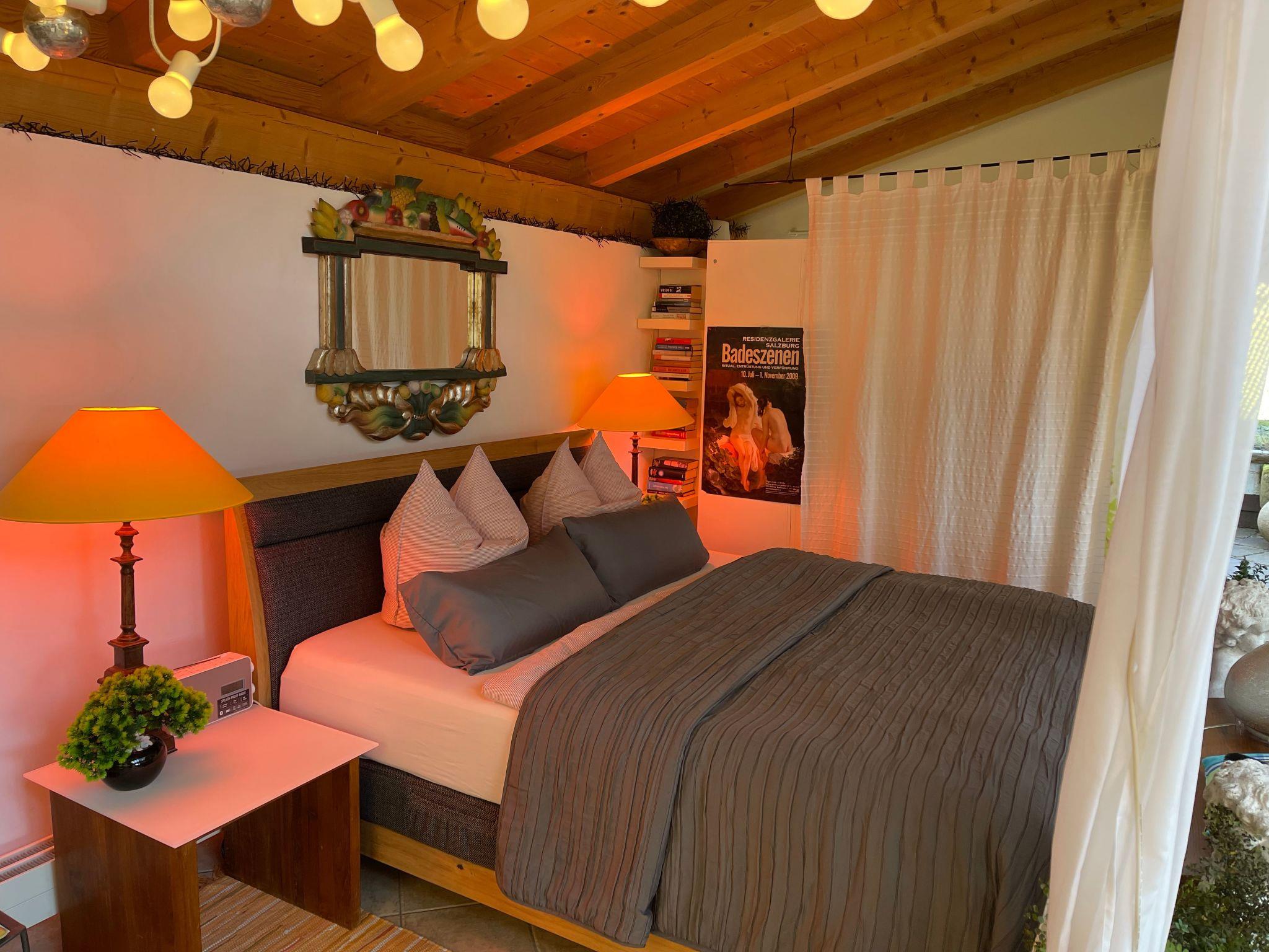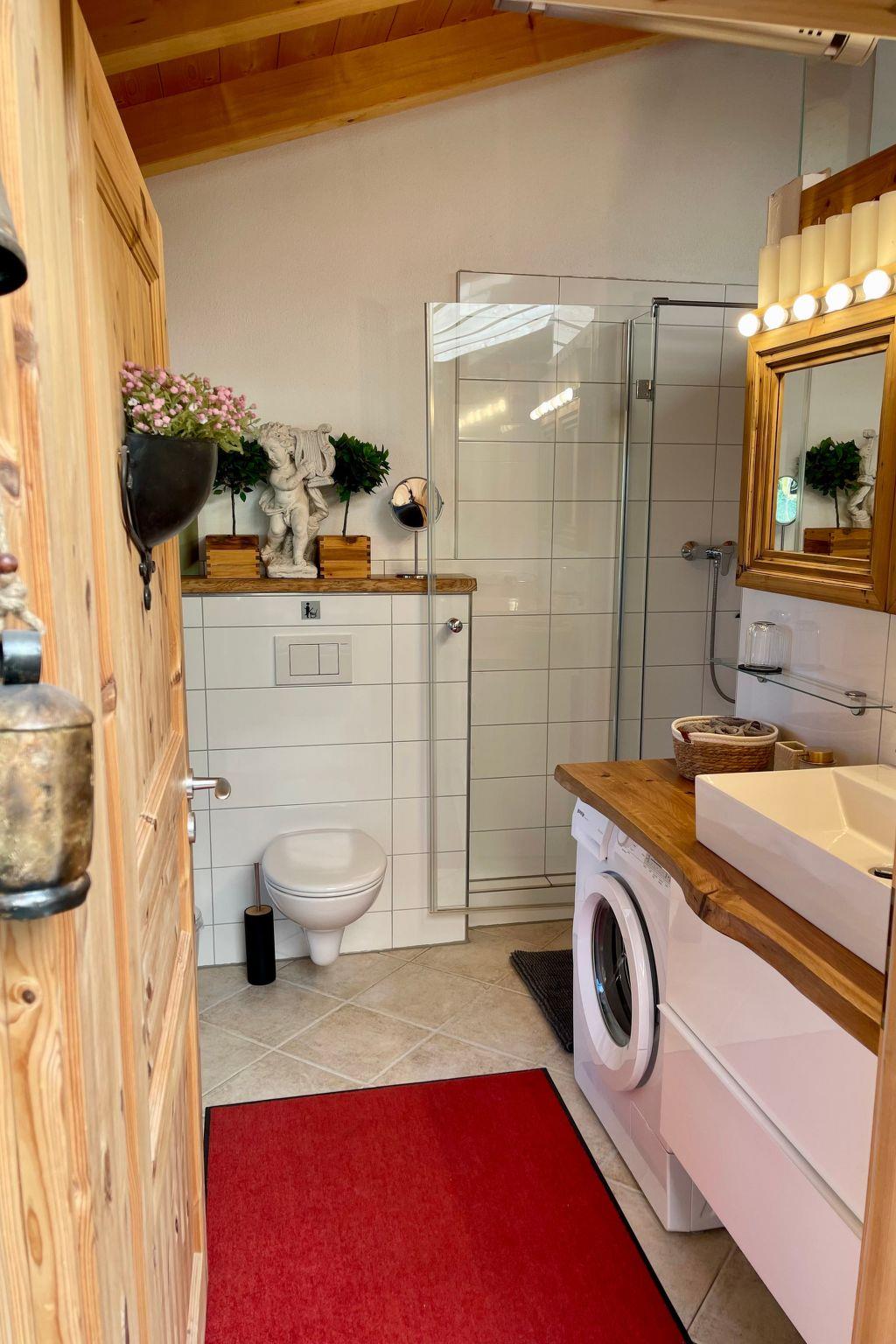 The outdoor area contributes significantly to the recreational value of your stay. Enjoy relaxing hours on your own terrace, which invites you to barbecue, or explore the wild and romantic garden, which is available for exclusive use. As a special highlight, our alpine meadow awaits you 1 km away, which impresses with a fantastic panoramic view of the Bavarian and Tyrolean Alps - perfect for unforgettable barbecue evenings in the open air.