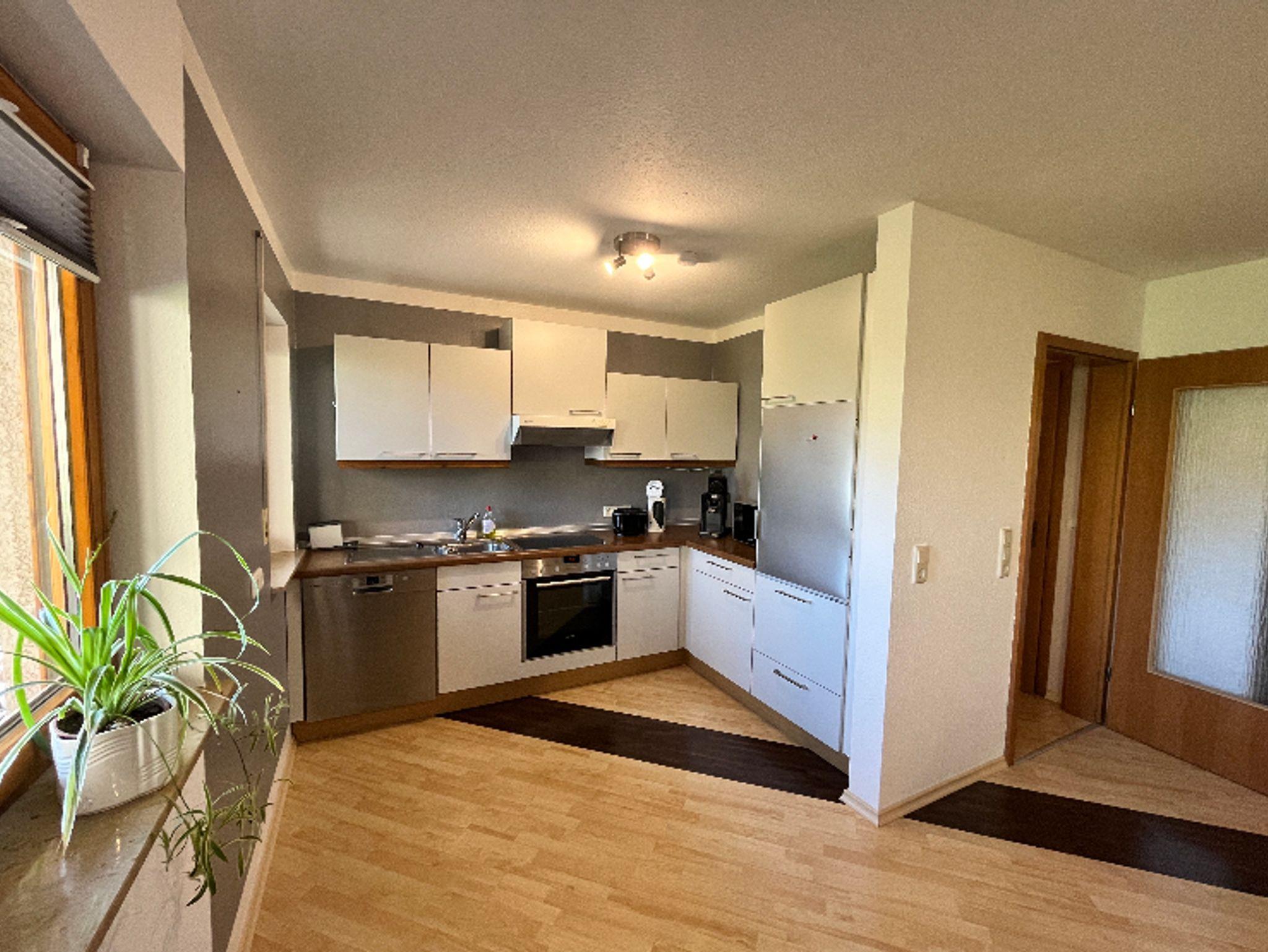 Cerankochfeld, Backofen, Spülmaschine, Dunstabzug, Toaster, Wasserkocher, Kühlschrank mit Gefrierfach, Kaffeemaschine, Toaster, Eierkocher, Geschirrtücher.