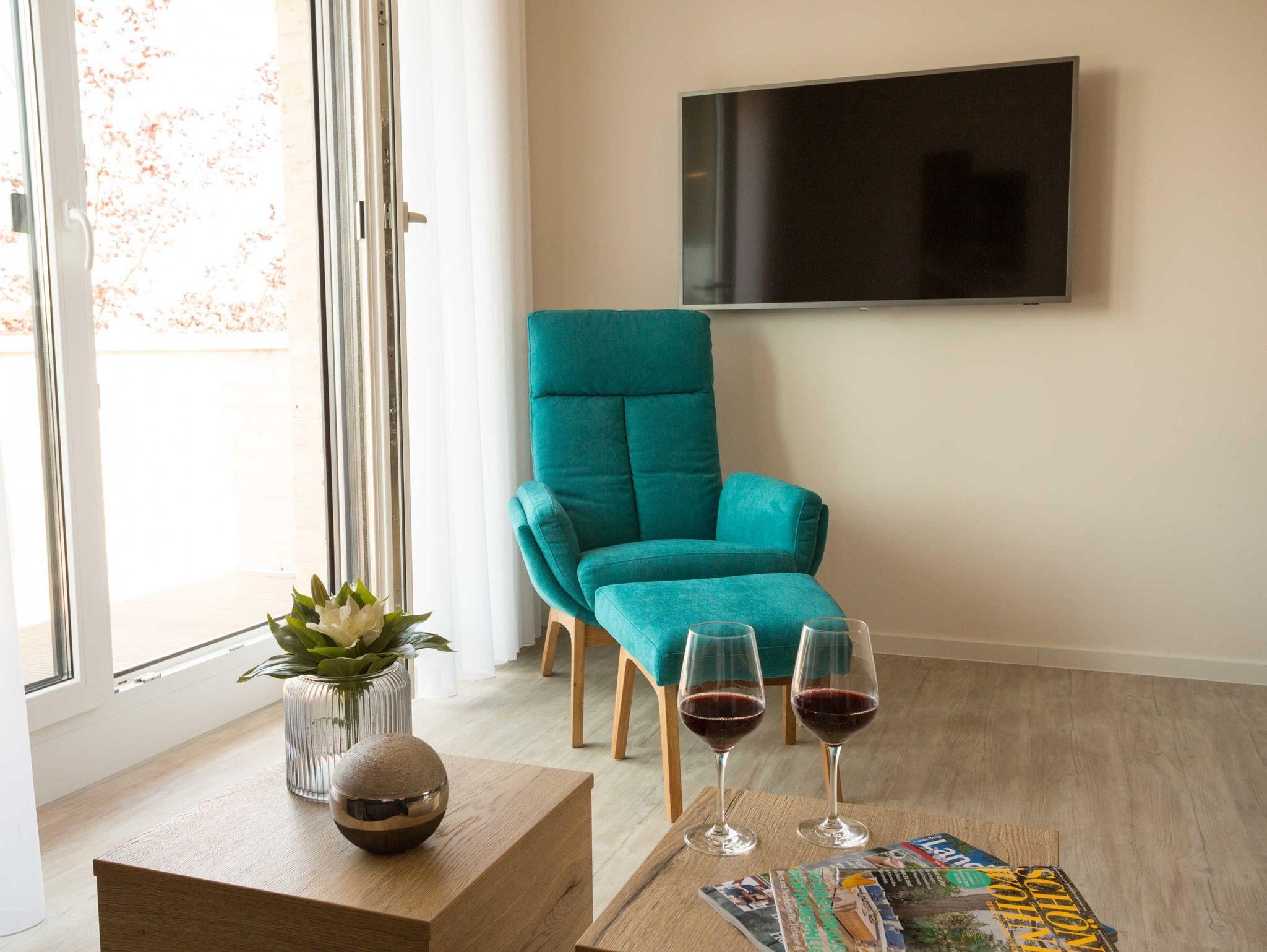 Hochwertig ausgestattetes Penthouse-Apartment mit Dachterrasse. Moderne Einbauküche mit Ceranfeld und Backofen, Mikrowelle, Toaster, Kaffee-Padmaschine, Wasserkocher, Geschirr, Gläser usw.. Es gibt zwei getrennte Schlafzimmer mit Doppelbetten im Penthouse Deluxe. Auf unserem gemütlichem Schlafsofa haben bequem zwei Kinder Platz zum Schlafen. In unseren Box-Springbetten werden Sie als Eltern himmlisch schlafen.