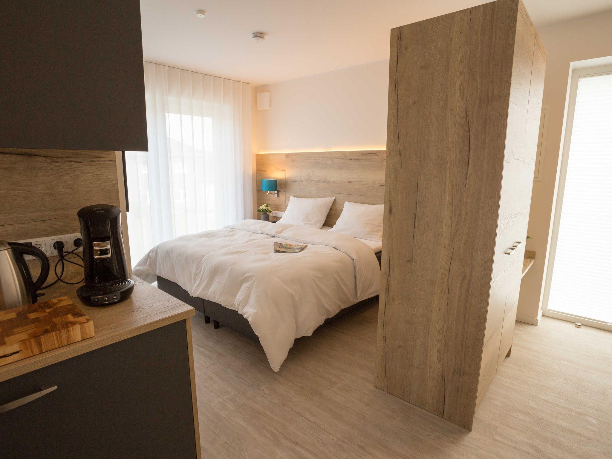 Hochwertig ausgestattetes Apartment. Moderne Einbauküche mit Ceranfeld, Mikrowelle, Toaster, Kaffee-Padmaschine, Wasserkocher, Geschirr, Gläser usw.. Auf unserem gemütlichem Schlafsofa haben bequem zwei Kinder Platz zum Schlafen. In unseren Box-Springbetten werden Sie als Eltern himmlisch schlafen.