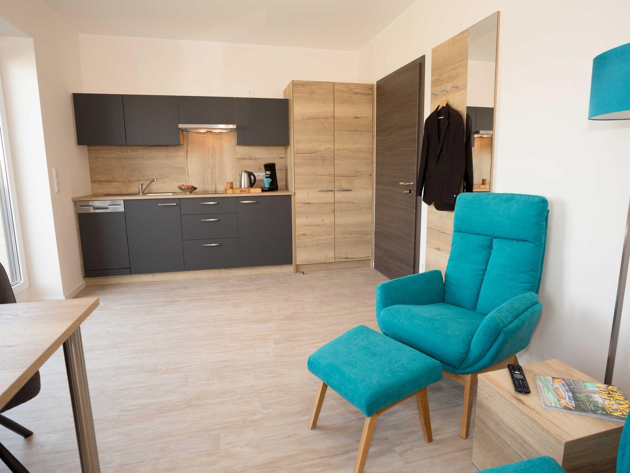 Hochwertig ausgestattetes Penthouse-Apartment mit Dachterrasse. Moderne Einbauküche mit Ceranfeld, Mikrowelle, Toaster, Kaffee-Padmaschine, Wasserkocher, Geschirr, Gläser usw.. Zwei bequeme Sessel mit jeweils einem Fußhocker laden zum verweilen ein . In unseren Box-Springbetten werden Sie himmlisch schlafen.
