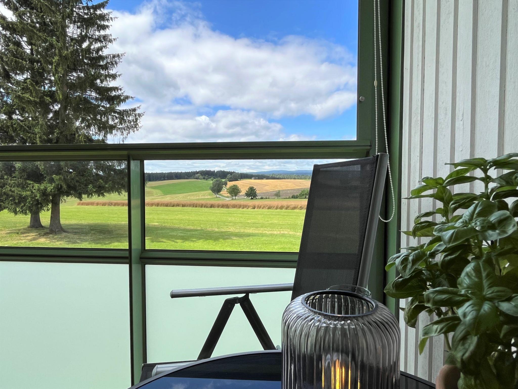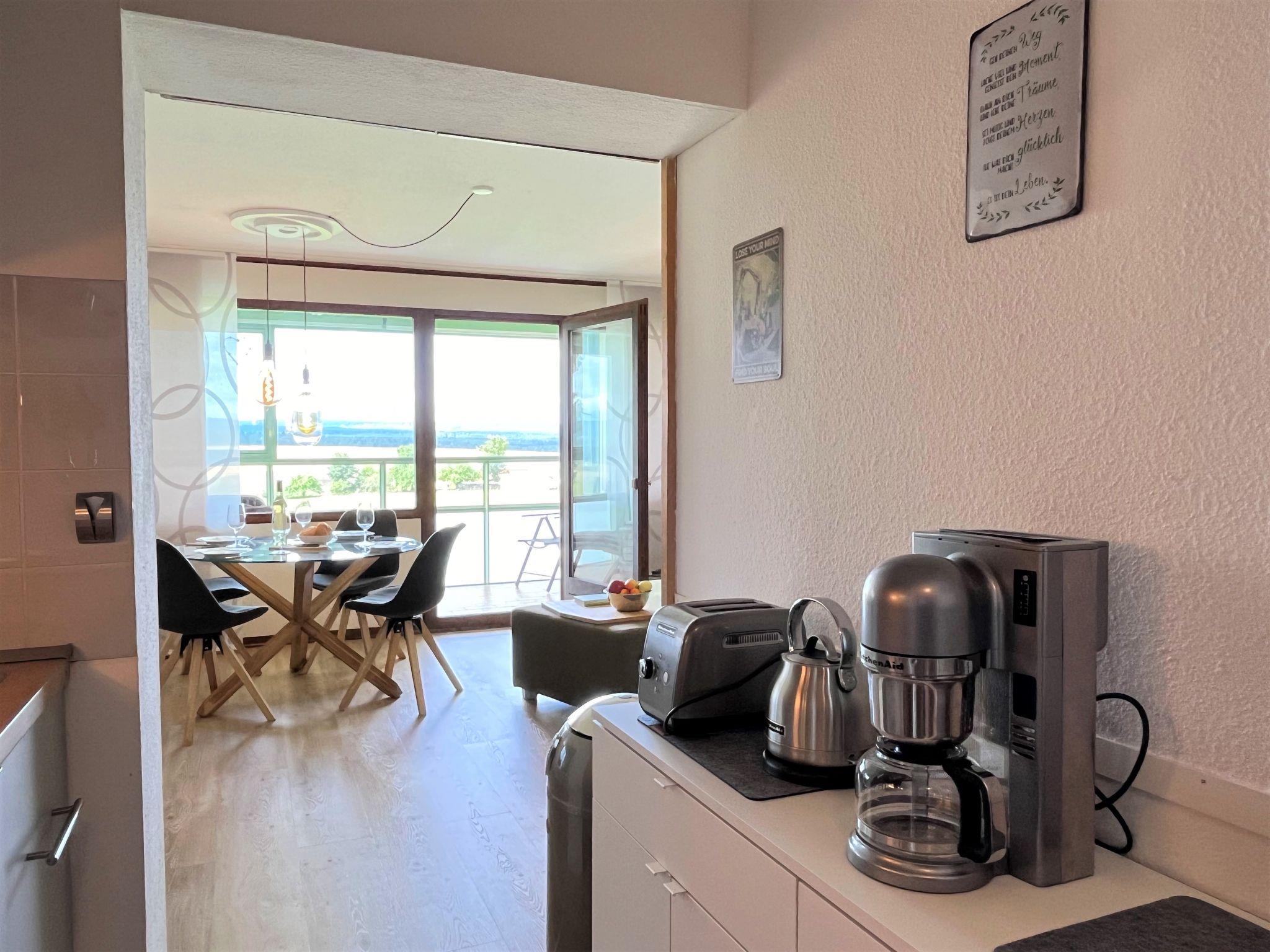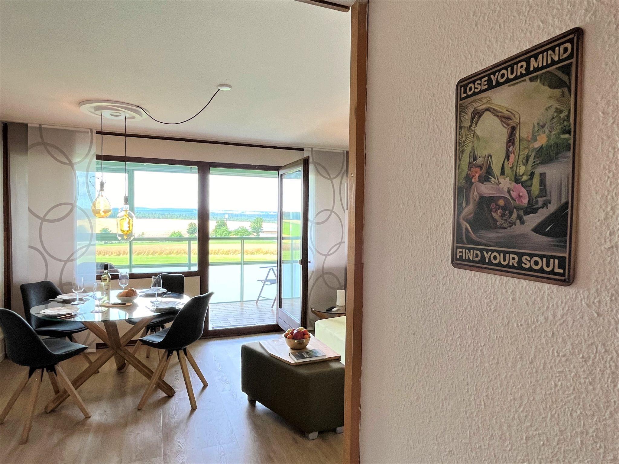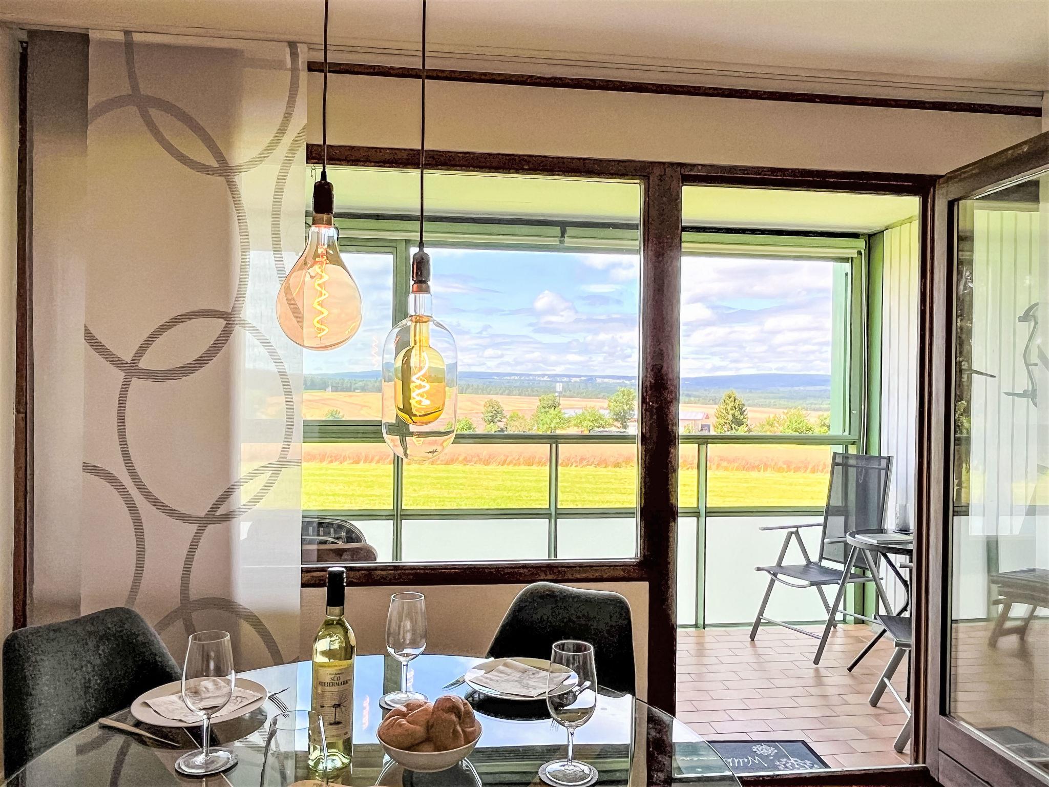 "Lichtblick", 1-room apartment 36 m2, on the ground floor. Bright, partly renovated in 2024, modern and tasteful furnishings: living/sleeping room with 1 sofabed (80 cm, length 200 cm), 1 double bed (2 x 80 cm, length 200 cm), satellite TV (flat screen). Exit to the balcony. Kitchenette (dishwasher, 2 induction hot plates, toaster, kettle, electric coffee machine, combination microwave). Shower/WC. Heating. Balcony. Balcony furniture. Beautiful view of the countryside. Facilities: Internet (WiFi, free). Parking (1 car) at the house. Please note: non-smokers only. Maximum 1 pet/ dog allowed. Smoke alarm. The balcony is glazed. The double bed (box spring) consists of two bed sections (80 x 200 cm each), which can be pushed apart and configured as single beds if required.