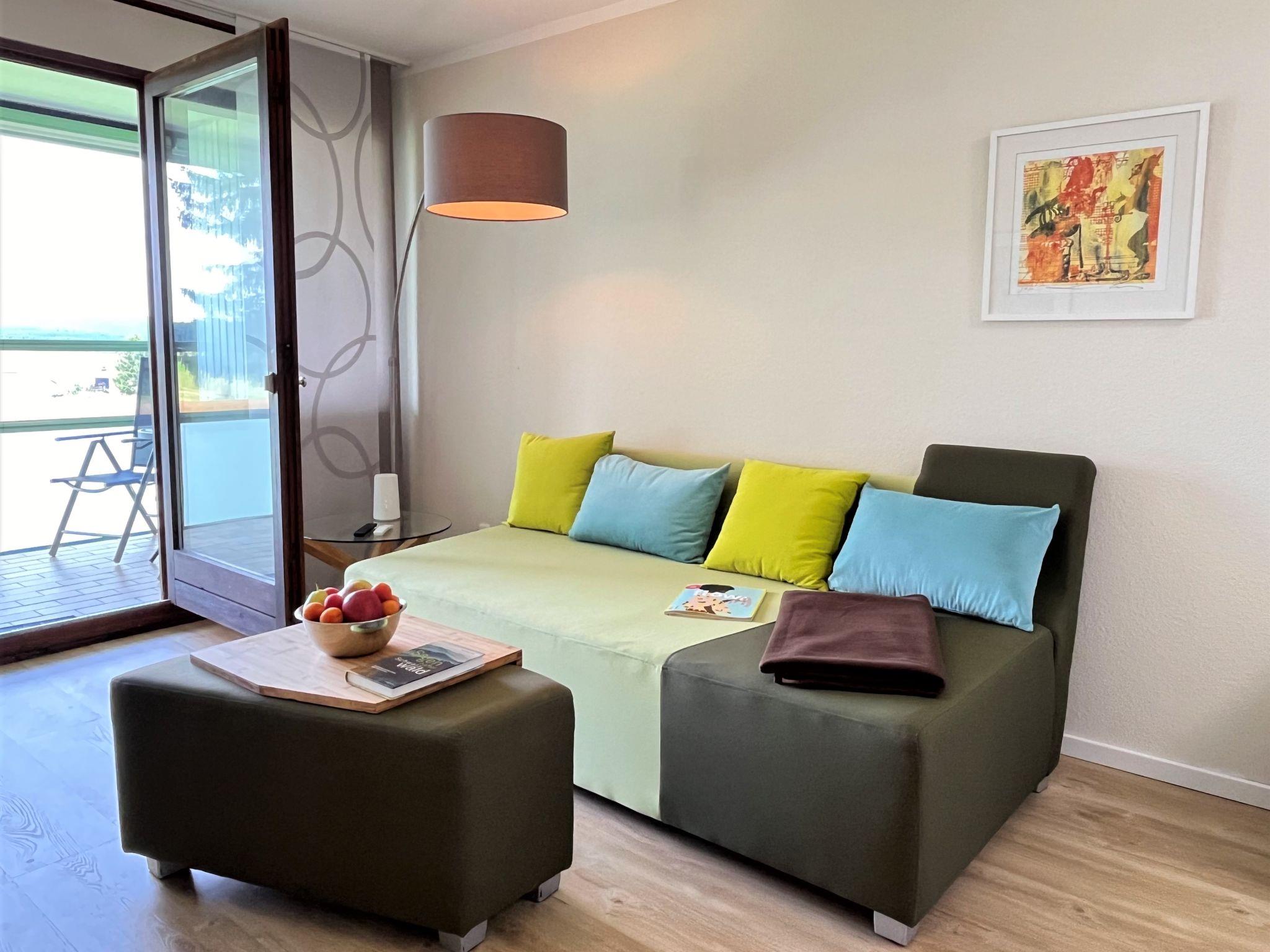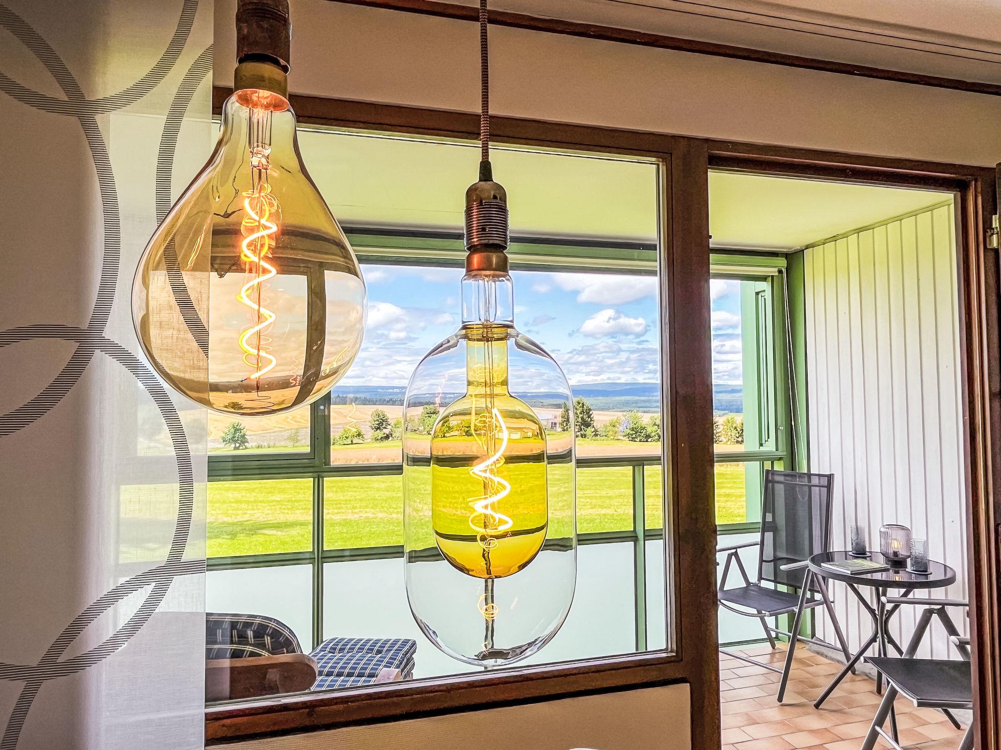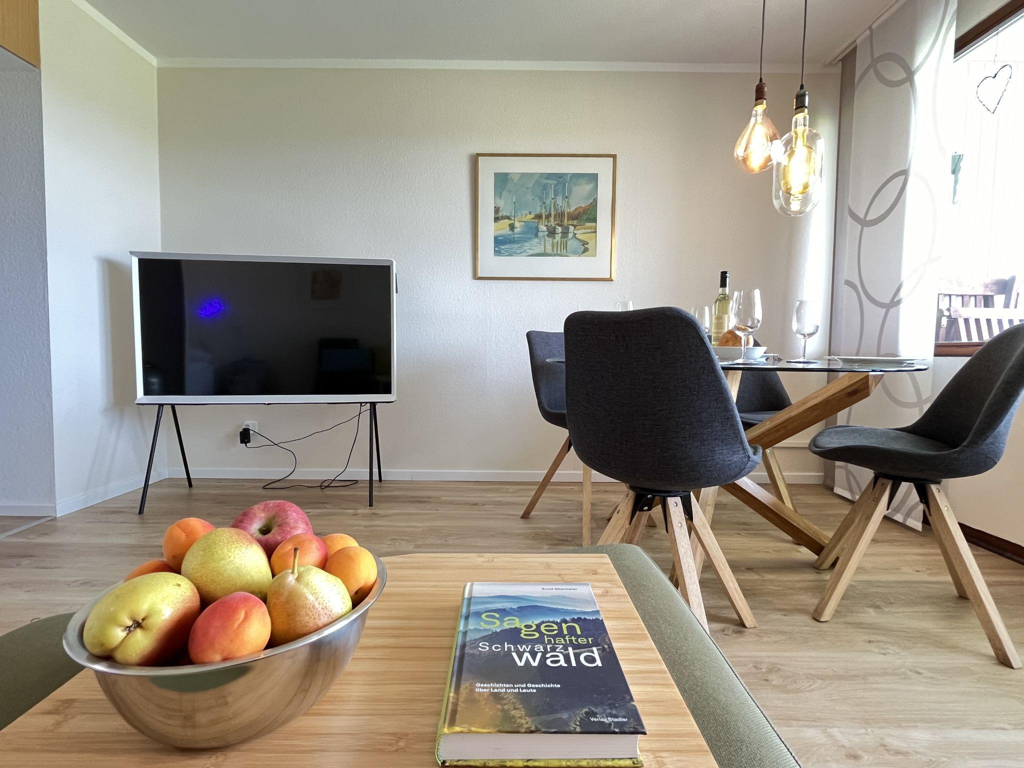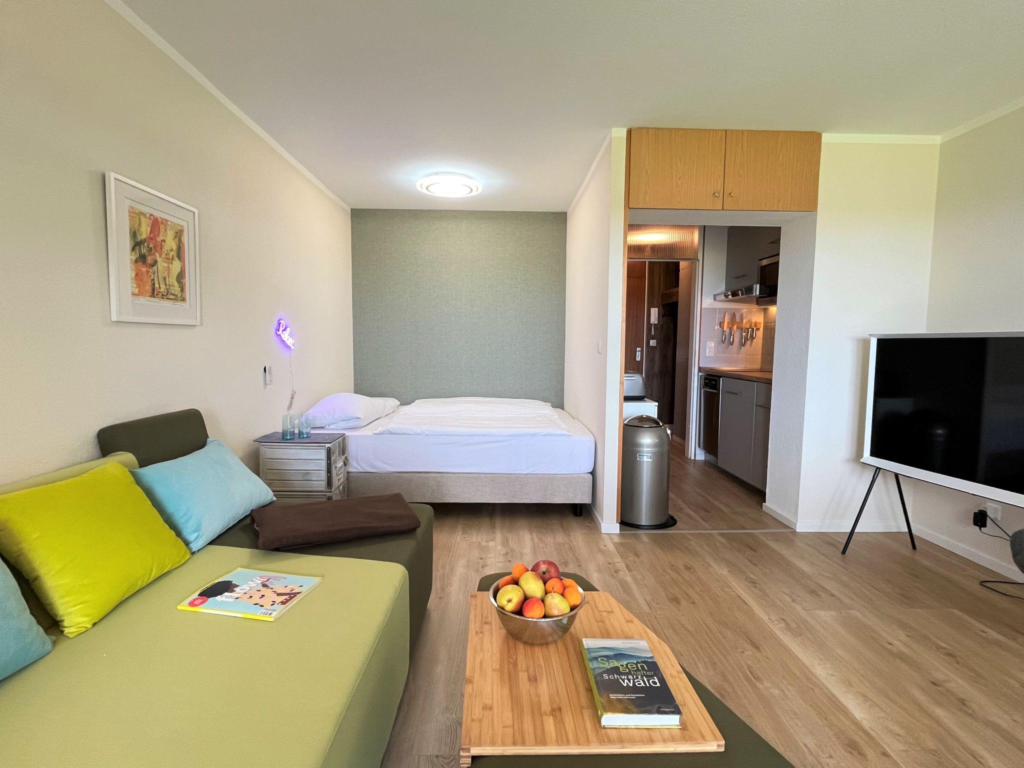 "Lichtblick", 1-room apartment 36 m2, on the ground floor. Bright, partly renovated in 2024, modern and tasteful furnishings: living/sleeping room with 1 sofabed (80 cm, length 200 cm), 1 double bed (2 x 80 cm, length 200 cm), satellite TV (flat screen). Exit to the balcony. Kitchenette (dishwasher, 2 induction hot plates, toaster, kettle, electric coffee machine, combination microwave). Shower/WC. Heating. Balcony. Balcony furniture. Beautiful view of the countryside. Facilities: Internet (WiFi, free). Parking (1 car) at the house. Please note: non-smokers only. Maximum 1 pet/ dog allowed. Smoke alarm. The balcony is glazed. The double bed (box spring) consists of two bed sections (80 x 200 cm each), which can be pushed apart and configured as single beds if required.