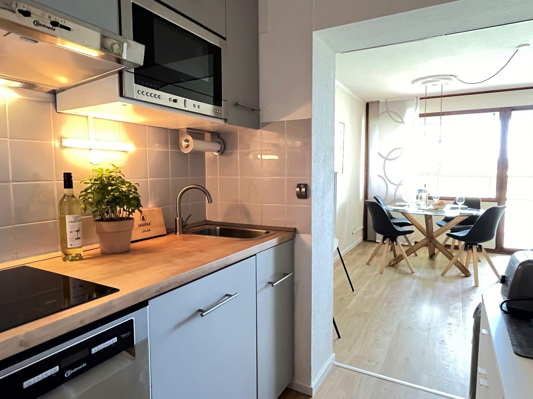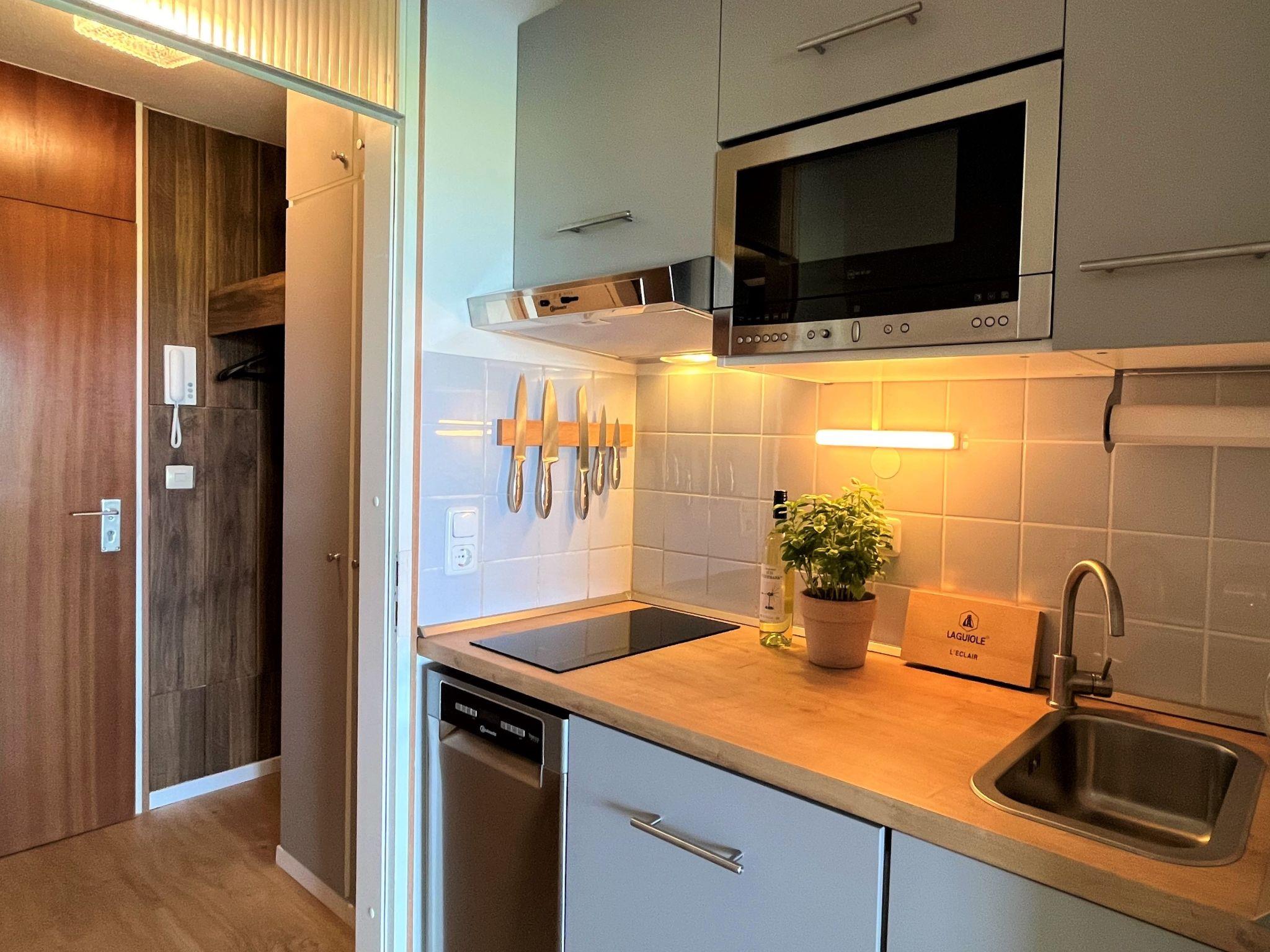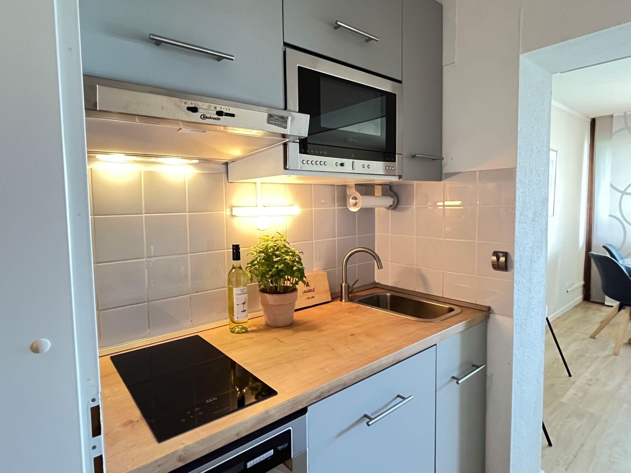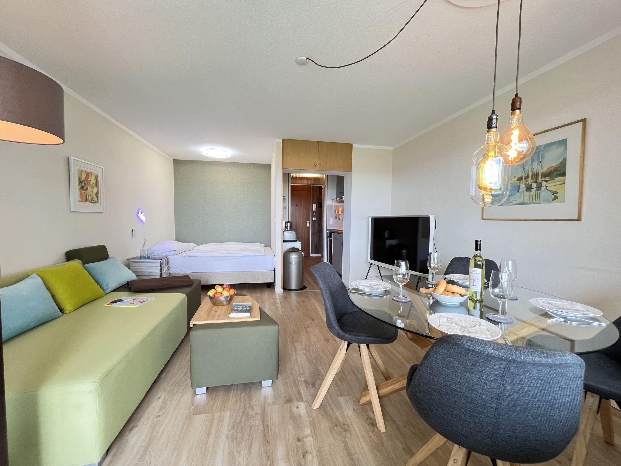 "Lichtblick", 1-room apartment 36 m2, on the ground floor. Bright, partly renovated in 2024, modern and tasteful furnishings: living/sleeping room with 1 sofabed (80 cm, length 200 cm), 1 double bed (2 x 80 cm, length 200 cm), satellite TV (flat screen). Exit to the balcony. Kitchenette (dishwasher, 2 induction hot plates, toaster, kettle, electric coffee machine, combination microwave). Shower/WC. Heating. Balcony. Balcony furniture. Beautiful view of the countryside. Facilities: Internet (WiFi, free). Parking (1 car) at the house. Please note: non-smokers only. Maximum 1 pet/ dog allowed. Smoke alarm. The balcony is glazed. The double bed (box spring) consists of two bed sections (80 x 200 cm each), which can be pushed apart and configured as single beds if required.
