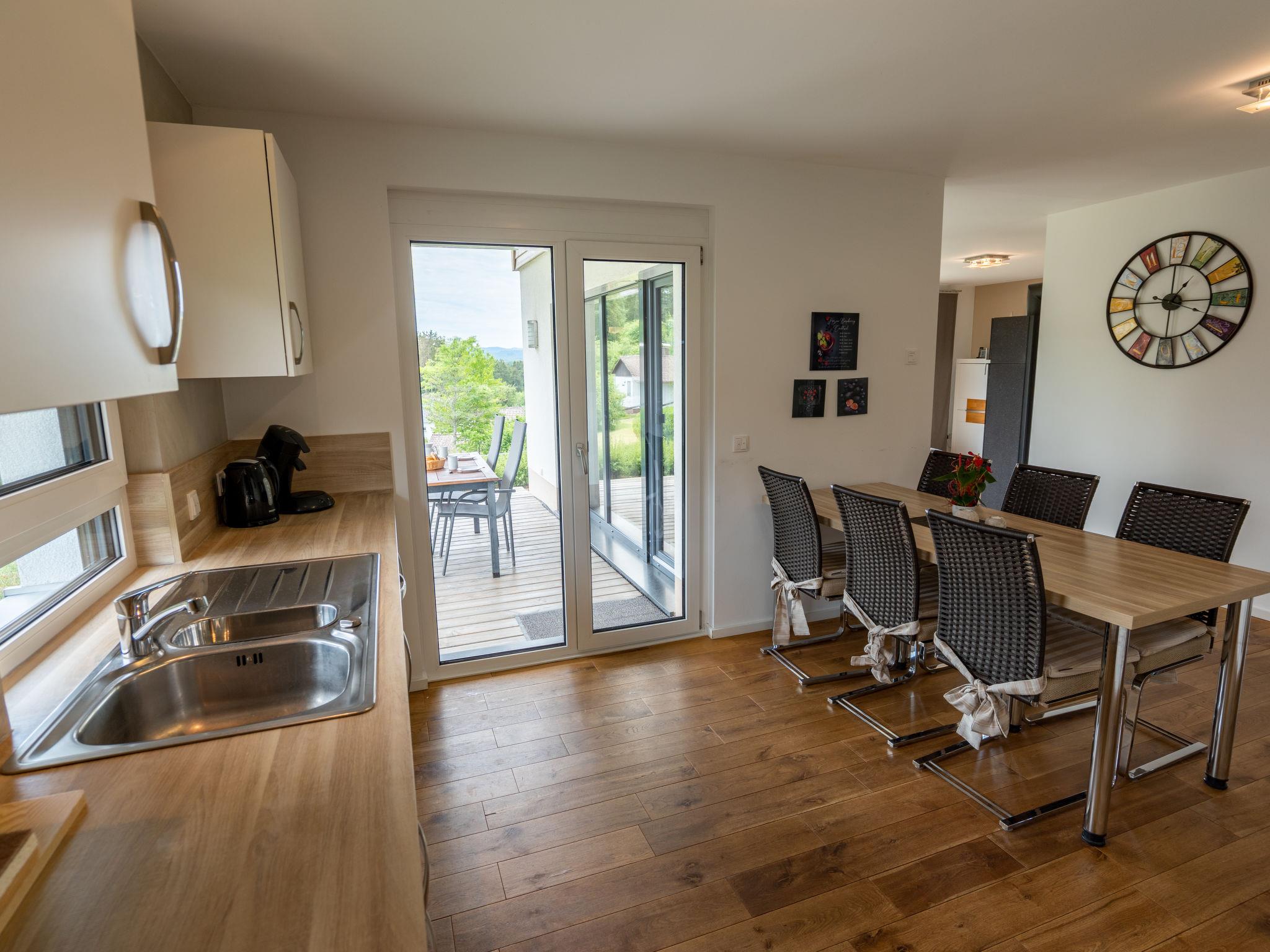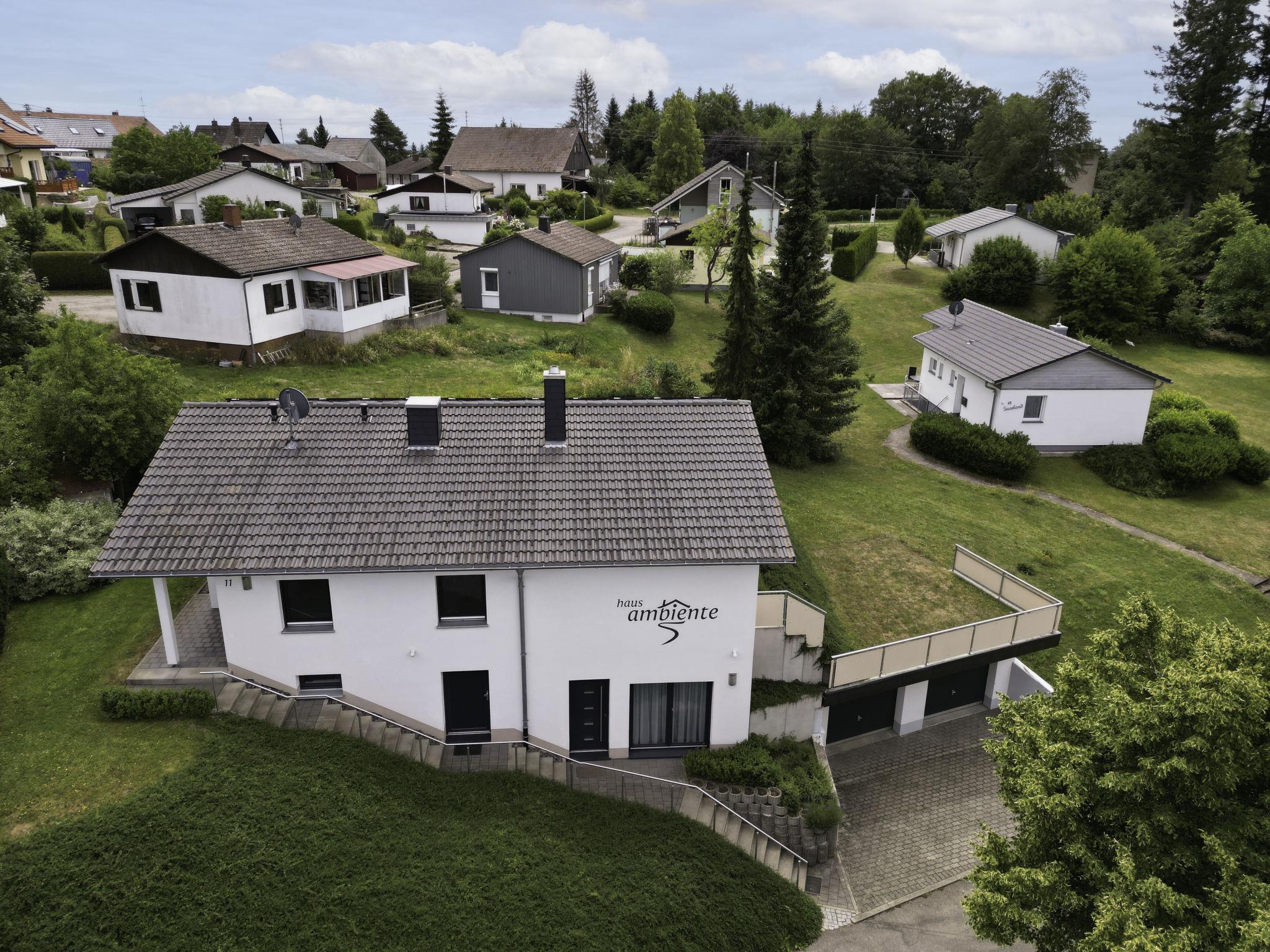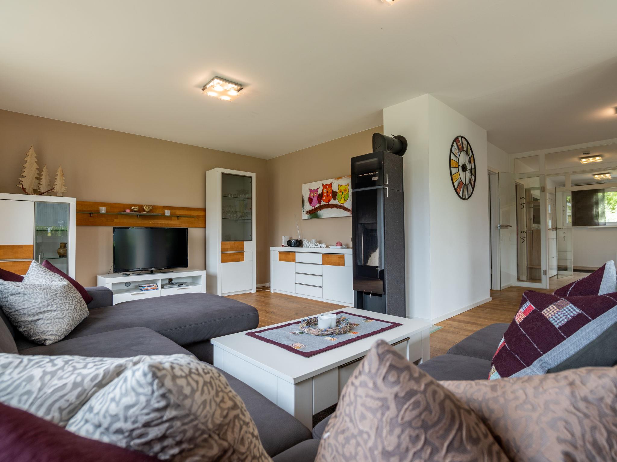 "Ambiente", 4-room house 110 m2 on 2 levels. Bright, modern and tasteful furnishings: large living/dining room with panoramic window with Scandinavian wood stove and satellite TV (flat screen), radio, CD-player and DVD. Exit to the terrace. 1 room with 1 double bed (2 x 90 cm, length 200 cm). 1 room with 2 beds (90 cm, length 200 cm). Open kitchen (oven, dishwasher, 4 ceramic glass hob hotplates, toaster, kettle, microwave, electric coffee machine). Sep. WC, bath/shower/WC. On the lower ground floor: (exterior staircase), 1 room with 1 double bed (2 x 90 cm, length 200 cm), satellite TV (flat screen). Shower/WC. Large terrace 20 m2. Terrace furniture, electric barbecue (portable). Marvellous view of the countryside. Facilities: washing machine, dryer, telephone, iron, children's high chair, baby cot, hair dryer. Internet (WiFi, free). Garage (2 cars). Please note: non-smoking house. Smoke alarm, fire extinguisher. The basement is only accessible by a separate entrance. Bookings accepted for holiday purposes only.