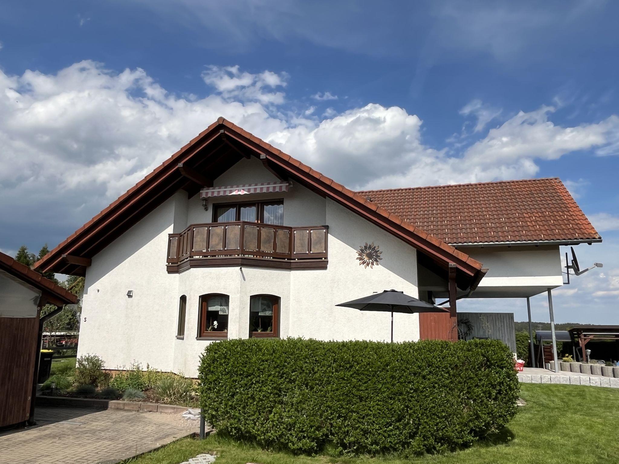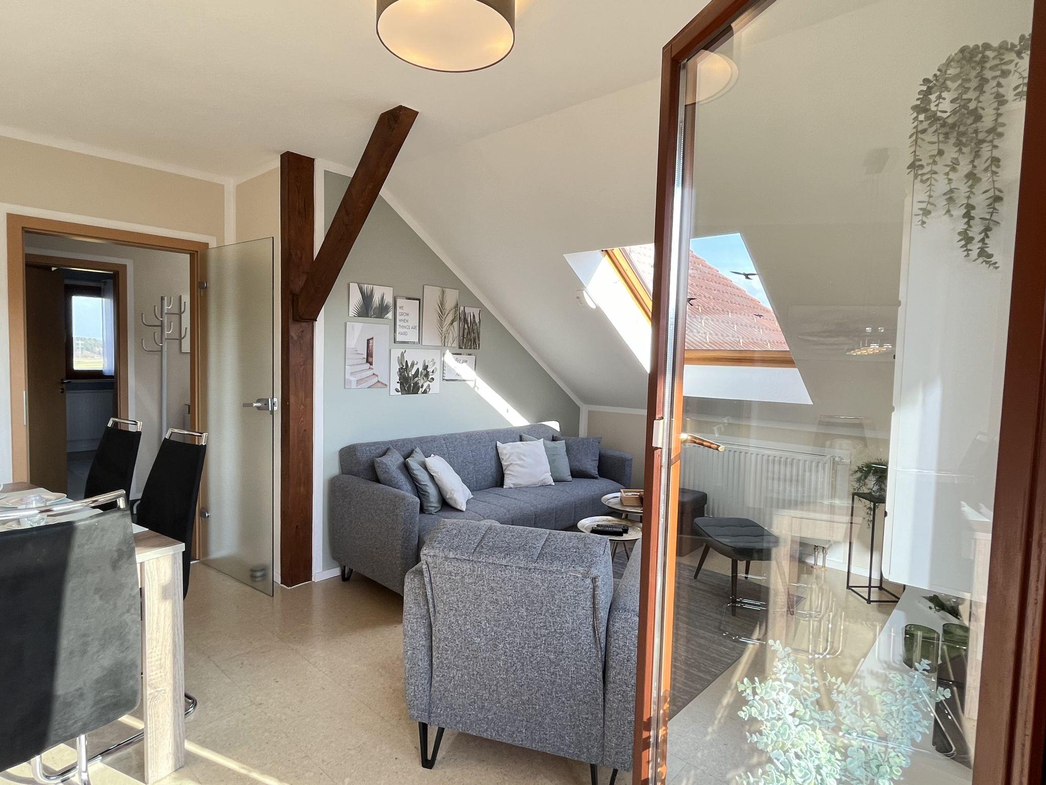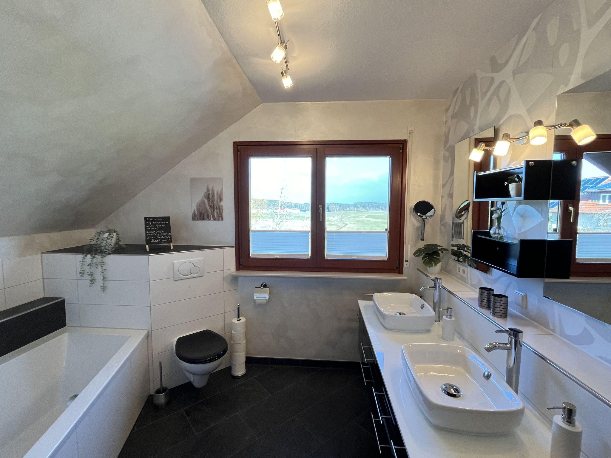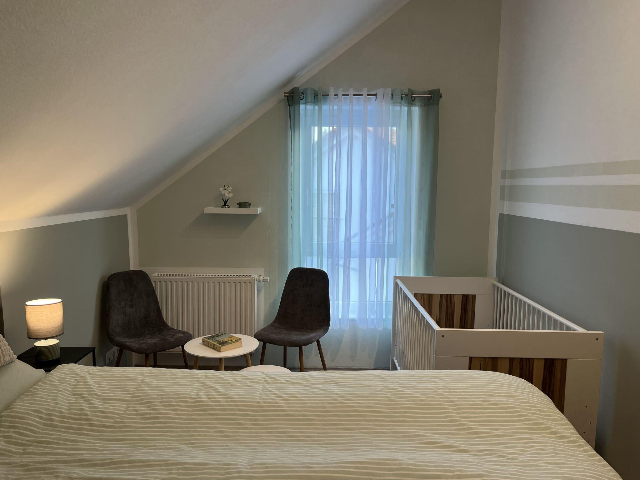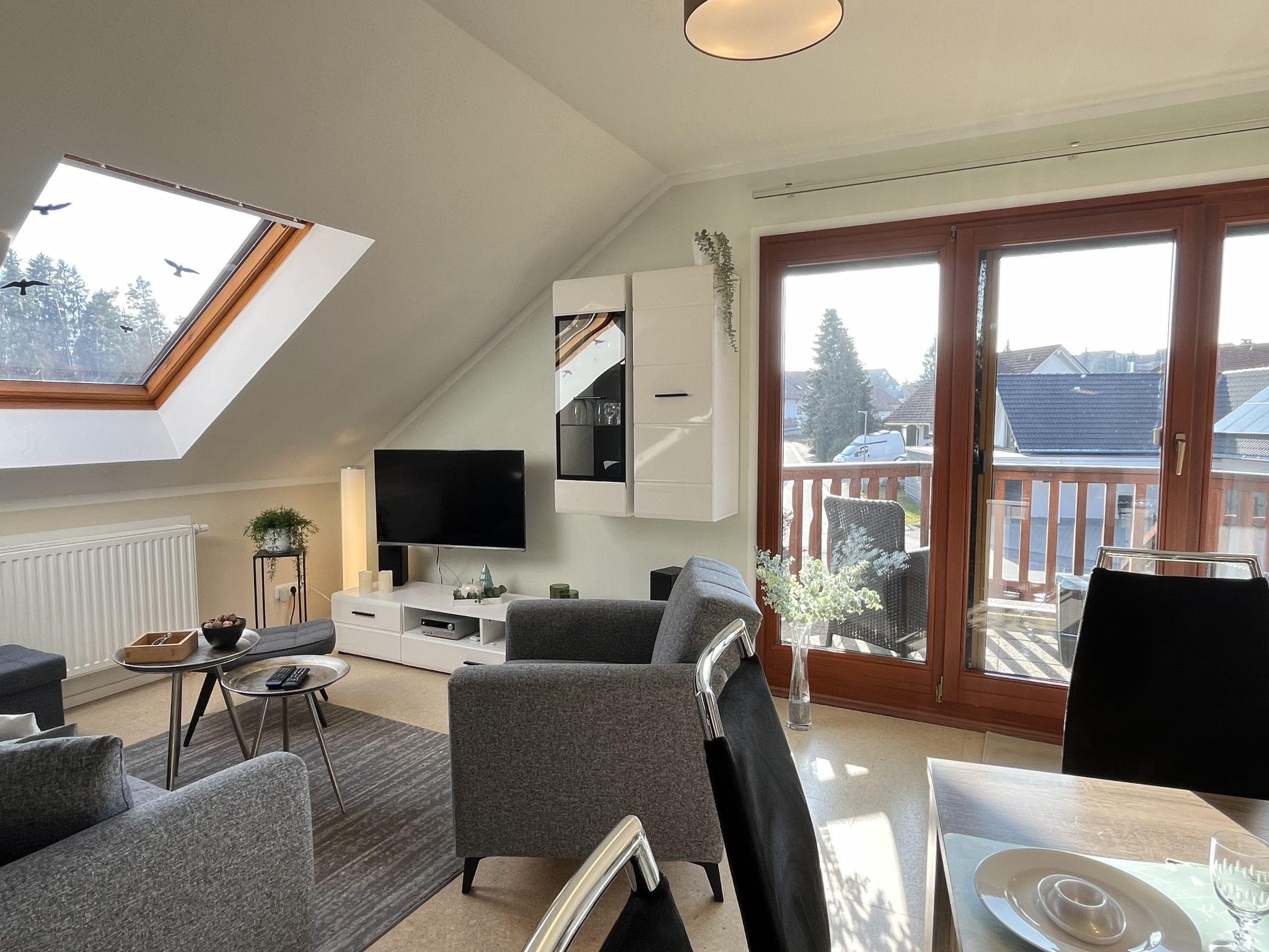 4-room apartment 90 m2, on the top floor. Spacious and bright, partly with sloping ceilings, fully renovated in 2023, very beautiful and tasteful furnishings: living/dining room with dining table and satellite TV (flat screen), radio, CD-player and hi-fi system. Exit to the balcony. 3 double bedrooms, each room with 1 double bed (180 cm, length 200 cm). Open kitchen (oven, dishwasher, 4 ceramic glass hob hotplates, toaster, kettle, microwave, electric coffee machine). Bath/shower/WC with corner bath. Heating. Balcony, south facing position, patio. Terrace furniture, balcony furniture, barbecue (portable). Marvellous view of the countryside. Facilities: iron, children's high chair, baby cot (extra), hair dryer. Internet (WiFi, free). Parking (2 cars) at the house. Please note: non-smokers only. Smoke alarm, fire extinguisher.