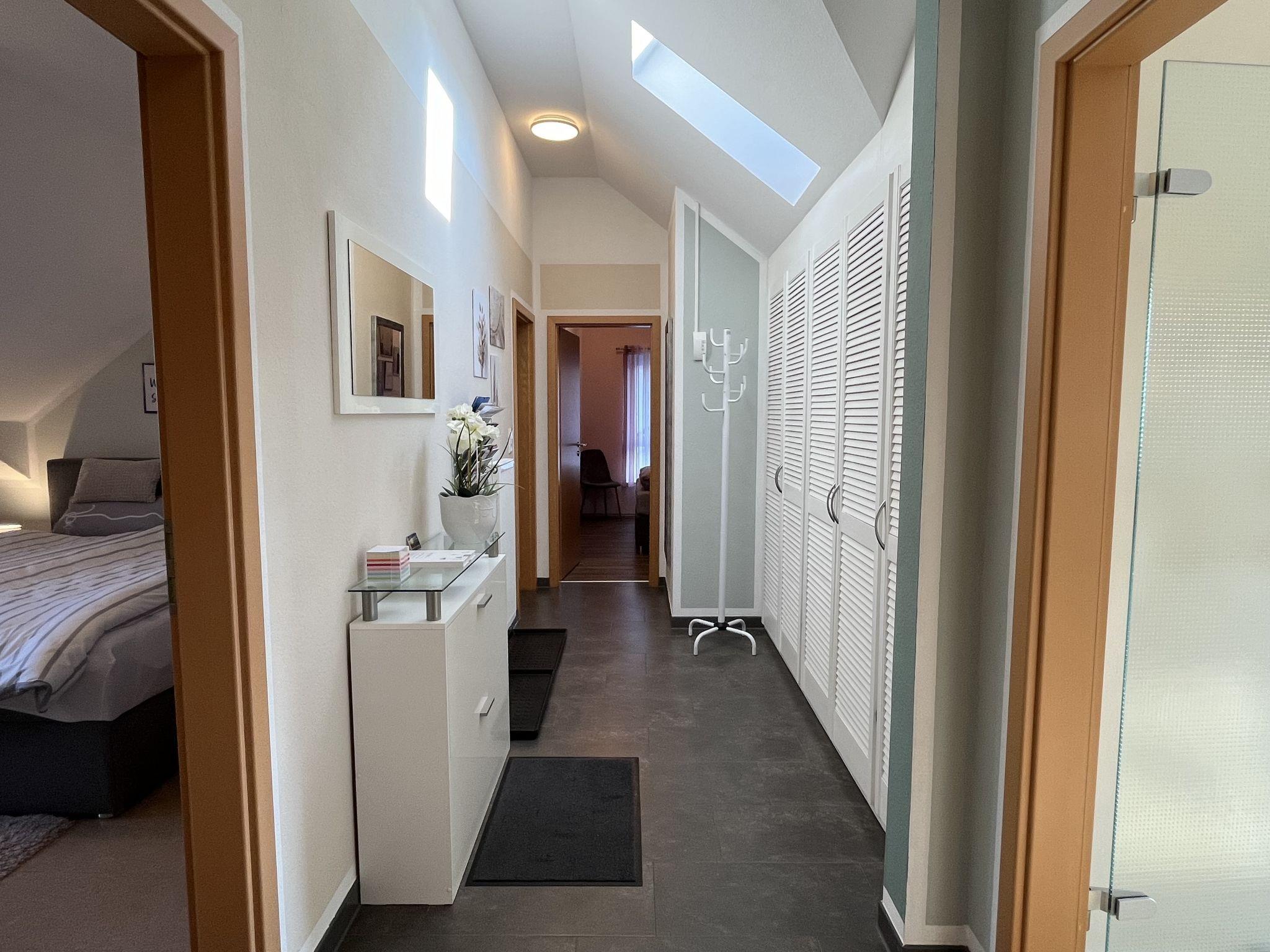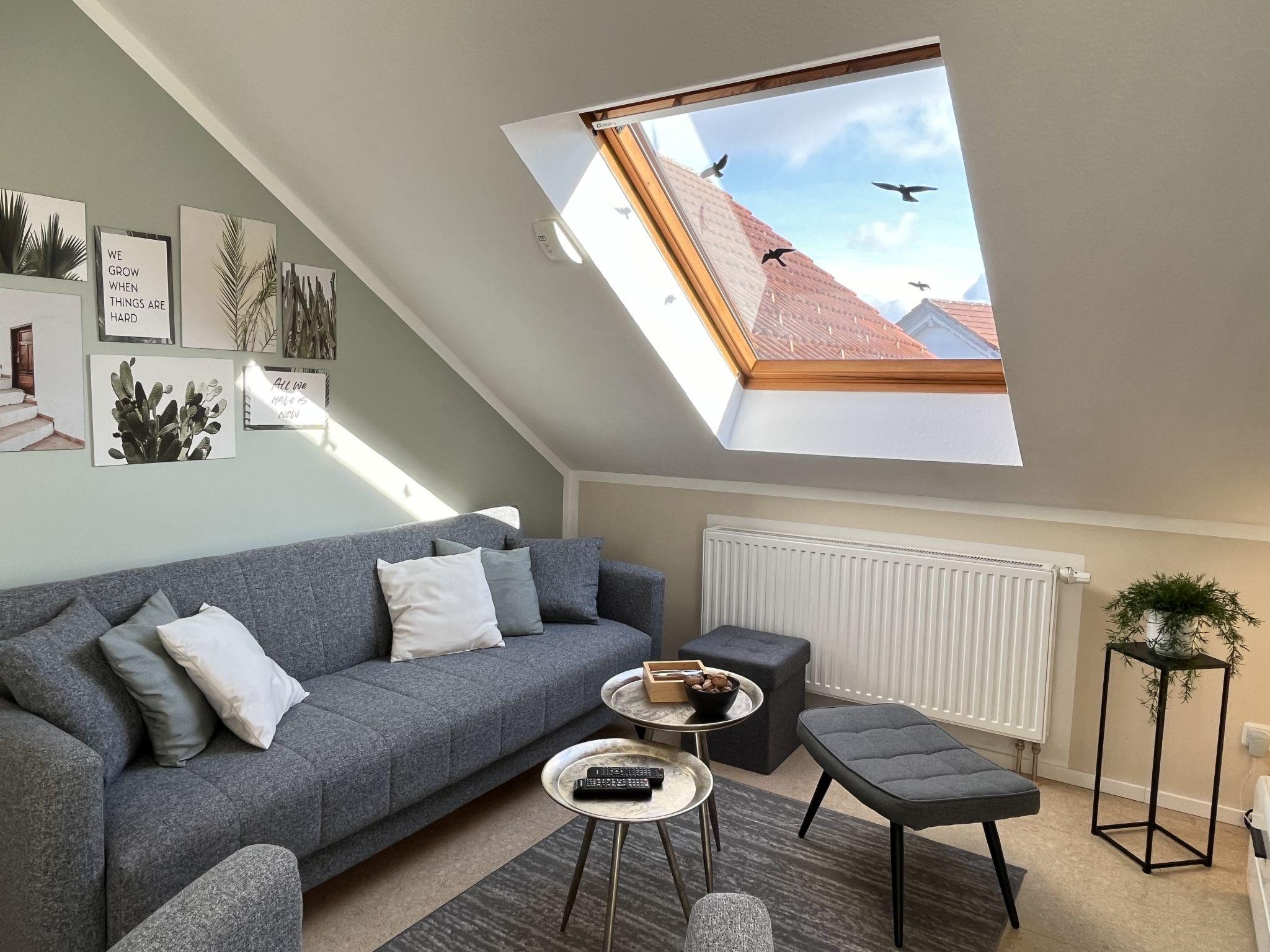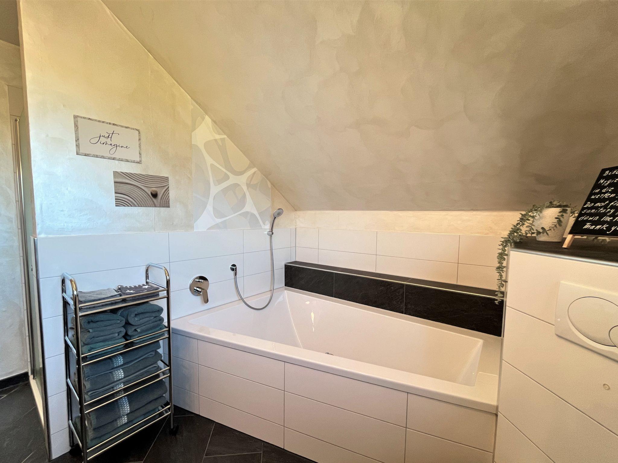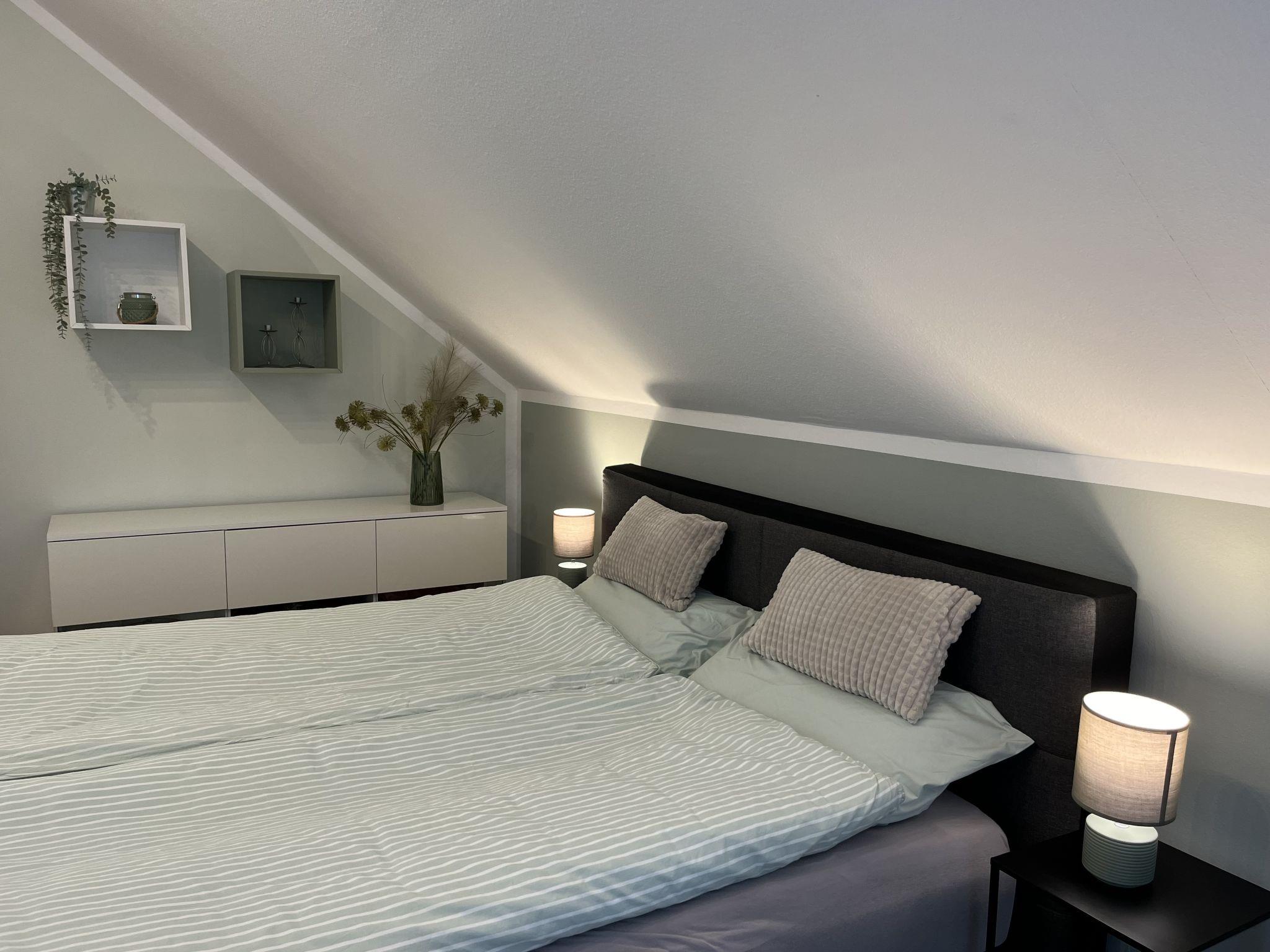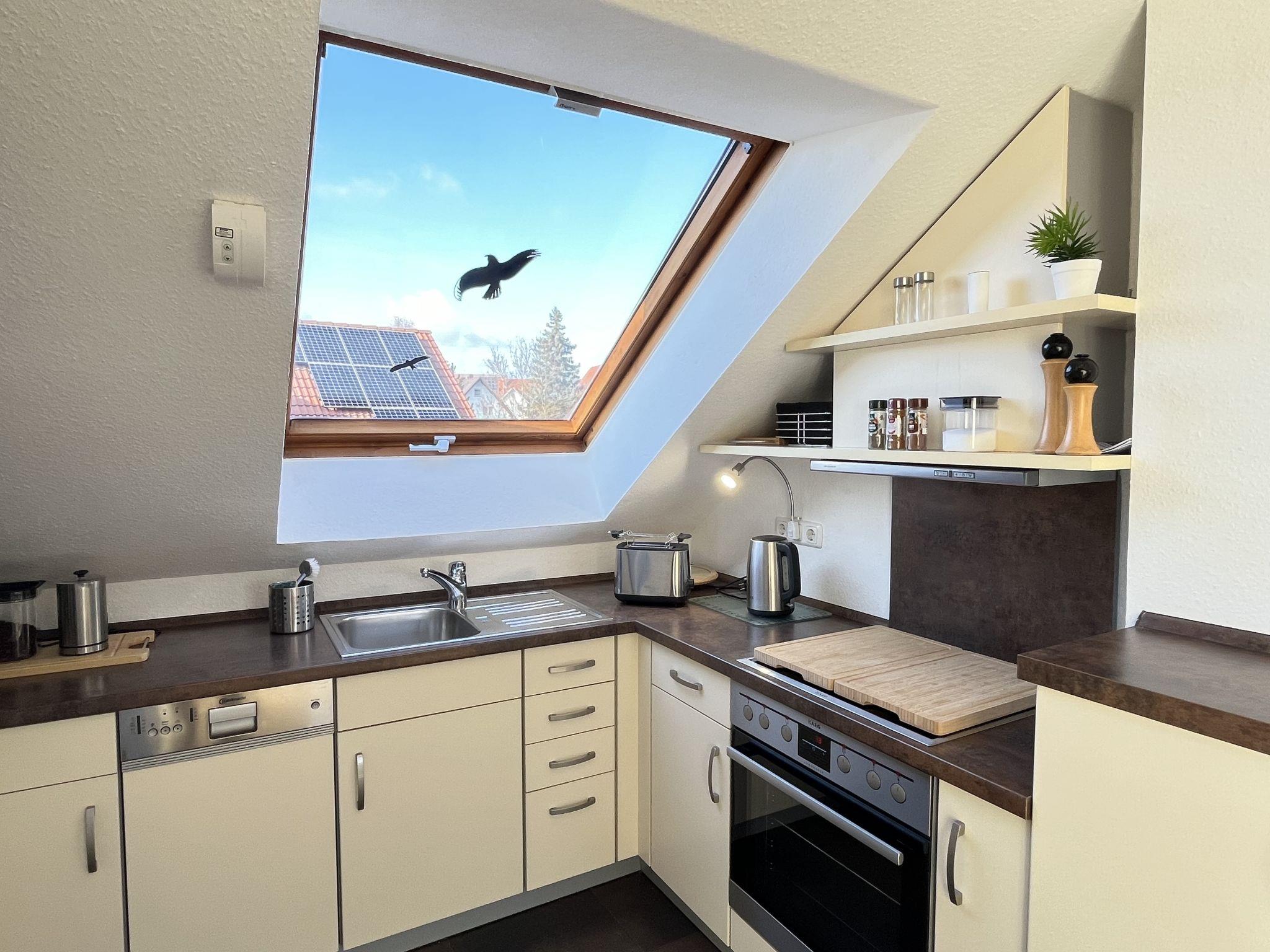 4-room apartment 90 m2, on the top floor. Spacious and bright, partly with sloping ceilings, fully renovated in 2023, very beautiful and tasteful furnishings: living/dining room with dining table and satellite TV (flat screen), radio, CD-player and hi-fi system. Exit to the balcony. 3 double bedrooms, each room with 1 double bed (180 cm, length 200 cm). Open kitchen (oven, dishwasher, 4 ceramic glass hob hotplates, toaster, kettle, microwave, electric coffee machine). Bath/shower/WC with corner bath. Heating. Balcony, south facing position, patio. Terrace furniture, balcony furniture, barbecue (portable). Marvellous view of the countryside. Facilities: iron, children's high chair, baby cot (extra), hair dryer. Internet (WiFi, free). Parking (2 cars) at the house. Please note: non-smokers only. Smoke alarm, fire extinguisher.