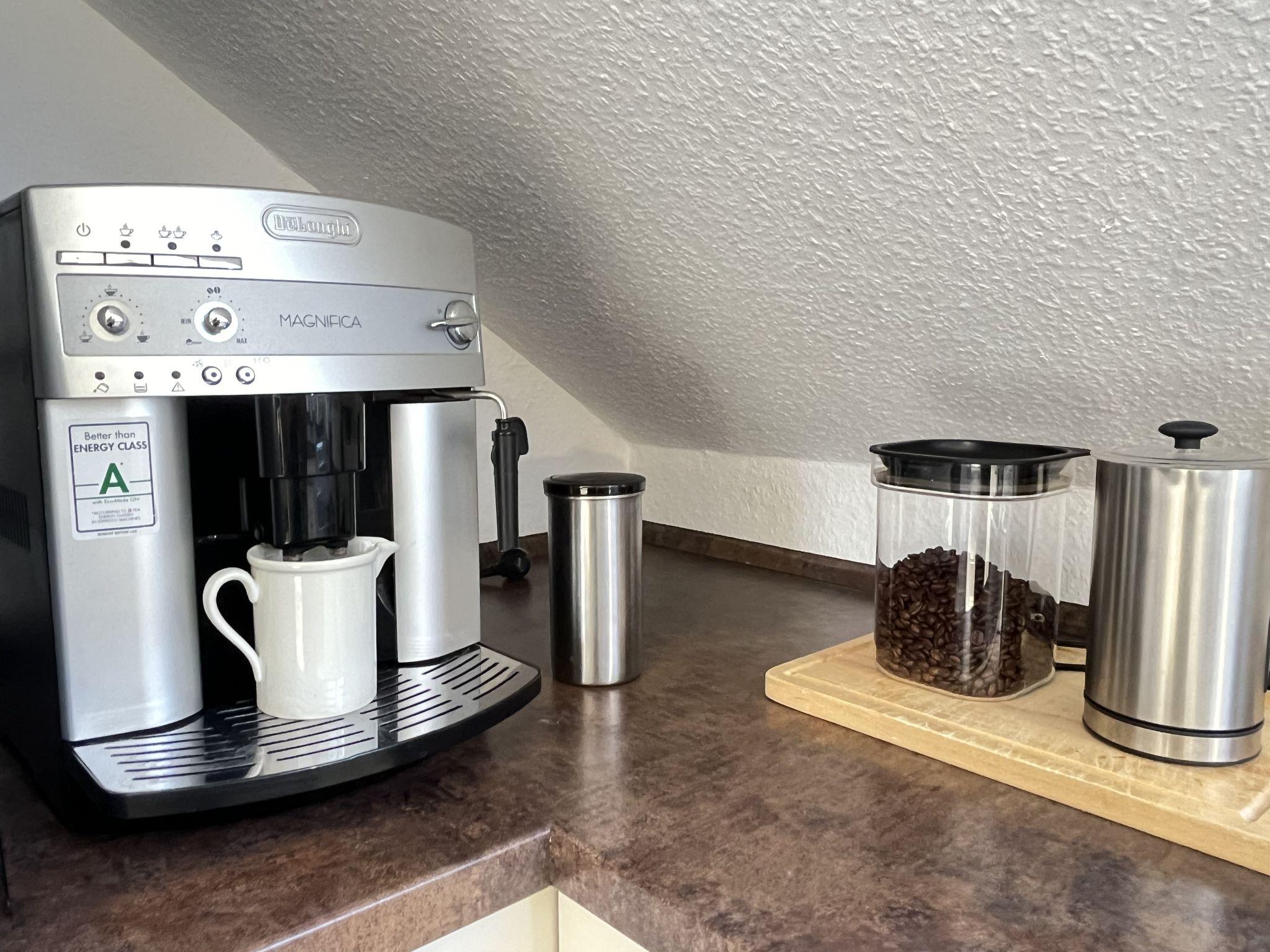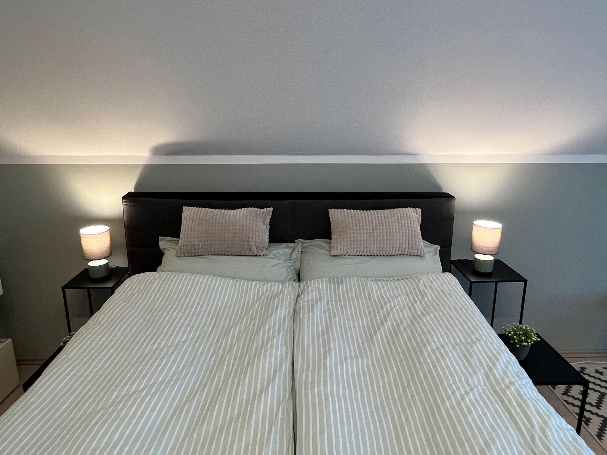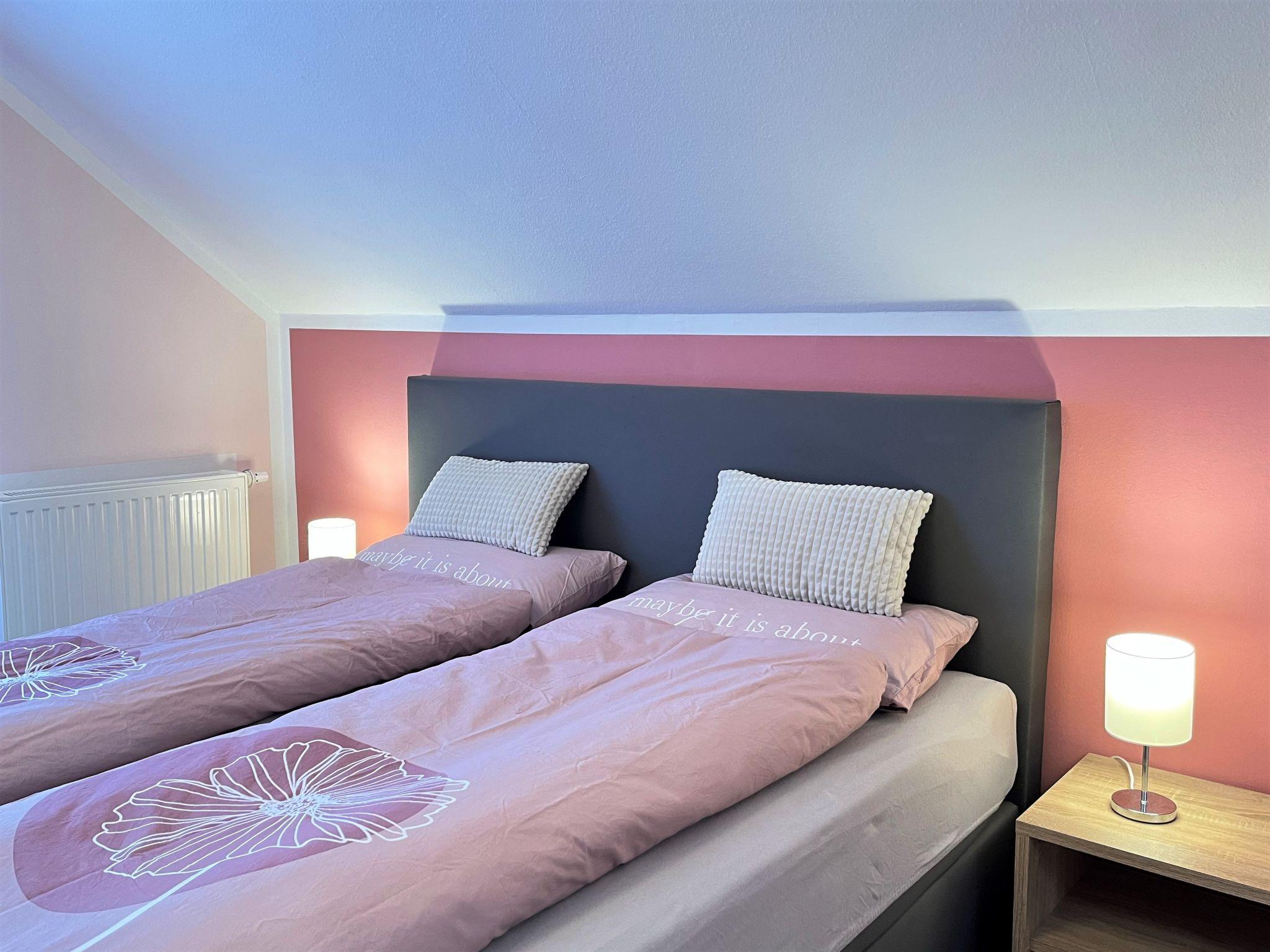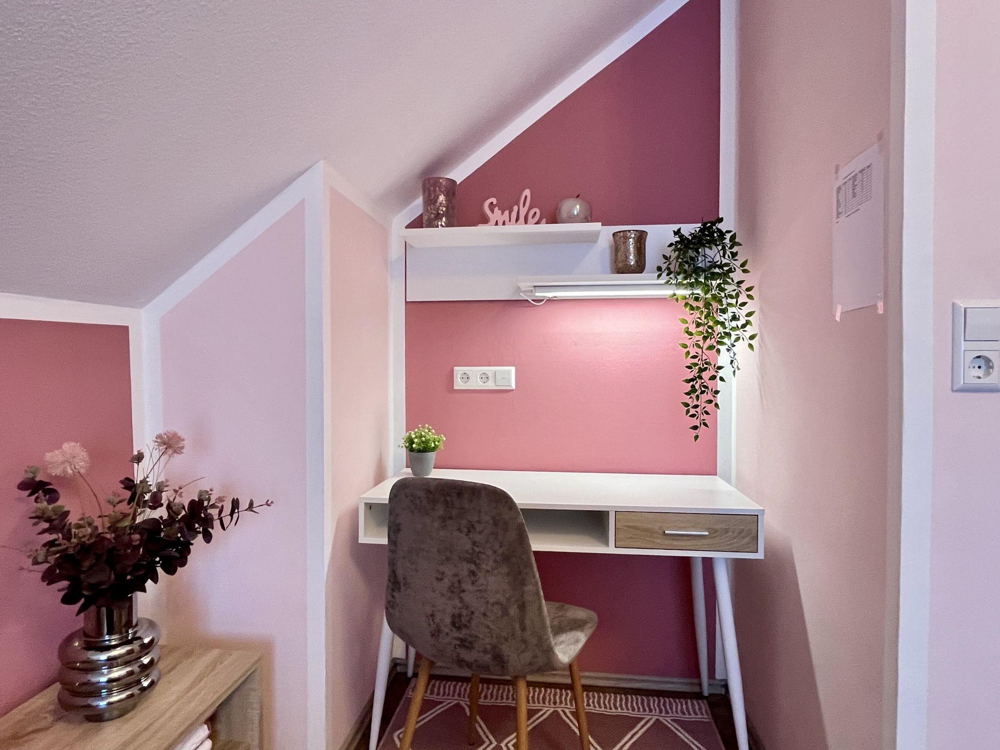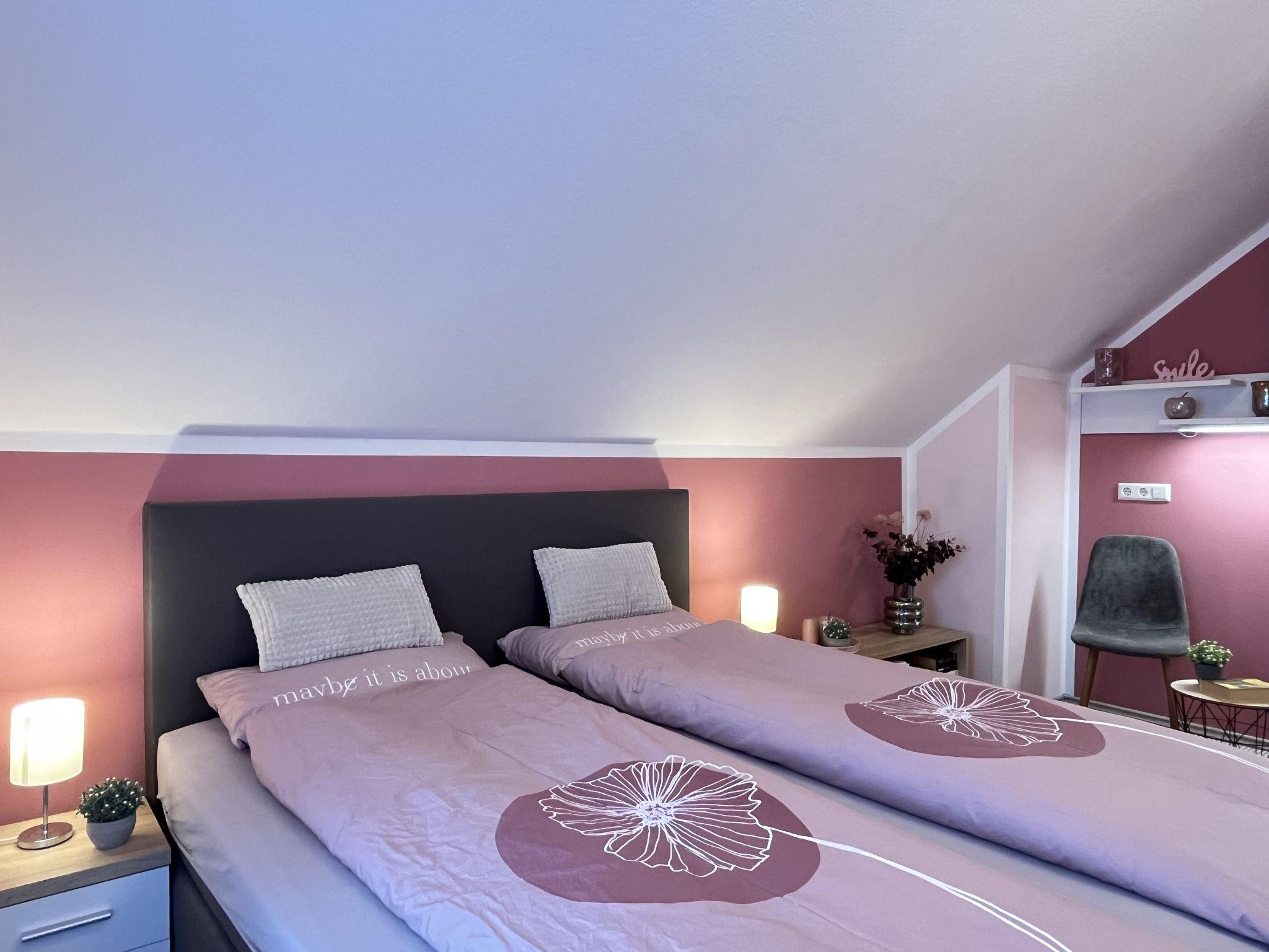 4-room apartment 90 m2, on the top floor. Spacious and bright, partly with sloping ceilings, fully renovated in 2023, very beautiful and tasteful furnishings: living/dining room with dining table and satellite TV (flat screen), radio, CD-player and hi-fi system. Exit to the balcony. 3 double bedrooms, each room with 1 double bed (180 cm, length 200 cm). Open kitchen (oven, dishwasher, 4 ceramic glass hob hotplates, toaster, kettle, microwave, electric coffee machine). Bath/shower/WC with corner bath. Heating. Balcony, south facing position, patio. Terrace furniture, balcony furniture, barbecue (portable). Marvellous view of the countryside. Facilities: iron, children's high chair, baby cot (extra), hair dryer. Internet (WiFi, free). Parking (2 cars) at the house. Please note: non-smokers only. Smoke alarm, fire extinguisher.