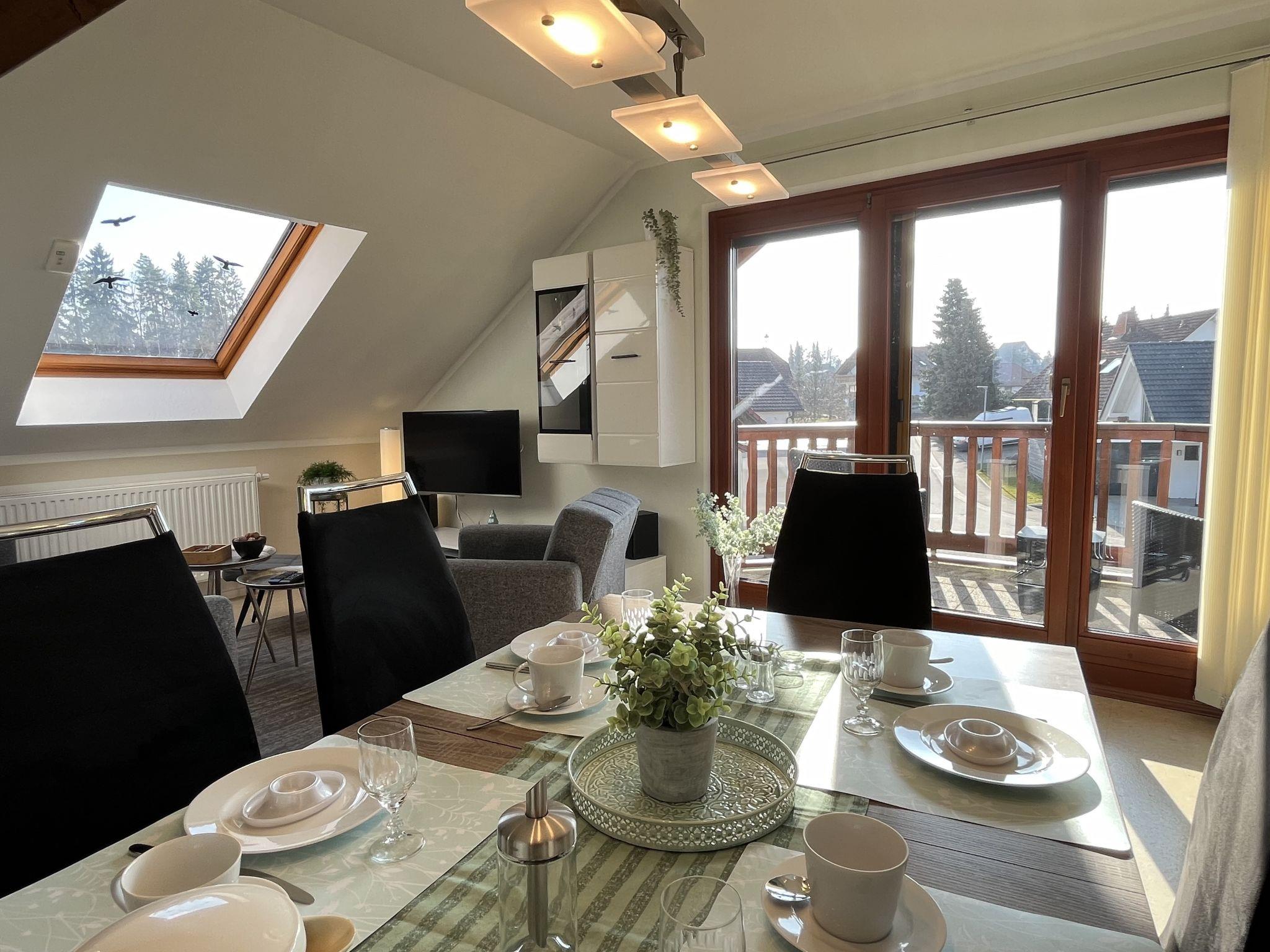 Dittishausen 45 km from Freiburg: Modern, beautiful, comfortable 2-family house "Haus an der Sonne", 2 storeys. 600 m from the centre, in a quiet, sunny position in the residential district, 250 m from the edge of the forest. In the house: storage room for skis. Parking (for 2 cars) on the premises. Bus stop "Rathaus" 500 m, railway station "Löffingen" 5 km. Please note: baby equipment on request (extra). The owner lives in the same residence.