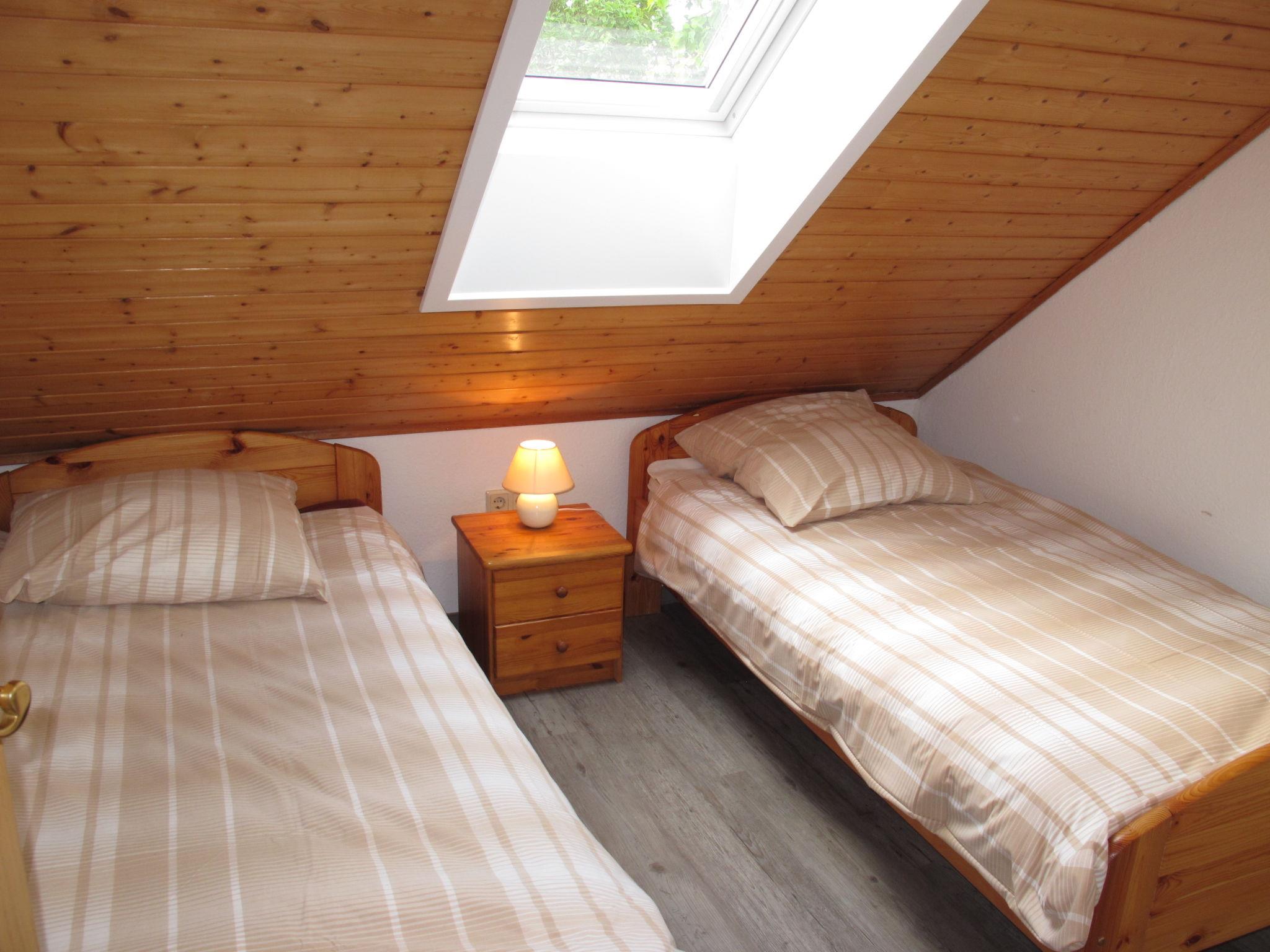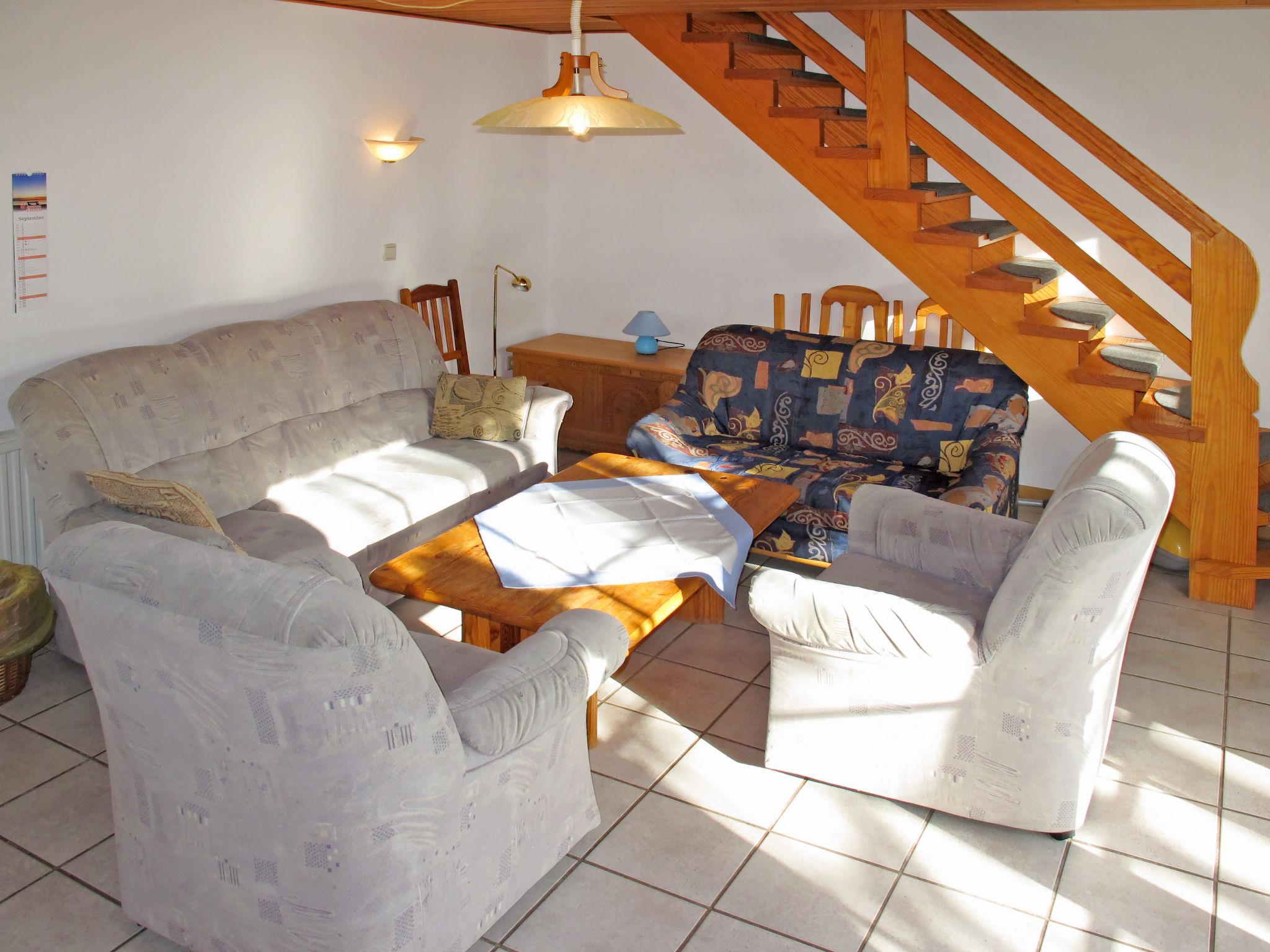 5-room semi-detached house 85 m2 on 2 levels, on the ground floor. Cosy furnishings: living/dining room with satellite TV (flat screen), DVD. Exit to the terrace. 1 room with 1 double bed (2 x 90 cm, length 200 cm). Kitchenette (4 ceramic glass hob hotplates, toaster, kettle, freezer, electric coffee machine, combination microwave). Shower/WC, double hand-basin. Upper floor: 2 rooms with sloping ceilings, each room with 2 beds (90 cm, length 200 cm). 1 room with sloping ceilings, without window with 1 bed (90 cm, length 200 cm). Shower/WC. Terrace. Terrace furniture, deck chairs (2). Facilities: washing machine. Internet (WiFi, free). Please note: non-smokers only. Maximum 1 pet/ dog allowed. Smoke alarm. Bookings accepted for holiday purposes only.