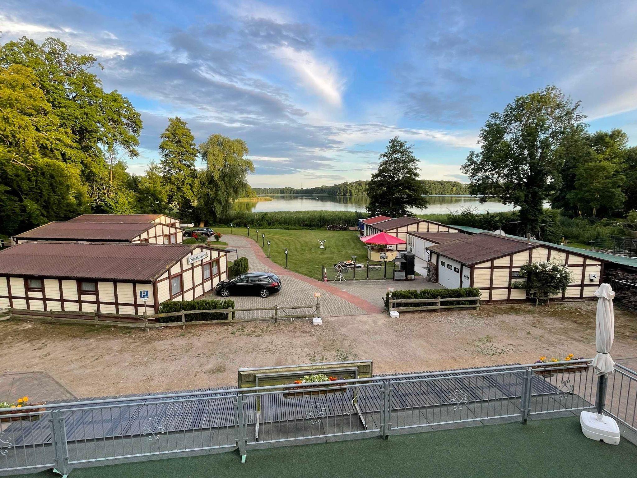 Die FH auf der Insel massiv gebaut (Klimahäuser), Blick auf den Dobbertiner See jeweils eigenem Parkplatz und Terrasse zum See, südseite.